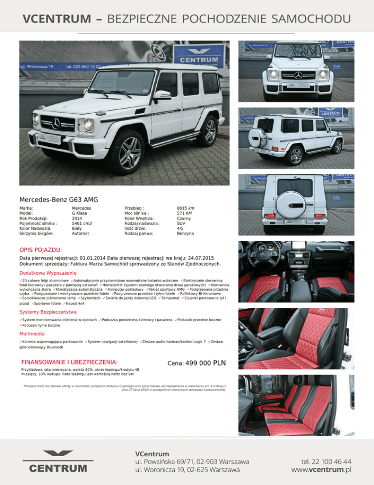 Mercedes-Benz G63 AMG Marka: Model: Rok Produkcji: Pojemność silnika : Kolor Nadwozia: Skrzynia biegów: Mercedes G Klasa 2014 5461 cm3 Biały Automat Przebieg : Moc silnika : Kolor Wnętrza: Rodzaj nadwozia: Ilość drzwi: Rodzaj paliwa: 8015 km 571 KM Czarny SUV 4/5 Benzyna OPIS POJAZDU: Data pierwszej rejestracji: 01.01.2014 Data pierwszej rejestracji we kraju: 24.07.2015 Dokument sprzedaży: Faktura Marża Samochód sprowadzony ze Stanów Zjednoczonych. Dodatkowe Wyposażenie ✓20-calowe felgi aluminiowe ✓Automatycznie przyciemniane wewnętrzne lusterko wsteczne ✓Elektrycznie sterowany fotel kierowcy i pasażera z pamięcią ustawień ✓HomeLink® (system zdalnego otwierania drzwi garażowych) ✓Kierownica wykończona skórą ✓Klimatyzacja automatyczna ✓Komputer pokładowy ✓Pakiet sportowy AMG ✓Podgrzewana przednia szyba ✓Podgrzewane i wentylowane przednie fotele ✓Podgrzewane przednie i tylne fotele ✓Reflektory Bi-Xenonowe ✓Spryskiwacze ciśnieniowe lamp ✓Szyberdach ✓Światła do jazdy dziennej LED ✓Tempomat ✓Czujniki parkowania tył i przód ✓Sportowe fotele ✓Napęd 4x4 Systemy Bezpieczeństwa ✓System monitorowania ciśnienia w oponach ✓Poduszka powietrzna kierowcy i pasażera ✓Poduszki przednie boczne ✓Poduszki tylne boczne Multimedia ✓Kamera wspomagająca parkowanie ✓System nawigacji satelitarnej ✓Zestaw audio harman/kardon Logic 7 ✓Zestaw głośnomówiący Bluetooth FINANSOWANIE I UBEZPIECZENIA: Cena: 499 000 PLN Przykładowa rata miesięczna, wpłata 20%, okres leasingu/kredytu 48 miesięcy, 10% wykupu. Rata leasingu jest wartością netto bez vat. Niniejsza treść nie stanowi oferty w rozumieniu przepisów Kodeksu Cywilnego oraz opisu towaru ani zapewnienia w rozumieniu art. 4 Ustawy z dnia 27 lipca 2002r o szczególnych warunkach sprzedaży konsumenckiej. Powered by TCPDF (www.tcpdf.org)