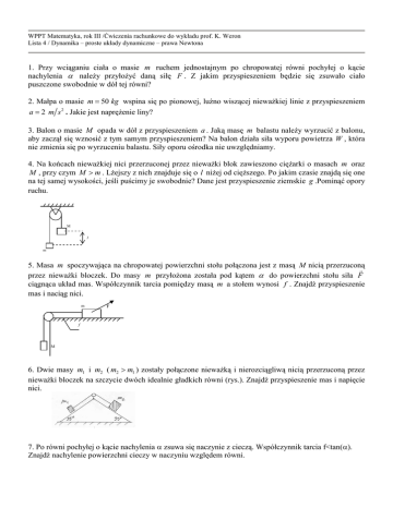 WPPT Matematyka, rok III /Ćwiczenia rachunkowe do wykładu prof. K. Weron Lista 4 / Dynamika – proste układy dynamiczne – prawa Newtona 1. Przy wciąganiu ciała o masie m ruchem jednostajnym po chropowatej równi pochyłej o kącie nachylenia α naleŜy przyłoŜyć daną siłę F . Z jakim przyspieszeniem będzie się zsuwało ciało puszczone swobodnie w dół tej równi? 2. Małpa o masie m = 50 kg wspina się po pionowej, luźno wiszącej niewaŜkiej linie z przyspieszeniem a = 2 m s 2 . Jakie jest napręŜenie liny? 3. Balon o masie M opada w dół z przyspieszeniem a . Jaką masę m balastu naleŜy wyrzucić z balonu, aby zaczął się wznosić z tym samym przyspieszeniem? Na balon działa siła wyporu powietrza W , która nie zmienia się po wyrzuceniu balastu. Siły oporu ośrodka nie uwzględniamy. 4. Na końcach niewaŜkiej nici przerzuconej przez niewaŜki blok zawieszono cięŜarki o masach m oraz M , przy czym M > m . LŜejszy z nich znajduje się o l niŜej od cięŜszego. Po jakim czasie znajdą się one na tej samej wysokości, jeśli puścimy je swobodnie? Dane jest przyspieszenie ziemskie g .Pominąć opory ruchu. M 1 m 5. Masa m spoczywająca na chropowatej powierzchni stołu połączona jest z masą M nicią przerzuconą r przez niewaŜki bloczek. Do masy m przyłoŜona została pod kątem α do powierzchni stołu siła F ciągnąca układ mas. Współczynnik tarcia pomiędzy masą m a stołem wynosi f . Znajdź przyspieszenie mas i naciąg nici. m F f M 6. Dwie masy m1 i m2 ( m2 > m1 ) zostały połączone niewaŜką i nierozciągliwą nicią przerzuconą przez niewaŜki bloczek na szczycie dwóch idealnie gładkich równi (rys.). Znajdź przyspieszenie mas i napięcie nici. 7. Po równi pochyłej o kącie nachylenia α zsuwa się naczynie z cieczą. Współczynnik tarcia f<tan(α). Znajdź nachylenie powierzchni cieczy w naczyniu względem równi.
