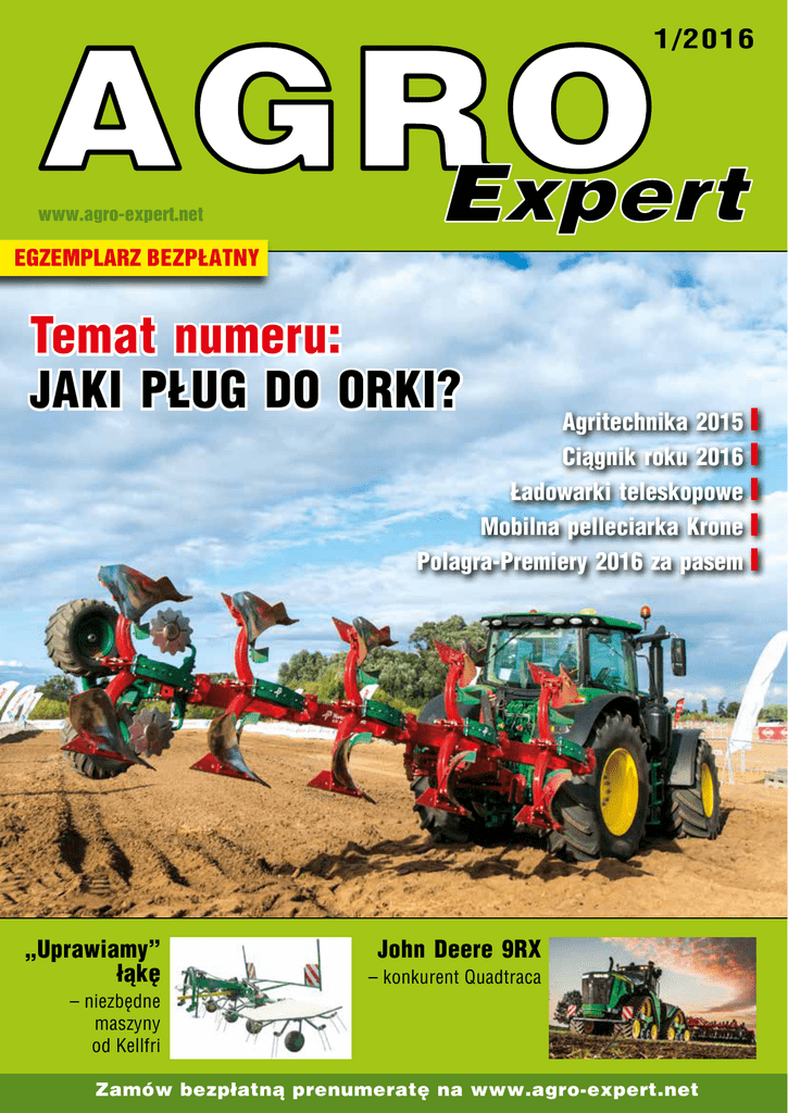 1/2016 www.agro-expert.net EGZEMPLARZ BEZPŁATNY Temat numeru: JAKI PŁUG DO ORKI? Agritechnika 2015 Ciągnik roku 2016 Ładowarki teleskopowe Mobilna pelleciarka Krone Polagra-Premiery 2016 za pasem „Uprawiamy” łąkę John Deere 9RX – konkurent Quadtraca – niezbędne maszyny od Kellfri Zamów bezpłatną prenumeratę na www.agro-expert.net Nasze czasopisma w rękach profesjonalistów KMG media KMG Media Sp. z o.o. ul. L. Staffa 31, 01-884 Warszawa tel. 22 213 88 28 fax. 22 205 07 57 www.kmg-media.pl Truck&Van www.truck-van.pl Bioentuzjazm Spis treści 1/2016 Jego wysokość Fendt drowe odżywanie nie jest chwilową modą, ale coraz silniejszym trendem – wynika z badania przeprowadzonego przez Ośrodek Ewaluacji. Polacy chcą jeść zdrowo i odpowiedzialnie, dlatego coraz częściej wybierają żywność nieprzetworzoną, bez konserwantów i chemicznych dodatków. Czemu więc nie przerzucić się na ekologiczną produkcję „bio”? Szybki rozwój rolnictwa ekologicznego znajduje odzwierciedlenie we wzroście podaży jego wysokojakościowych produktów. W Polsce w 2002 r. udział rolnictwa bio w całkowitej powierzchni upraw rolnych wynosił zaledwie 0,3%, podczas gdy średnia w państwach „starej unii” wynosiła 3,3%. Obecnie udział ten wzrósł do 3,9%. W 2004 r. było u nas 3760 gospodarstw ekologicznych, a pod koniec 2014 r. liczba ta wzrosła do 25 613. Niestety tendencja wzrostowa już zatrzymała się. Konsumenci skłaniający się ku produktom bio chcą kupować je coraz taniej, choć akceptują wyższą cenę niż za produkty, które nie zostały wytworzone tradycyjnymi metodami. Aż dla 75% ankietowanych ważna jest cena produktu ekologicznego. Konsumenci nie są jednak skłonni wyrównywać dochodów gospodarstw ekologicznych przez akceptację jeszcze wyższych cen produktów bio. Wynika z tego, że bez wsparcia ze strony budżetu czy Unii, przynajmniej przy obecnie występujących różnicach cen produktów bio i konwencjonalnych, nie można liczyć na dalszy rozwój rolnictwa ekologicznego. Pocieszające jest jednak to, że rolnicy produkujący ekologicznie do 2020 r. w ramach PROW mają zapewnione większe dopłaty unijne niż było to w latach 2007-2013. Wynoszą one 966 zł/ha dla upraw rolniczych, 1557 zł/ha dla upraw warzywnych oraz 1882 zł/ha dla upraw sadowniczych w okresie konwersji. Po okresie konwersji dopłaty wyniosą odpowiednio 792, 1310 oraz 1501 zł/ha. Nastąpiły też dobre zmiany w zakresie degresywności i limitów powierzchniowych upraw ekologicznych. Może dzięki temu poprawią się morale rolników w zakresie inwestowania także w nowy sprzęt. Stosowanie innowacyjnych maszyn i urządzeń pozwala na zmniejszenie zużycia zasobów naturalnych i przyjazną dla środowiska produkcję surowców. Coś w tym jest na rzeczy, bo za nami największa w Europie wystawa rolnicza Agritechnika 2015, a na niej „oczopląs” maszyn ekologicznych, ekonomicznych i coraz bardziej wydajnych. Zapraszam do lektury Agro Experta, gdzie praktycznie na każdej ze stron odnaleźć można nowości z tej wystawy. Michał Mariański redaktor prowadzący Czasopismo AGRO Expert – ul. L. Staffa 31, 01-884 Warszawa tel. 22 213 88 28, fax 22 205 07 57 [email protected], www.agro-expert.net Wydawca Mirosław Ganiec tel. 502 532 575, [email protected] Redaktor prowadzący Michał Mariański tel. 501 082 635, [email protected] Nakład 8 000 egzemplarzy Najlepszy ciągnik roku 2016................. 4 Docenieni Pozostali zwycięzcy konkursu TOTY...... 6 Drogowskaz branży Nowości z wystawy Agritechnika 2015................................. 8 Przyziemne sprawy Temat numeru: Jaki pług do orki?...... 12 Bardziej zielona Maszyny Kellfri do pracy na łąkach.... 22 Zielony gigant Największe ciągniki John Deere serii 9RX......................... 24 Miara innowacji Nowości w gamie ładowarek Manitou............................................... 26 Bambini Italiani Dział reklamy i marketingu Remigiusz Romaniuk – tel. 501 155 170, [email protected] Kamil Zjawiński – tel. 505 403 220, [email protected] Jarosław Dynek – tel. 694 725 118, [email protected] Krystyna Koch – tel. 515 444 589, [email protected] Marcin Marczuk – tel. 513 432 305, [email protected] Przygotowanie do druku Studio 2000 Robert Lipski Prenumerata tel. 22 213 88 28, fax 22 205 07 57 Wydawnictwo [email protected] KMG Media Sp. z o.o. ul. L. Staffa 31, 01-884 Warszawa Redakcja i współpraca Mirosław Ganiec, Michał Kij, Katarzyna Dziewicka, NIP: 522 294 09 47, REGON: 142231181, KRS: 0000348328 Władysław Wilkiel, Konrad Kułak, Michał Tarnowski Sąd Rejonowy dla m. st. Warszawy, XIII Wydział Gospodarczy KRS Redakcja nie odpowiada za treść reklam i ogłoszeń. Redakcja zastrzega sobie prawo do redagowania i skracania tekstów. Hybrydowe Merlo i nie tylko............... 28 Prosto z pokosu Rewelacyjne narzędzie Krone do produkcji pelletu............................ 29 Uczesać pole SaMASZ zaoferował zgrabiarkę grzebieniową...................................... 29 Poznaj nasze wszystkie aktywności: Truck&Van www.truck-van.pl www.kmg-media.pl Katalogis net POLAGRA-PREMIERY – maszynowe nowości z całego świata................................... 30 www.agro-expert.net 3 1/2016 Jego wysokość Fendt Bieżący rok upłynie nam pod znakiem modelu Fendt 1050 Vario. Nadawany od 1998 r. tytuł Tractor of the Year (ciągnik roku) to najbardziej cenione wyróżnienie przyznawane w rolnictwie. Niemiecka marka zdobyła go już po raz 5. To największa liczba zwycięstw w tej prestiżowej rywalizacji. odele serii 1000 to całkowicie nowa konstrukcja Fendta. Prototypowe egzemplarze zaprezentowano w kwietniu 2014 r., a seryjna produkcja ruszyła w ostatnim kwartale 2015 r. Cała gama obejmuje 4 modele maszyn: 1038 (380 KM), 1042 (420 KM), 1046 (460 KM) oraz flagowy model 1050 (500 KM). Ten ostatni to pierwszy na świecie ciągnik rolniczy, który przy konwencyjnej konstrukcji osiąga moc 500 KM.