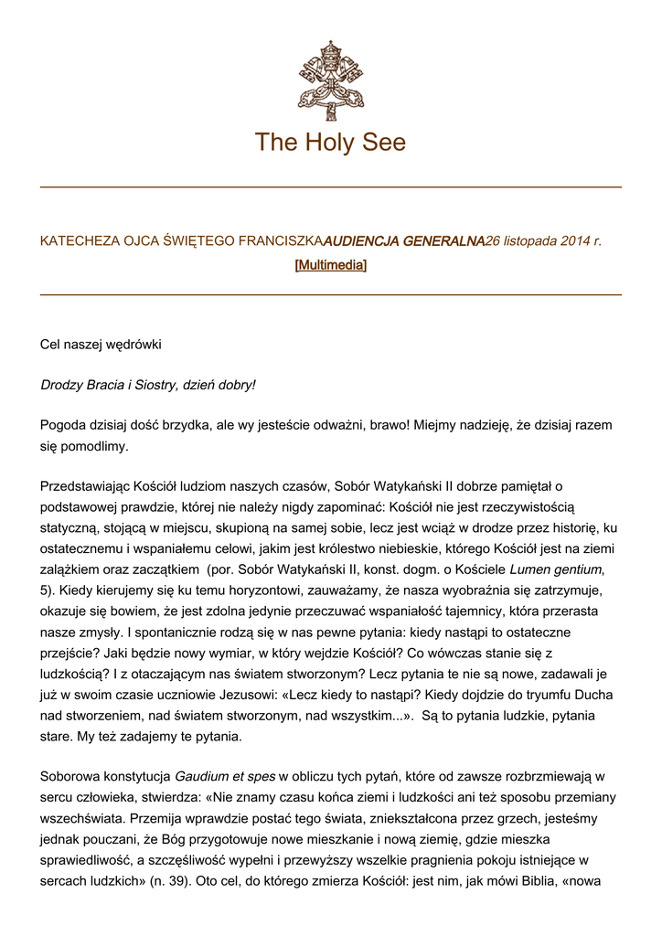 The Holy See KATECHEZA OJCA ŚWIĘTEGO FRANCISZKAAUDIENCJA GENERALNA26 listopada 2014 r. [Multimedia] Cel naszej wędrówki Drodzy Bracia i Siostry, dzień dobry! Pogoda dzisiaj dość brzydka, ale wy jesteście odważni, brawo! Miejmy nadzieję, że dzisiaj razem się pomodlimy. Przedstawiając Kościół ludziom naszych czasów, Sobór Watykański II dobrze pamiętał o podstawowej prawdzie, której nie należy nigdy zapominać: Kościół nie jest rzeczywistością statyczną, stojącą w miejscu, skupioną na samej sobie, lecz jest wciąż w drodze przez historię, ku ostatecznemu i wspaniałemu celowi, jakim jest królestwo niebieskie, którego Kościół jest na ziemi zalążkiem oraz zaczątkiem (por. Sobór Watykański II, konst. dogm. o Kościele Lumen gentium, 5). Kiedy kierujemy się ku temu horyzontowi, zauważamy, że nasza wyobraźnia się zatrzymuje, okazuje się bowiem, że jest zdolna jedynie przeczuwać wspaniałość tajemnicy, która przerasta nasze zmysły. I spontanicznie rodzą się w nas pewne pytania: kiedy nastąpi to ostateczne przejście? Jaki będzie nowy wymiar, w który wejdzie Kościół? Co wówczas stanie się z ludzkością? I z otaczającym nas światem stworzonym? Lecz pytania te nie są nowe, zadawali je już w swoim czasie uczniowie Jezusowi: «Lecz kiedy to nastąpi? Kiedy dojdzie do tryumfu Ducha nad stworzeniem, nad światem stworzonym, nad wszystkim...». Są to pytania ludzkie, pytania stare. My też zadajemy te pytania. Soborowa konstytucja Gaudium et spes w obliczu tych pytań, które od zawsze rozbrzmiewają w sercu człowieka, stwierdza: «Nie znamy czasu końca ziemi i ludzkości ani też sposobu przemiany wszechświata. Przemija wprawdzie postać tego świata, zniekształcona przez grzech, jesteśmy jednak pouczani, że Bóg przygotowuje nowe mieszkanie i nową ziemię, gdzie mieszka sprawiedliwość, a szczęśliwość wypełni i przewyższy wszelkie pragnienia pokoju istniejące w sercach ludzkich» (n. 39). Oto cel, do którego zmierza Kościół: jest nim, jak mówi Biblia, «nowa 2 Jerozolima», «Raj». Bardziej niż miejsce jest to «stan» duszy, w którym nasze najgłębsze oczekiwania będą spełnione w sposób przeobfity, a nasz byt, jako stworzeń i dzieci Bożych, osiągnie pełną dojrzałość. Będziemy nareszcie przyobleczeni w radość, w pokój i w miłość Boga w sposób całkowity, bez żadnych ograniczeń, i znajdziemy się twarzą w twarz z Nim! (por. 1 Kor 13, 12). Pięknie jest o tym myśleć, myśleć o niebie. Wszyscy się tam znajdziemy, wszyscy. To jest piękne, daje duszy siłę. W tej perspektywie pięknie jest dostrzec, że istnieje zasadnicza ciągłość i komunia między Kościołem, który jest w niebie, i tym, który jest jeszcze w drodze na ziemi. Ci, którzy już żyją przed obliczem Boga, mogą bowiem nas wspierać i wstawiać się za nami, modlić się za nas. Z drugiej strony, my również jesteśmy wciąż zachęcani, by ofiarowywać dobre uczynki, modlitwy i Eucharystię, aby ulżyć udrękom dusz, które oczekują jeszcze na szczęśliwość bez końca. Tak, bo w perspektywie chrześcijańskiej rozróżnienia dokonuje się już nie między tym, kto jest już martwy, a kto jeszcze nie, lecz między tym, kto jest w Chrystusie, a tym kto nie jest! To jest determinujący element, naprawdę decydujący dla naszego zbawienia i dla naszego szczęścia. Jednocześnie Pismo Święte uczy nas, że wypełnienie się tego wspaniałego zamysłu nie może nie obejmować również tego wszystkiego, co nas otacza i co zrodziło się z zamysłu i z serca Boga. Apostoł Paweł stwierdza to w sposób wyraźny, kiedy mówi, że «również stworzenie zostanie wyzwolone z niewoli zepsucia, by uczestniczyć w wolności i chwale dzieci Bożych» (por. Rz 8, 21). W innych tekstach używa się obrazu «nowego nieba» i «nowej ziemi» (por. 2 P 3, 13; Ap 21, 1), w tym sensie, że cały wszechświat będzie odnowiony i zostanie wyzwolony raz na zawsze od wszelkich śladów zła i nawet od śmierci. Tym, co się zarysowuje jako dopełnienie się przemiany, która w rzeczywistości już trwa, począwszy od śmierci i zmartwychwstania Chrystusa, jest zatem nowe stworzenie; a więc nie unicestwienie wszechświata i tego wszystkiego, co nas otacza, lecz doprowadzenie każdej rzeczy do pełni bytu, prawdy, piękna. Taki jest zamysł, który Bóg, Ojciec, Syn i Duch Święty, od zawsze chce zrealizować i już realizuje. Drodzy przyjaciele, kiedy myślimy o tej wspaniałej rzeczywistości, która nas czeka, zdajemy sobie sprawę z tego, że przynależność do Kościoła jest naprawdę cudownym darem, w który wpisane jest wzniosłe powołanie! Prośmy zatem Maryję Pannę, Matkę Kościoła, by zawsze czuwała nad naszą wędrówką i by pomagała nam być tak jak Ona radosnym znakiem ufności i nadziei wśród naszych braci. Do Polaków: Drodzy Polacy, bracia i siostry, uroczystość Jezusa Chrystusa Króla Wszechświata przypomniała nam, że wraz z całą wspólnotą Kościoła zdążamy do «nowego nieba» i «nowej ziemi». Nich nasze życie będzie świadectwem, że w perspektywie tych rzeczywistości już tu na ziemi w naszych sercach wzrasta królestwo prawdy, sprawiedliwości, miłości i pokoju. Niech wszystkich buduje nasza ufność pokładana w Bogu i nadzieja. Z serca wam błogosławię. 3 © Copyright - Libreria Editrice Vaticana