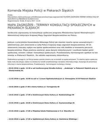 Komenda Miejska Policji w Piekarach Śląskich Źródło: http://piekary.slaska.policja.gov.pl/k18/bezpieczenstwo/mapa-zagrozen/162726,MAPA-ZAGROZEN-TERMINY-KONSULTACJI-SP OLECZNYCH-w-PIEKARACH-SLASKICH.html Wygenerowano: Środa, 8 marca 2017, 11:22 MAPA ZAGROŻEŃ - TERMINY KONSULTACJI SPOŁECZNYCH w PIEKARACH ŚLĄSKICH Serdecznie zapraszamy na konsultacje społeczne programu Ministerstwa Spraw Wewnętrznych i Administracji dotyczące Krajowej Mapy Zagrożeń Bezpieczeństwa we Polsce. Jednym z priorytetów Komendanta Głównego Policji jak również resortu spraw wewnętrznych i administracji, jest utworzenie w całej Polsce krajowej mapy zagrożeń bezpieczeństwa. W ich utworzeniu znaczący wpływ ma opinia społeczeństwa oraz rola mediów w kreowaniu poczucia bezpieczeństwa. Mapa powinna zawierać, poza danymi statystycznymi i wynikami badań opinii społecznej, wnioski z debat i konsultacji społecznych. Przedstawiamy harmonogram spotkań na ten miesiąc w Piekarach Śląskich . Do udziału zapraszamy dziennikarzy. Podkreślenia wymaga to, że Policja bardzo szeroko otwiera się na kontakt ze społeczeństwem. To właśnie opinie społeczne będą miały decydujący wpływ na ostateczny kształt projektowanego narzędzia informatycznego, służącego do prezentacji informacji o stanie bezpieczeństwa. Przedstawiamy harmonogram na bieżący miesiąc: ● 09.02.2016r o godz. 13.30 w sali konferencyjnej Ośrodka Kultury ,,Andaluzja" w Piekarach Śląskich przy ul. Oświęcimskiej 45. ● 11.02.2016r o godz. 10.00 na auli w I Liceum Ogólnokształcącym ul. Gimnazjalna 24 W Piekarach Śląskich ● 16.02.2016r o godz 17.00 w Domu Kultury ul. Tarnogórska 49 ● 18.02.2016r o godz. 17.00 w Dzielnicowym Domu Kultury ul. Roździeńskiego 99 ● 22.02.2016r o godz. 18.00 w Dzielnicowym Domu Kultury ul. Szymanowskigo 2b ● 23.02.2016r o godz. 17.00 w Miejskiej Szkole Podstawowej nr 9 ul. Waculika 10 ● 24.02.2016r o godz. 17.00 w Spółdzielczym Domu Kultury ul. Kazimierza Wilekiego 1 Ocena: 0/5 (0) Tweetnij