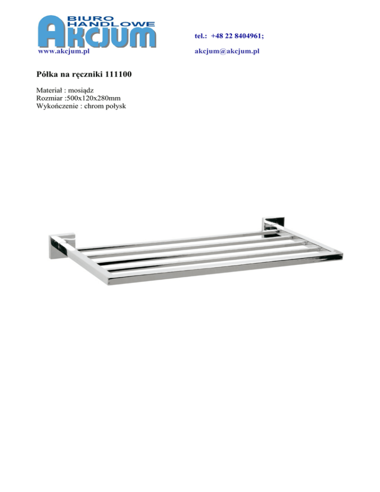 tel.: +48 22 8404961; www.akcjum.pl Półka na ręczniki 111100 Materiał : mosiądz Rozmiar :500x120x280mm Wykończenie : chrom połysk [email protected]