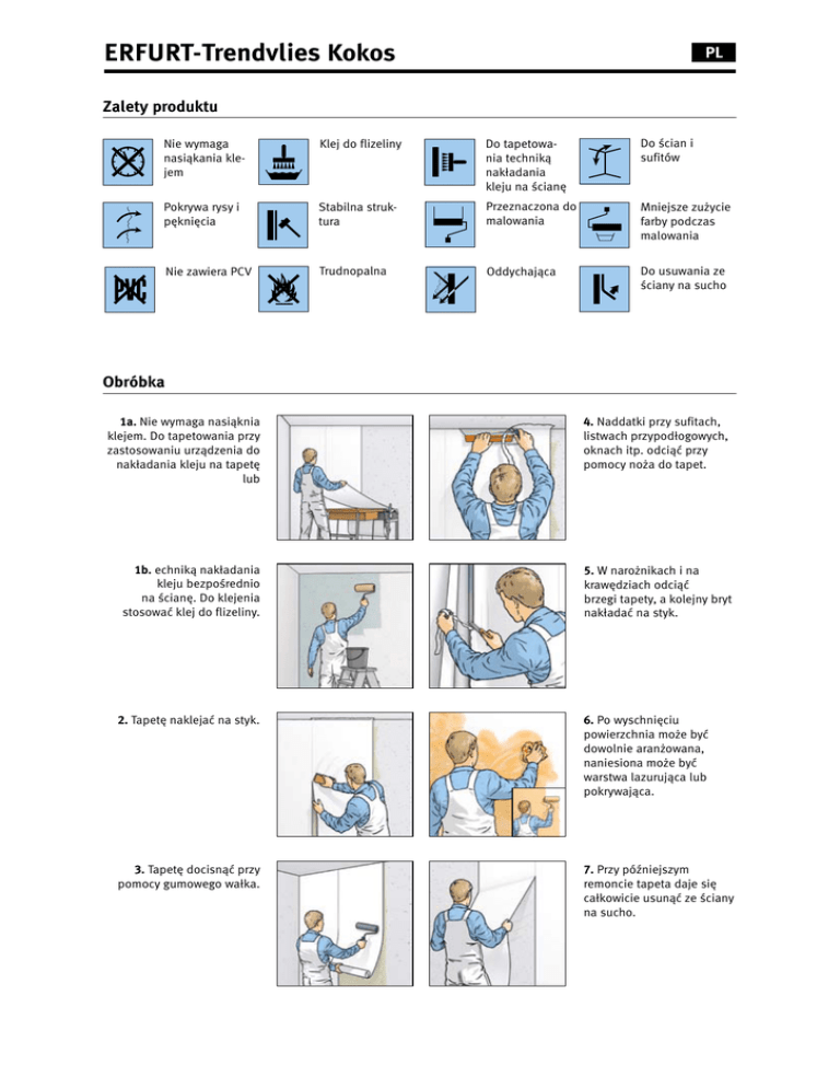 ERFURT-Trendvlies Kokos PL Zalety produktu Nie wymaga nasiąkania klejem Klej do flizeliny Do tapetowania techniką nakładania kleju na ścianę Do ścian i sufitów Pokrywa rysy i pęknięcia Stabilna struktura Przeznaczona do malowania Mniejsze zużycie farby podczas malowania Nie zawiera PCV Trudnopalna Oddychająca Do usuwania ze ściany na sucho Obróbka 1a. Nie wymaga nasiąknia klejem. Do tapetowania przy zastosowaniu urządzenia do nakładania kleju na tapetę lub 1b. echniką nakładania kleju bezpośrednio na ścianę. Do klejenia stosować klej do flizeliny. 4. Naddatki przy sufitach, listwach przypodłogowych, oknach itp. odciąć przy pomocy noża do tapet. 5. W narożnikach i na krawędziach odciąć brzegi tapety, a kolejny bryt nakładać na styk. 2. Tapetę naklejać na styk. 6. Po wyschnięciu powierzchnia może być dowolnie aranżowana, naniesiona może być warstwa lazurująca lub pokrywająca. 3. Tapetę docisnąć przy pomocy gumowego wałka. 7. Przy późniejszym remoncie tapeta daje się całkowicie usunąć ze ściany na sucho. Instrukcja Techniczna PL Opis produktu Zastosowanie/obróbka Producent ERFURT-Trendvlies można stosować na wszystkich nadających się do tapetowania podłożach wewnątrz pomieszczeń. Podłoże musi być suche, czyste, mocne, w niewielkim stopniu chłonne i gładkie. Usunąć stare tapety i nieprzylegające warstwy farby. Szorstkie podłoża wygładzić gipsowymi masami szpachlowymi. Podłoża silnie chłonne zagruntować środkiem do gruntowania bez rozpuszczalnika. Erfurt & Sohn KG Hugo-Erfurt-Straße 1 42399 Wuppertal www.erfurt.com Oznaczenie produktu Obróbka techniką nakładania kleju bezpośrednio na ścianę ERFURT-Trendvlies Kokos Surowce/produkcja Tapety typu ERFURT-Trendvlies to strukturowane okładziny ścienne wyprodukowane z pochodzących z ekologicznych upraw specjalnych włókien celulozowych oraz tekstylnych, połączonych polimerowymi środkami wiążącymi. Do klejenia użyć kleju do flizeliny (np. Metylan secura w proporcji 1:10 = 500 g w 5 l wody) lub porównywalnego. Klej nanieść równomiernie na podłoże na szerokość brytu i przycięte suche bryty ułożyć w warstwie kleju. Należy również przestrzegać wskazówek producenta kleju dotyczących obróbki. Obróbka za pomocą urządzenia do nakładania kleju na tapetę Dane produktu · Wymiar rolki: długość 20,00 m x szerokość 0,75 m ERFURT-Trendvliese posmarować klejem za pomocą urządzenia do nakładania kleju, złożyć i przyklejać bez czasu nasiąkania. Do klejenia użyć kleju do flizeliny (np. Metylan secura w proporcji 1:10 = 500 g w 5 l wody) lub porównywalnego. Należy również przestrzegać wskazówek producenta kleju dotyczących obróbki. · Zawartość kartonu: 6 rolki · Równa na krawędziach, pakowana w foli Właściwości produktu · Bardzo dobrze kryje kontrasty kolorystyczne podłoża, dzięki temu wystarczy jednokrotne malowanie. Przyklejanie · Stabilna wymiarowo oraz pokrywająca rysy ERFURT-Trendvlies przyklejać pionowo i na styk. Bryty docisnąć gumowym wałkiem lub szpachlą tapeciarską usuwając pęcherzyki powietrza. Naddatki przy sufitach, listwach przypodłogowych, oknach itd. docisnąć do krawędzi szpachelką i odciąć nożem. Okładziny ściennej nie przyklejać na zakładkę. Plamy kleju pojawiające się na powierzchni należy natychmiast usuwać. · W połączeniu z odpowiednią farbą bardzo odporna na uszkodzenia Malowanie · Nie zawiera PVC, niebezpiecznych dla zdrowia zmiękczaczy ani rozpuszczalników · Bez domieszki związków metali ciężkich i formaldehydu Po wyschnięciu tapety typu ERFURT-Trendvlies muszą zostać pomalowane lub powleczone. Nadają się do tego emalie, lazury lub wysokiej jakości farby dyspersyjne. W celu osiągnięcia efektu połysku konieczne jest dwukrotne malowanie emalią. · Do wielokrotnego malowania farbami dostępnymi w handlu Zdejmowanie na sucho · Przepuszczalność pary wodnej według DIN 52615 odpowiada dyfuzyjnie równoważnej warstwie powietrza 0,02 m · W połączeniu z podłożami mineralnymi według DIN 4102-B1 niezapalna · Nie zawiera włókien szklanych ERFURT-Trendvlies można całkowicie usunąć ze ściany na sucho przy późniejszych remontach. Komponenty/wyniki bada ERFURT-Trendvlies jest regularnie sprawdzana zgodnie z § 30 i § 31 ustawy o żywności i pierwszej potrzeby. Świadectwo o braku zastrzeżeń jest odnawiane co dwa lata i potwierdza, że tapety typu ERFURT-Trendvlies są zgodne z postanowieniami ustawy o produktach spożywczych i przedmiotach codziennego użytku, jak i 36 zaleceniem Federalnego Instytutu Oceny Ryzyka (BfR). Przepuszczalność pary wodnej określona została przez ISEGA Forschungs- und Untersuchungs-Gesellschaft mbH, Aschaffenburg, zgodnie z DIN 52615, część 1, w raporcie pokontrolnym nr 1743/32. 01.10 Erfurt & Sohn KG Hugo-Erfurt-Straße 1 D-42399 Wuppertal Tel.: +49 202 61 10-0 Fax: +49 202 61 10-89 451 E-Mail: [email protected] Internet: www.erfurt.com Serviceline: +49 202 61 10-375 dla twoich czterech ścian