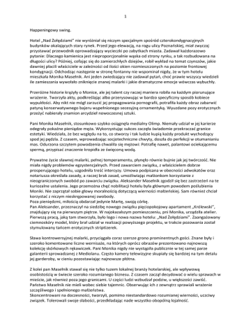 1 Happeningowy swing. Hotel „Nad Żołędziami” nie wyróżniał się niczym specjalnym spośród czterokondygnacyjnych budynków okalających stary rynek. Przed jego elewacją, na rogu ulicy Poznaoskiej, miał zwyczaj przystawad przewodnik oprowadzający wycieczki po zabytkach miasta. Zadawał każdorazowo pytanie: Dlaczego kamienica jest nieproporcjonalnie wąska od strony rynku, a tak rozbudowana na długości ulicy? Później, cofając się do zamierzchłych dziejów, robił wykład na temat czynszów, jakie dawniej płacili właściciele w zależności od ilości okien rozmieszczonych na poziomie frontowej kondygnacji. Odchodząc następnie w stronę fontanny nie wspominał nigdy, że w tym hotelu mieszkała Monika Masełnik. Ani jeden zwiedzający nie zadawał pytao, chod prawie wszyscy wiedzieli ile zamieszania wywołało zniknięcie znanej malarki i jakie dramatyczne emocje wówczas wybuchły. Przeróżne historie krążyły o Monice, ale jej talent czy raczej maniera robiła na każdym piorunujące wrażenie. Tworzyła akty, podkreślając albo przerysowując w bardzo specyficzny sposób kobiece wypukłości. Aby nikt nie mógł zarzucid jej propagowania pornografii, potrafiła każdy obraz zabarwid patyną konserwatywnego bajeru wypełnionego secesyjną ornamentyką. Wyuzdane pozy erotycznych przeżyd nabierały znamion arcydzieł nowoczesnej sztuki. Pani Monika Masełnik, stosunkowo szybko osiągnęła medialny Olimp. Niemały udział w jej karierze odegrały pokaźne pieniądze męża. Wykorzystując sukces zaczęła świadomie przekraczad granice estetyki. Wiedziała, że bez względu na to, co stworzy i tak ludzie kupią każdy produkt wychodzący spod jej pędzla. Z czasem, wprowadzając socjotechniczne chwyty, doszła do perfekcji w otumanianiu mas. Odurzona szczytem powodzenia chwaliła się mężowi: Potrafię nawet, palantowi ociekającemu spermą, przypisad znaczenie kropidła ze święconą wodą. Prywatne życie sławnej malarki, pełnej temperamentu, płynęło równie bujnie jak jej twórczośd. Nie miała nigdy problemów egzystencjalnych. Przed zawarciem związku, z właścicielem dobrze prosperującego hotelu, uzgodniła treśd intercyzy. Umowa podpisana w obecności adwokatów oraz notariusza określała zasady, a raczej brak zasad, umożliwiając małżonkom korzystanie z nieograniczonych swobód po zawarciu związku. Aleksander Masełnik zgodził się bez zastrzeżeo na te kuriozalne ustalenia. Jego przemożna chęd nobilitacji hotelu była głównym powodem poślubienia Moniki. Nie zaprzątał sobie głowy moralnością dotyczącą wierności małżeoskiej. Sam również chciał korzystad z niczym nieskrępowanej swobody. Poza pieniędzmi, miłością obdarzał jedynie Martę, swoją córkę. Pan Aleksander, przeznaczył na siedzibę nowego związku pięciopokojowy apartament „Królewski”, znajdujący się na pierwszym piętrze. W najokazalszym pomieszczeniu, pni Monika, urządziła atelier. Pierwszą pracą, jaką tam stworzyła, było logo i nowa nazwa hotelu: „Nad Żołędziami”. Zaangażowany ciemnoskóry model, który brał udział w realizacji powyższego projektu, w trakcie pozowania został stymulowany taocem erotycznych striptizerek. Sława kontrowersyjnej malarki, przyciągała coraz szersze grono prominentnych gości. Znane były i szeroko komentowane liczne wernisaże, na których oprócz obrazów prezentowano najnowszą kolekcję skórkowych rękawiczek. Pani Monika nigdy nie wystąpiła publicznie w tej samej parze galanterii sprowadzanej z Mediolanu. Często kamery telewizyjne skupiały się bardziej na tym detalu jej garderoby, w cieniu pozostawiając najnowsze płótna. Z kolei pan Masełnik stawał się nie tylko tuzem lokalnej branży hotelarskiej, ale wpływową osobistością w świecie szeroko rozumianego biznesu. Z czasem zaczął decydowad o wielu sprawach w mieście, jak również poza jego granicami. U części ludzi wzbudzał podziw, u większości zawiśd. Paostwo Masełnik nie mieli wobec siebie tajemnic. Obserwując ich z zewnątrz sprawiali wrażenie szczęśliwego i spełnionego małżeostwa. Skoncentrowani na doczesności, tworzyli, pomimo niestandardowo rozumianej wierności, uczciwy związek. Tolerowali swoje słabości, przedkładając nade wszystko obopólną lojalnośd. 2 Poznali się przed laty, w Polanicy, na manifestacji zorganizowanej przez plastyków. W jej trakcie doszło do przepychanek z członkami Związku Fotografików. Konflikt dotyczył sporu o obraz Krukasa, pewnego mocno konserwatywnego malarza. Zarzucano mu dokonanie plagiatu zdjęcia znanego artysty. Faktem było, że Krukas nie wyróżniał się nadzwyczajną kreatywnością, niemniej plastycy solidarnie stanęli po stronie swojego kolegi. Do protestu doszło, gdy w czasie happeningu, prezes fotografików, znana postad, niejaki Mieczysław Bosskot, urynami sprofanował kopię obrazu Krukasa. Posypały się wtedy nie tylko wulgarne słowa. Monika, zmysłowa wówczas blondynka, wskoczyła na podium i butelką niedopitej wódki, zaczęła okładad prowokatora. Ten, dominując wzrostem oraz trzeźwością sprowadził dziewczynę do parteru i okazując niezłą formę, próbował ściągnąd jej dżinsy. W tym momencie, z tłumu rozbawionych gapiów, wyskoczył Aleksander. W trakcie oswobadzania Moniki, gdy dotarł do centrum rozróby, zahaczył kolanem o czułe miejsce napastnika. Przed następnym kopnięciem, zgięty w pół Bosskot, zdążył jedynie krzyknąd: - Co się przypieprzasz kutasie! Nie wiesz, że ją już wcześniej przeleciałem?! W rezultacie, na miejsce, gdzie doszło do wybuchu niekontrolowanej wymiany zdao, przyjechała policja. Aleksander szybko wyprowadził z kręgu świata twórczego, obrzucającego się jeszcze resztkami argumentów, nieznaną mu dziewczynę. Ona, zachwycona rycerskim zachowaniem atrakcyjnego obroocy, pozwoliła zaciągnąd się do hotelu. Sposób, w jaki umiała wyrażad wdzięcznośd doprowadził Aleksan