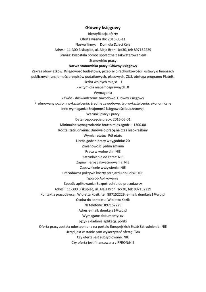 Główny księgowy Identyfikacja oferty Oferta ważna do: 2016-05-11 Nazwa firmy: Dom dla Dzieci Keja Adres: 11-300 Biskupiec, ul. Aleja Broni 1c/30, tel: 897152229 Branża: Pozostała pomoc społeczna z zakwaterowaniem Stanowisko pracy Nazwa stanowiska pracy: Główny księgowy Zakres obowiązków: Księgowość budżetowa, przepisy o rachunkowości i ustawy o finansach publicznych, znajomość przepisów podatkowych, płacowych, ZUS, obsługa programu Płatnik. Liczba wolnych miejsc: 1 - w tym dla niepełnosprawnych: 0 Wymagania Zawód - doświadczenie zawodowe: Główny księgowy Preferowany poziom wykształcenia: średnie zawodowe, typ wykształcenia: ekonomiczne Inne wymagania: Znajomość księgowości budżetowej. Warunki płacy i pracy Data rozpoczęcia pracy: 2016-05-01 Minimalne wynagrodzenie brutto mies./godz.: 1300.00 Rodzaj zatrudnienia: Umowa o pracę na czas nieokreślony Wymiar etatu: Pół etatu Liczba godzin pracy w tygodniu: 20 Zmianowość: jedna zmiana Praca w wolne dni: NIE Zatrudnienie od zaraz: NIE Zapewnienie zakwaterowania: NIE Zapewnienie wyżywienia: NIE Pracodawca pokrywa koszty przejazdu do Polski: NIE Sposób Aplikowania Sposób aplikowania: Bezpośrednio do pracodawcy Adres: 11-300 Biskupiec, ul. Aleja Broni 1c/30, tel: 897152229 Kontakt z pracodawcą: Wioletta Kozik, tel: 897152229, e-mail: [email protected] Osoba do kontaktu: Wioletta Kozik Nr telefonu: 897152229 Adres e-mail: [email protected] Wymagane dokumenty: cv Język składania aplikacji: polski Oferta pracy została udostępniona na portalu Europejskich Służb Zatrudnienia: NIE Urząd jest w stanie sam wykorzystać ofertę: TAK Czy oferta jest subsydiowana: NIE Czy oferta jest finansowana z PFRON:NIE