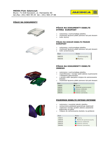 MEDEA Piotr Adamczyk Biuro: 71-018 Szczecin, ul. Harnasiów 40 tel./fax: (91) 483 49 24 tel.: (91) 483 27 88 PÓŁKI NA DOKUMENTY PÓŁKA NA DOKUMENTY ESSELTE DYMNA EUROPOST • • • wykonana z wytrzymałego plastiku moŜliwość łączenia półek pionowo lub pod skosem kolor dymny PÓŁKA NA DOKUM ESSELTE PRZEZR EUROPOST • • • wykonana z wytrzymałego plastiku moŜliwość łączenia półek pionowo lub pod skosem kolor przezroczysty PÓŁKA NA DOKUMENTY ESSELTE INNEGO • • • • wykonana z wytrzymałego plastiku wyprofilowany i wycięty spód ułatwia wyjmowanie i wkładanie dokumentów z przodu półki specjalne miejsce do zamocowania etykiety moŜliwość łączenia półek pionowo lub pod skosem POJEMNIK ESSELTE INTEGO INTENSE • • • • wykonany z wysokiej jakości plastiku wzmocniona podstawa gwarantuje stabilność częściowo wycięty grzbiet ułatwia ustawienie pojemnika na półce miejsce do zamocowania etykiety na grzbiecie MEDEA Piotr Adamczyk Biuro: 71-018 Szczecin, ul. Harnasiów 40 tel./fax: (91) 483 49 24 tel.: (91) 483 27 88 SEGREGATORY SEGREGATORY A4 ESSELTE RAINBOW / GRZBIET 75 MM • • • • oklejony na zewnątrz kolorowym, a wewnątrz jasnoszarym papierem samoprzylepna etykieta na grzbiecie na dolnych krawędziach metalowe okucia szerokość grzbietu 75 mm SEGREGATOR A4 ESSELTE RAINBOW / GRZBIET 50 MM / • • • • oklejony na zewnątrz kolorowym, a wewnątrz jasnoszarym papierem samoprzylepna etykieta na grzbiecie na dolnych krawędziach metalowe okucia szerokość grzbietu 50 mm SEGREGATOR A4 ESSELTE EKONOMICZNY / GRZBIET 75 MM / • • • • oklejony na zewnątrz poliolefiną, a wewnątrz jasnoszarym papierem dwustronna, wymienna etykieta na grzbiecie na dolnych krawędziach metalowe okucia szerokość grzbietu 75 mm MEDEA Piotr Adamczyk Biuro: 71-018 Szczecin, ul. Harnasiów 40 tel./fax: (91) 483 49 24 tel.: (91) 483 27 88 SEGREGATOR A4 ESSELTE EKONOMICZNY / GRZBIET 50 MM / • • • • oklejony na zewnątrz poliolefiną, a wewnątrz jasnoszarym papierem dwustronna, wymienna etykieta na grzbiecie na dolnych krawędziach metalowe okucia szerokość grzbietu 50 mm SEGREGATOR A4 ESSELTE PP / GRZBIET 75 MM / • • • • oklejony na zewnątrz i wewnątrz poliolefiną dwustronna, wymienna etykieta na grzbiecie na dolnych krawędziach metalowe okucia szerokość grzbietu 75 mm SEGREGATOR A4 ESSELTE PP / GRZBIET 50 MM / • • • • oklejony na zewnątrz i wewnątrz poliolefiną dwustronna, wymienna etykieta na grzbiecie na dolnych krawędziach metalowe okucia szerokość grzbietu 50 mm MEDEA Piotr Adamczyk Biuro: 71-018 Szczecin, ul. Harnasiów 40 tel./fax: (91) 483 49 24 tel.: (91) 483 27 88 KOSZULKI NA DOKUMENTY KOSZULKI ESSELTE GROSZKOWE A4 PP • • • • • wykonane z folii PP multiperforowane - pasują do kaŜdego segregatora opakowanie 100 szt. grubość folii: 48 mic. pakowane w folii KOSZULKI ESSELTE KRYSTALICZNE A4 PP 55 MIC. / PUDEŁKO / • • • • wykonane z folii PP multiperforowane - pasują do kaŜdego segregatora opakowanie 100 szt. w pudełku grubość folii: 55 mic. OFERTÓWKI ESSELTE GROSZKOWE A4 OTWIERANE Z GÓRY I Z LEWEJ STRONY, PP 90 MIC. KOSZULKA ESSELTE ZAMYKANA NA SUWAK • • • • wykonana z mocnej folii PCV o grubości 200 mic. multiperforacja wymiar 307 x 215 cm opakowanie 5 szt. w folii MEDEA Piotr Adamczyk Biuro: 71-018 Szczecin, ul. Harnasiów 40 tel./fax: (91) 483 49 24 tel.: (91) 483 27 88 KOSZULKI ESSELTE GROSZKOWE A4 NA KATALOGI, PP 170 MIC. • wykonane z folii PP o grubości 170 mic. • • multiperforacja poszerzany brzeg zwiększa pojemność koszulki o 23 mm opakowanie 10 szt. w folii • KOSZULKI A4 PP 120 MIC. NA 16 WIZYTÓWEK • • • wykonane z folii PP o grubości 120 mic. mieszczą 16 wizytówek opakowanie 10 szt. w folii KOSZULKI ESSELTE Z KLAPKĄ PP 100 MIC • • • • wykonane z mocnego PP o grubości 100 mic. multiperforowane - pasują do kaŜdego segregatora boczna klapka chroni dokumenty przed wypadaniem opakowanie 10 szt. w folii