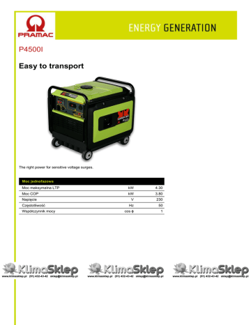 P4500I Easy to transport The right power for sensitive voltage surges. Moc jednofazowa Moc maksymalna LTP kW 4.30 Moc COP kW 3.80 Napięcie Częstotliwość Współczynnik mocy V 230 Hz 50 cos ϕ 1 Dane silnika Producent silnika Robin-Subaru Type Pojemność EX270 cm³ Cylindrów Power Max 265 1 slope kW Paliwo 6.3 Gasoline Zasysanie Wolnossący System chłodzenia silnika Powietrza System rozruchu Elektryczne Moc Moc g/kWh 313 Consumption at 75% of load l/h 1.66 Pojemność zbiornika paliwa l 12.8 h 7.7 Acoustic power LWA dB(A) 93 Acoustic pressure at 7m dB(A) 62 (L) mm 580 Szerokość (W) mm 527 Wysokość (H) mm 618 Kg 74 Czas pracy przy 75% mocy COP Poziom hałasu Dane wymiarowe Długość Waga (suchy) Panel Sterowania Woltomierz ● Licznik motogodzin ● Częstotliwościomierz ● Economiser ● Fuel gauge ● Wheels and handles ● Ładowarka akumulatora (12V 8.3A) GNIAZDA ● 2 SCHUKO 230V 16A Zabezpieczenie Czujnik braku oleju ● Zwarcie ● Przeciążenie ● Zatrzymanie spowodowane nadobrotami ● Przed przegrzaniem ● ● : Standard ● : Standard KLIMASKLEP ul. Orzechowa 3 72-010 Przęsocin k/Szczecina tel.: (91) 432-43-42 tel.: (91) 432-43-49 e-mail: [email protected] www: www.KlimaSklep.pl Printed on 25/07/2015 (ID 2308) ©2012 | PR INDUSTRIAL s.r.l. | All rights reserved | Image shown may not reflect actual package. Specifications subject to change without notice | ENERGY GENERATION is registered trademarks of PR INDUSTRIAL s.r.l. Other company, product or service names may be trademarks or service marks of others. RevA (06/2012).