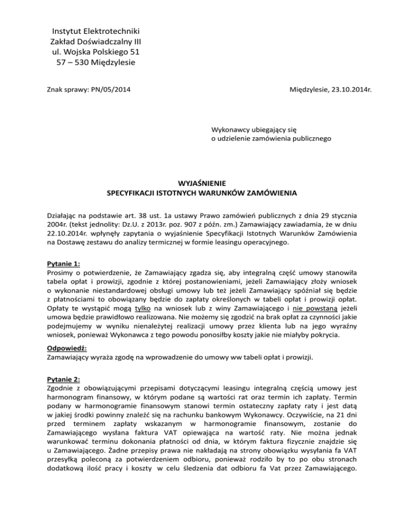 Instytut Elektrotechniki Zakład Doświadczalny III ul. Wojska Polskiego 51 57 – 530 Międzylesie Znak sprawy: PN/05/2014 Międzylesie, 23.10.2014r. Wykonawcy ubiegający się o udzielenie zamówienia publicznego WYJAŚNIENIE SPECYFIKACJI ISTOTNYCH WARUNKÓW ZAMÓWIENIA Działając na podstawie art. 38 ust. 1a ustawy Prawo zamówień publicznych z dnia 29 stycznia 2004r. (tekst jednolity: Dz.U. z 2013r. poz. 907 z późn. zm.) Zamawiający zawiadamia, że w dniu 22.10.2014r. wpłynęły zapytania o wyjaśnienie Specyfikacji Istotnych Warunków Zamówienia na Dostawę zestawu do analizy termicznej w formie leasingu operacyjnego. Pytanie 1: Prosimy o potwierdzenie, że Zamawiający zgadza się, aby integralną część umowy stanowiła tabela opłat i prowizji, zgodnie z której postanowieniami, jeżeli Zamawiający złoży wniosek o wykonanie niestandardowej obsługi umowy lub też jeżeli Zamawiający spóźniał się będzie z płatnościami to obowiązany będzie do zapłaty określonych w tabeli opłat i prowizji opłat. Opłaty te wystąpić mogą tylko na wniosek lub z winy Zamawiającego i nie powstaną jeżeli umowa będzie prawidłowo realizowana. Nie możemy się zgodzić na brak opłat za czynności jakie podejmujemy w wyniku nienależytej realizacji umowy przez klienta lub na jego wyraźny wniosek, ponieważ Wykonawca z tego powodu ponosiłby koszty jakie nie miałyby pokrycia. Odpowiedź: Zamawiający wyraża zgodę na wprowadzenie do umowy ww tabeli opłat i prowizji. Pytanie 2: Zgodnie z obowiązującymi przepisami dotyczącymi leasingu integralną częścią umowy jest harmonogram finansowy, w którym podane są wartości rat oraz termin ich zapłaty. Termin podany w harmonogramie finansowym stanowi termin ostateczny zapłaty raty i jest datą w jakiej środki powinny znaleźć się na rachunku bankowym Wykonawcy. Oczywiście, na 21 dni przed terminem zapłaty wskazanym w harmonogramie finansowym, zostanie do Zamawiającego wysłana faktura VAT opiewająca na wartość raty. Nie można jednak warunkować terminu dokonania płatności od dnia, w którym faktura fizycznie znajdzie się u Zamawiającego. Żadne przepisy prawa nie nakładają na strony obowiązku wysyłania fa VAT przesyłką poleconą za potwierdzeniem odbioru, ponieważ rodziło by to po obu stronach dodatkową ilość pracy i koszty w celu śledzenia dat odbioru fa Vat przez Zamawiającego. Zaś obowiązki podatkowe są ściśle powiązane z datą wystawienia faktury i datą płatności należnych kwot. W związku z czym Wykonawca nie jest w stanie wykonać zapisu rozdziału 17 SIWZ pkt 6 mówiący, ze spłata rat leasingowych następowała będzie w terminie 14 dni od daty otrzymania prawidłowo wystawionej fa VAT. – Prosimy o wykreślenie tego zapisu i o potwierdzenie, że: a) raty leasingowe płatne będą wg harmonogramu finansowego stanowiącego integralną część umowy leasingowej, b) daty podane w harmonogramie finansowym są datami płatności, a dzień zapłaty rozumiany jest jako dzień wpływu środków na rachunek bankowy Wykonawcy. Jednocześnie prosimy Zamawiającego, aby wykreślił wszystkie zapisy mówiące o innym sposobie zapłaty w SIWZ. Odpowiedź: Zamawiający modyfikuje zapis rozdziału 17 pkt 6 SIWZ w następujący sposób: Spłata rat leasingowych będzie następowała w terminie 21 dni od daty prawidłowo wystawionej faktury VAT zgodnie z harmonogramem spłat będącym integralną częścią umowy leasingowej. Pytanie 3: Zgodnie z zasadami leasingu opłata wstępna płatna jest w dniu podpisania umowy, najpóźniej w ciągu 7 dni od daty podpisania umowy leasingowej. W związku z czym proszę potwierdzenie Zamawiającego, że opłata wstępna zostanie zapłacona najpóźniej w ciągu 7 dni od daty podpisania umowy leasingowej. W innym wypadku Wykonawca nie będzie mógł złożyć oferty. Odpowiedź: Zamawiający pozostawia zapisy rozdziału 17 pkt 5 SIWZ bez zmian. Pytanie 4: Czy Zamawiający oczekuje aby ubezpieczenie przedmiotu leasingu płatne było na podstawie corocznie odnawianej polisy ubezpieczeniowej? Odpowiedź: Zamawiający zmienia brzmienie zapisu dot. ubezpieczenia przedmiotu zamówienia w rozdziale 3 („Wymagane warunki leasingu”): Ubezpieczenie: przedmiotu zamówienia po stronie leasingodawcy płatne przez Zamawiającego na podstawie oddzielnej faktury VAT wystawianej w oparciu o corocznie odnawianą polisę ubezpieczeniową, na czas transportu przedmiotu zamówienia zawarte w cenie ofertowej. Pytanie 5: Zamawiający w jednym miejscu specyfikacji jest mowa o walucie Euro w drugim miejscu widnieje zapis, iż ubezpieczenie ma być fakturowane osobno, a to jest możliwe wyłącznie w PLN. I trzeci zapis, iż cena realizacji nie ulegnie cenie przez cały okres trwania. Do tego na fv walutowych widnieje zawsze kwota czynszu w Euro, ale VAT przeliczony jest na PLN po kursie z dnia poprzedzającego wystawienie FV + adnotacja, że czynsz netto płaci się w Euro, a VAT w PLN. Dlatego proszę o doprecyzowanie: czy Zamawiający dopuszczają osobną FV za ubezpieczenie w PLN – czy Zamawiający akceptuje, że wartość niezmienną możemy podać tylko w Euro. Odpowiedź: Zamawiający wyjaśnia, że zawarty w formularzu oferty podatek VAT wyrażony w EUR jest wymagany tylko i wyłącznie w celu porównania ofert. Rzeczywiste płatności będą realizowane na zasadzie: kwota czynszu w EUR + VAT przeliczony na PLN po kursie z dnia poprzedzającego wystawienie faktury. Zadane pytania i udzielone na nie odpowiedzi nie prowadzą do zmiany treści ogłoszenia, w związku z czym Zamawiający nie przedłuża terminu składania ofert. mgr inż. Jarosław Góra /Osoba upoważniona przez Kierownika Zamawiającego do wykonywania czynności związanych z przeprowadzeniem postępowania o udzielenie zamówienia. Podpis osoby upoważnionej na oryginale dokumentu./