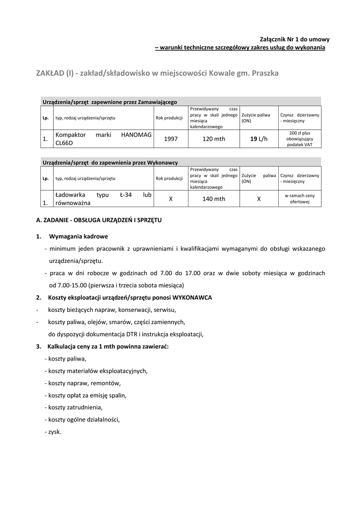 Załącznik Nr 1 do umowy – warunki techniczne szczegółowy zakres usług do wykonania ZAKŁAD (I) - zakład/składowisko w miejscowości Kowale gm. Praszka Urządzenia/sprzęt zapewnione przez Zamawiającego Lp. typ, rodzaj urządzenia/sprzętu 1. Kompaktor CL66D Rok produkcji marki HANOMAG 1997 Przewidywany czas pracy w skali jednego Zużycie paliwa miesiąca (ON) kalendarzowego 120 mth 19 L/h Czynsz dzierżawny - miesięczny 200 zł plus obowiązujący podatek VAT Urządzenia/sprzęt do zapewnienia przez Wykonawcy Lp. typ, rodzaj urządzenia/sprzętu 1. Ładowarka typu równoważna Rok produkcji Ł-34 lub X Przewidywany czas pracy w skali jednego Zużycie miesiąca (ON) kalendarzowego 140 mth paliwa Czynsz dzierżawny - miesięczny X w ramach ceny ofertowej A. ZADANIE - OBSŁUGA URZĄDZEŃ I SPRZĘTU 1. Wymagania kadrowe - minimum jeden pracownik z uprawnieniami i kwalifikacjami wymaganymi do obsługi wskazanego urządzenia/sprzętu. - praca w dni robocze w godzinach od 7.00 do 17.00 oraz w dwie soboty miesiąca w godzinach od 7.00-15.00 (pierwsza i trzecia sobota miesiąca) 2. Koszty eksploatacji urządzeń/sprzętu ponosi WYKONAWCA - koszty bieżących napraw, konserwacji, serwisu, - koszty paliwa, olejów, smarów, części zamiennych, do dyspozycji dokumentacja DTR i instrukcja eksploatacji, 3. Kalkulacja ceny za 1 mth powinna zawierać: - koszty paliwa, - koszty materiałów eksploatacyjnych, - koszty napraw, remontów, - koszty opłat za emisję spalin, - koszty zatrudnienia, - koszty ogólne działalności, - zysk. B. ZADANIE - OBSŁUGA GOSPODARCZA - OGÓLNA 1. Wymagania kadrowe - minimum jeden pracownik bez konkretnych wskazań umiejętności, 2. Kalkulacja ceny ryczałtowej za obsługę gospodarczą powinna zawierać - koszty zatrudnienia pracownika/ków, - koszty świadczeń socjalnych, - koszty świadczeń z zakresu bhp, - koszty ogólne działalności, - zysk. A. ZADANIE - OBSŁUGA URZĄDZEŃ I SPRZĘTU – wytyczne szczegółowe 1. Prace na urządzeniach i sprzęcie mogą wykonywać tylko pracownicy z uprawnieniami, kwalifikacjami w zakresie wymaganym przepisami i przeszkoleniem stanowiskowym od poniedziałku do soboty zgodnie ze wskazaniami i wymaganiem Zamawiającego. 2. Minimalny czas wymagany do przepracowania: a) dla kompaktora – 120 motogodzin w jednym miesiącu kalendarzowym b) dla ładowarki – 140 motogodzin w jednym miesiącu kalendarzowym czas obliczono dla przedziału od 800 Mg do 1 500 Mg dowożonych odpadów. 3. W przypadku kompaktora rozliczenie będzie wyglądało następująco: a) jeżeli ilość składowanych odpadów wyniesie do 500 Mg włącznie, czas pracy sprzętu w celu zagospodarowania 1 Mg będzie liczony dla 6 min. i będzie wypłacany ryczałt liczony w następujący sposób: 6 min. x 500 Mg / 60 min = 50 [mth] b) jeżeli ilość składowanych odpadów wyniesie powyżej 500 Mg, pod uwagę będzie brany faktyczny czas pracy czyli liczba [mth] x stawka za 1 [mth] = wynagrodzenie jeżeli jednak faktyczny czas zagospodarowania 1 Mg przekroczy 6 min, wynagrodzenie zostanie policzone analogicznie jak w punkcie a) tzn; 6 min x ilość Mg / 60 min = ilość [mth] 4. W przypadku ładowarki rozliczenie będzie wyglądało następująco: a) jeżeli ilość przewiezionych odpadów wyniesie do 500 Mg włącznie, czas pracy sprzętu w celu zagospodarowania 1 Mg będzie liczony dla 6 min. i będzie wypłacany ryczałt liczony w następujący sposób: 6 min. x 500 Mg / 60 min = 50 [mth] b) jeżeli ilość przewiezionych odpadów wyniesie powyżej 500 Mg, pod uwagę będzie brany faktyczny czas pracy czyli liczba [mth] x stawka za 1 [mth] = wynagrodzenie jeżeli jednak faktyczny czas zagospodarowania 1 Mg przekroczy 6 min, wynagrodzenie zostanie policzone analogicznie jak w punkcie a) tzn; 6 min x ilość Mg / 60 min = ilość [mth] W przypadku zmniejszenia bądź zwiększenia przedziału ilości dowożonych odpadów minimalny czas pracy wydłuża się lub obniża odpowiednio proporcjonalnie. Niedobór wykonania minimalnego czasu skutkuje obniżeniem - wynagrodzenia bez uprzedzenia Wykonawcy – o 10% przyjętej stawki za godzinę na każdą tonę dostarczoną na teren składowiska z przeznaczeniem do zagospodarowania na kwaterze. 5. Kompaktowanie odpadów ma uwzględniać współczynnik zagęszczenia odpadów, którego minimalna wartość wynosi 1,0 Mg/m³ - oznacza to, że dowiezione odpady na działkę roboczą muszą być minimum czterokrotnie skompaktowane po tej samej trasie przejazdu. 6. Prace wykonywane na kompaktorze i ładowarce mają zapewnić równomierne rozłożenie odpadów na działce roboczej, zagwarantować prawidłowe nachylenie skarp 1:4 zgodnie z instrukcją eksploatacji składowiska, projektem budowlanym, pomiarami geodezyjnymi, wskazaniami Zamawiającego oraz bieżące przesypywanie odpadów. W tym celu odpady rozładowane na kwaterze muszą być w pierwszej kolejności przemieszczone na działkę roboczą, następnie skomapktowane i przesypane przy równoczesnym formowaniu skarpy i obsypywaniu jej na bieżąco materiałem rekultywacyjnym. 7. Odpady dowiezione w godzinach popołudniowych, o ile pozwolą na to warunki mogą być prawidłowo rozmieszczone na działce roboczej w dniu następnym – niedopuszczalne jest dłuższe gromadzenie odpadów bez ich prawidłowego zagospodarowania. 8. Na teren zakładu dowożone są także odpady z przeznaczeniem do segregacji tzw. surowce. Prace załadunku na tabor samochodowy lub przemieszczanie odpadów lub załadunek na urządzenia przesiewające i rozdrabniające są także wliczone w czas pracy ładowarki. 9. Zamawiający w każdym czasie ma prawo kontroli sposobu wykonywania usługi pod każdym względem. B. ZADANIE - OBSŁUGA GOSPODARCZA - OGÓLNA – wytyczne szczegółowe 1. Zakład przyjmuje odpady w godzinach od 7.00 do 17.00 w dni robocze oraz w dwie soboty miesiąca w godzinach od 7.00-15.00 - w tym czasie musi następować obsługa stanowiska ważenia. 2. Każdy wjazd i wyjazd odpa