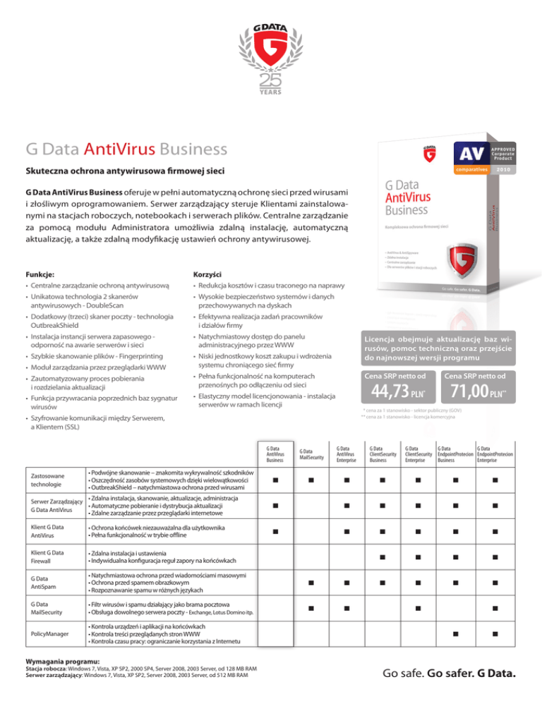 G Data AntiVirus Business Skuteczna ochrona antywirusowa firmowej sieci G Data AntiVirus Business oferuje w pełni automatyczną ochronę sieci przed wirusami i złośliwym oprogramowaniem. Serwer zarządzający steruje Klientami zainstalowanymi na stacjach roboczych, notebookach i serwerach plików. Centralne zarządzanie za pomocą modułu Administratora umożliwia zdalną instalację, automatyczną aktualizację, a także zdalną modyfikację ustawień ochrony antywirusowej. Funkcje: Korzyści • Centralne zarządzanie ochroną antywirusową • Redukcja kosztów i czasu traconego na naprawy • Unikatowa technologia 2 skanerów antywirusowych - DoubleScan • Wysokie bezpieczeństwo systemów i danych przechowywanych na dyskach • Dodatkowy (trzeci) skaner poczty - technologia OutbreakShield • Efektywna realizacja zadań pracowników i działów firmy • Instalacja instancji serwera zapasowego odporność na awarie serwerów i sieci • Natychmiastowy dostęp do panelu administracyjnego przez WWW • Szybkie skanowanie plików - Fingerprinting • Moduł zarządzania przez przeglądarki WWW • Niski jednostkowy koszt zakupu i wdrożenia systemu chroniącego sieć firmy • Zautomatyzowany proces pobierania i rozdzielania aktualizacji • Pełna funkcjonalność na komputerach przenośnych po odłączeniu od sieci • Funkcja przywracania poprzednich baz sygnatur wirusów • Elastyczny model licencjonowania - instalacja serwerów w ramach licencji Licencja obejmuje aktualizację baz wirusów, pomoc techniczną oraz przejście do najnowszej wersji programu • Podwójne skanowanie – znakomita wykrywalność szkodników • Oszczędność zasobów systemowych dzięki wielowątkowości • OutbreakShield – natychmiastowa ochrona przed wirusami Cena SRP netto od * ** 44,73 PLN 71,00 PLN *cena za 1 stanowisko - sektor publiczny (GOV) **cena za 1 stanowisko - licencja komercyjna • Szyfrowanie komunikacji między Serwerem, a Klientem (SSL) Zastosowane technologie Cena SRP netto od G Data AntiVirus Business G Data MailSecurity G Data AntiVirus Enterprise G Data ClientSecurity Business G Data G Data G Data ClientSecurity EndpointProtecion EndpointProtecion Enterprise Business Enterprise ■ ■ ■ ■ ■ ■ ■ • Zdalna instalacja, skanowanie, aktualizacje, administracja Serwer Zarządzający • Automatyczne pobieranie i dystrybucja aktualizacji G Data AntiVirus ■ ■ ■ ■ ■ ■ Klient G Data AntiVirus • Ochrona końcówek niezauważalna dla użytkownika • Pełna funkcjonalność w trybie offline ■ ■ ■ ■ ■ ■ Klient G Data Firewall • Zdalna instalacja i ustawienia • Indywidualna konfiguracja reguł zapory na końcówkach ■ ■ ■ ■ G Data AntiSpam • Natychmiastowa ochrona przed wiadomościami masowymi • Ochrona przed spamem obrazkowym • Rozpoznawanie spamu w różnych językach ■ ■ ■ ■ ■ ■ G Data MailSecurity • Filtr wirusów i spamu działający jako brama pocztowa • Obsługa dowolnego serwera poczty - Exchange, Lotus Domino itp. ■ ■ PolicyManager • Kontrola urządzeń i aplikacji na końcówkach • Kontrola treści przeglądanych stron WWW • Kontrola czasu pracy: ograniczanie korzystania z Internetu • Zdalne zarządzanie przez przeglądarki internetowe ■ ■ ■ ■ Wymagania programu: Stacja robocza: Windows 7, Vista, XP SP2, 2000 SP4, Server 2008, 2003 Server, od 128 MB RAM Serwer zarządzający: Windows 7, Vista, XP SP2, Server 2008, 2003 Server, od 512 MB RAM Go safe. Go safer. G Data.