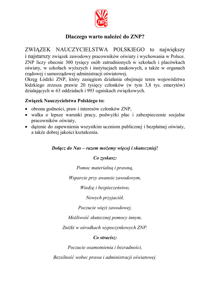 Dlaczego warto należeć do ZNP? ZWIĄZEK NAUCZYCIELSTWA POLSKIEGO to największy i najstarszy związek zawodowy pracowników oświaty i wychowania w Polsce. ZNP liczy obecnie 300 tysięcy osób zatrudnionych w szkołach i placówkach oświaty, w szkołach wyższych i instytucjach naukowych, a także w organach rządowej i samorządowej administracji oświatowej. Okręg Łódzki ZNP, który zasięgiem działania obejmuje teren województwa łódzkiego zrzesza prawie 20 tysięcy członków (w tym 3,8 tys. emerytów) działających w 63 oddziałach i 993 ogniskach związkowych. Związek Nauczycielstwa Polskiego to: obrona godności, praw i interesów członków ZNP, walka o lepsze warunki pracy, podwyżki płac i zabezpieczenie socjalne pracowników oświaty, dążenie do zapewnienia wszystkim uczniom publicznej i bezpłatnej oświaty, a także dobrej jakości kształcenia. Dołącz do Nas – razem możemy więcej i skuteczniej! Co zyskasz: Pomoc materialną i prawną, Wsparcie przy awansie zawodowym, Wiedzę i bezpieczeństwo, Nowych przyjaciół, Poczucie więzi zawodowej, Możliwość skutecznej pomocy innym, Zniżki w ośrodkach wypoczynkowych ZNP. Co stracisz: Poczucie osamotnienia i bezradności, Bezsilność wobec prawa i administracji oświatowej. Działalność ZNP to przede wszystkim (wg. Statutu ZNP): 1) uczestniczenie w tworzeniu aktów prawnych dotyczących statusu prawnego pracowników oświaty oraz szkolnictwa wyższego i nauki, 2) opiniowanie aktów prawnych dotyczących oświaty, szkolnictwa wyższego i nauki, 3) podejmowanie działań mających na celu poprawę warunków życia i pracy członków ZNP oraz udzielanie im i członkom ich rodzin pomocy materialnej, 4) wyrażanie sprzeciwu wobec pracodawców naruszających interesy i prawa pracownicze i związkowe, 5) organizowanie poradnictwa prawnego, 6) organizowanie szkoleń i kursów związkowych, 7) rozwijanie działalności oświatowo-kulturalnej, turystyczno-krajoznawczej i sportowej, 8) prowadzenie szkół, placówek oświatowych i wychowawczych, domów nauczyciela, placówek wypoczynkowo-leczniczych, sanatoriów, wydawnictwa pedagogicznego i tygodnika społeczno-oświatowego "Głos Nauczycielski", 9) prowadzenie działalności gospodarczej i udział w podmiotach prowadzących taką działalność, w fundacjach, stowarzyszeniach i innych organizacjach, 10) udział i organizowanie konferencji, zjazdów, seminariów naukowych oraz oświatowych o tematyce związkowej i oświatowej w kraju i za granicą. Będąc członkiem ZNP możesz działać w: Sekcjach związkowych: - Sekcja Pracowników Administracji i Obsługi, - Sekcja Emerytów i Rencistów; Sekcjach zawodowych, np. wychowania przedszkolnego, szkolnictwa specjalnego, opieki nad dzieckiem, szkolnictwa zawodowego, poradnictwa i pomocy psychologiczno-pedagogicznej; Klubach Młodego Nauczyciela; Komisjach, np.: historycznej, kultury, sportu i turystyki. ZNP posiada uprawnienia w zakresie: Uzgadniania regulaminów wynagradzania nauczycieli oraz pracowników administracji i obsługi szkół (na podstawie art. 772 §4 Kodeksu Pracy, art. 30 ust. 6 i 6a Karty nauczyciela) Uzgadniania regulaminów pracy (art. 1042 §1 KP), Uzgadniania regulaminów przyznawania nagród i premiowania (art. 27 ust. 3 ustawy o związkach zawodowych), Uzgadniania regulaminu zakładowego funduszu świadczeń socjalnych oraz sposobu przyznawania pracownikom świadczeń z tego funduszu (art. 27 ust. 1 i 2 ustawy o związkach zawodowych) Opiniowania podziału środków na dofinansowanie zawodowego nauczycieli (art. 70a, ust. 2a KN), doskonalenia Opiniowania założeń i projektów aktów prawa lokalnego dotyczących oświaty i jej pracowników (art. 19 ust. 1 i 2 ustawy o związkach zawodowych), Opiniowania uchwał i regulaminów JST w sprawie określania zasad i sposobu przyznawania pomocy zdrowotnej dla nauczycieli (art. 19 ust. 1 i 2 ustawy o związkach zawodowych), Opiniowania oceny pracy dyrektora szkoły dokonywanej przez organ prowadzący szkołę i organ nadzoru pedagogicznego (art. 6a, ust. 7 KN), Wskazania swojego przedstawiciela do udziału w pracach komisji konkursowej na stanowisko dyrektora szkoły lub placówki (art. 36a, ust. 5 ustawy o systemie oświaty), Wskazania swojego przedstawiciela do udziału w pracach komisji kwalifikacyjnych i egzaminacyjnych dla nauczycieli ubiegających się o awans zawodowy (art. 9g, ust. 5 i 5a KN), Zajęcia stanowiska w sprawie zamiaru wypowiedzenia nauczycielowi stosunku pracy z przyczyn określonych w art. 20, ust. 1 i 2 KN – likwidacja szkoły lub zmiany organizacyjne powodujące zmniejszenie liczby oddziałów w szkole (art. 20, ust. 5a KN), Konsultowania wypowiedzenia umowy o pracę zatrudnionemu na czas nieokreślony (art. 38 KP), pracownikowi Konsultowania wypowiedzenia warunków pracy lub płacy pracownikowi zatrudnionemu na czas nieokreślony (art. 42 KP, w związku z art. 38 KP), Opiniowania zwolnienia dyscyplinarnego (art.52 §3 Kodeksu Pracy). Jako związek zawodowy mamy prawo: • wskazać pracodawcom członków ZNP podlegających ochronie prawnej przewidzianej w art. 32 ust. 1 ustawy o związkach zawodowych (bez zgody zarządu organizacji związkowej pracodawca nie może wypowiedzieć ani rozwiązać stosunku pracy ze wskazanym pracownikiem, a także zmienić jednostronnie warunków pracy lub płacy na niekorzyść pracownika, chyba że zakład pracy ulega likwidacji); • brać udział w pracach komisji opiniującej wnioski o przyznanie odznaczeń państwowych i resortowych oraz nagród: Ministra Edukacji Narodowej, Kuratora Oświaty, Prezydenta Miasta, Burmistrza, Starosty, wójtów gmin i dyrektorów szkół; • tworzyć w zakładach pracy pracownicze kasy zapomogowo-pożyczkowe oraz sprawować społeczny nadzór nad tymi kasami; • wybierać zakładowych społecznych inspektorów pracy; • sprawować kontrolę nad przestrzeganiem w zakładach pracy przepisów prawa pracy, a w szczególności przepisów oraz zasad bezpieczeńst