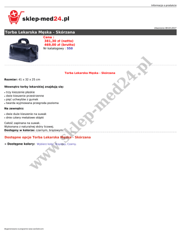 Informacje o produkcie Utworzono 08-03-2017 Torba Lekarska Męska - Skórzana Cena : 381,30 zł (netto) 469,00 zł (brutto) 24 .p l Nr katalogowy : 550 Torba Lekarska Męska - Skórzana Rozmiar: 41 x 32 x 25 cm ● ● ● trzy kieszenie płaskie dwie kieszenie przestrzenne pięć uchwytów z gumek twarda wyjmowana przegroda pozioma Na zewnątrz: ● ● dwie duże kieszenie na suwak dnie cztery metalowe stópki kl Całość zapinana na suwak. Wykonana z naturalnej skóry licowej. Dostępny w kolorze: czarnym, brązowym. ep -m ● ed Wewnątrz torby lekarskiej znajdują się: .s Dostępne opcje Torba Lekarska Męska - Skórzana w w w » Dostępne kolory: Wybierz kolor, Brązowy, Czarny. Wygenerowano w programie www.oscGold.com