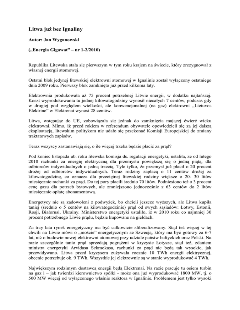 Litwa już bez Ignaliny Autor: Jan Wyganowski („Energia Gigawat” – nr 1-2/2010) Republika Litewska stała się pierwszym w tym roku krajem na świecie, który zrezygnował z własnej energii atomowej. Ostatni blok jedynej litewskiej elektrowni atomowej w Ignalinie został wyłączony ostatniego dnia 2009 roku. Pierwszy blok zamknięto już przed kilkoma laty. Elektrownia produkowała aż 75 procent potrzebnej Litwie energii, w dodatku najtańszej. Koszt wyprodukowania tu jednej kilowatogodziny wynosił niecałych 7 centów, podczas gdy w drugiej pod względem wielkości, ale konwencjonalnej (na gaz) elektrowni „Lietuvos Elektrine” w Elektrenai wynosi 28 centów. Litwa, wstępując do UE, zobowiązała się jednak do zamknięcia mającej ćwierć wieku elektrowni. Mimo, iż przed rokiem w referendum obywatele opowiedzieli się za jej dalszą eksploatacją, litewskim politykom nie udało się przekonać Komisji Europejskiej do zmiany traktatowych zapisów. Teraz wszyscy zastanawiają się, o ile więcej trzeba będzie płacić za prąd? Pod koniec listopada ub. roku litewska komisja ds. regulacji energetyki, ustaliła, że od lutego 2010 rachunki za energię elektryczną dla przemysłu powiększą się o jedną piątą, dla odbiorców indywidualnych o jedną trzecią. Tyle tylko, że przemysł już płacił o 20 procent drożej od odbiorców indywidualnych. Teraz rodziny zapłacą o 11 centów drożej za kilowatogodzinę, co oznacza dla przeciętnej litewskiej rodziny większe o 20- 30 litów miesięcznie rachunki za prąd. Do tej pory płacili średnio 70 litów. Podniesiono też o 3 procent cenę gazu dla potrzeb bytowych, ale zmniejszono jednocześnie z 63 centów do 2 litów miesięcznie opłatę abonamentową. Energetycy nie są zadowoleni z podwyżek, bo chcieli jeszcze wyższych, ale Litwa kupiła taniej (średnio o 5 centów na kilowatogodzinie) prąd od swych sąsiadów: Łotwy, Estonii, Rosji, Białorusi, Ukrainy. Ministerstwo energetyki ustaliło, iż w 2010 roku co najmniej 30 procent potrzebnego Liwie prądu, będzie kupowane na giełdach. Za trzy lata rynek energetyczny ma być całkowicie zliberalizowany. Stąd też więcej w tej chwili na Liwie mówi o „moście” energetycznym ze Szwecją, który ma być gotowy za 6-7 lat, niż o budowie nowej elektrowni atomowej przy udziale państw bałtyckich oraz Polski. Na razie szczególnie tanio prąd sprzedają pogrążeni w kryzysie Łotysze, stąd też, zdaniem ministra energetyki Arvidasa Sekmokasa, rachunki za prąd nie będą tak wysokie, jak przewidywano. Litwa przed kryzysem zużywała rocznie 10 TWh energii elektrycznej, obecnie potrzebuje ok. 9 TWh. Wszystkie jej elektrownie są w stanie wyprodukować 4 TWh. Największym rodzimym dostawcą energii będą Elektrenai. Na razie pracuje tu osiem turbin na gaz i – jak twierdzi kierownictwo spółki - może ona już wyprodukować 1800 MW, tj. o 500 MW więcej od wyłączonego właśnie reaktora w Ignalinie. Problemem jest tylko wysoki koszt wytwarzania. Zniknie on za dwa lata, gdy hiszpańskie konsorcjum, zainstaluje dziewiąty energooszczędny blok energetyczny. Zużycie paliwa, czyli gazu, do wyprodukowania prądu, zmniejszy się aż o 30 procent. Koszt przedsięwzięcia oscyluje wokół 1,1mld litów, ale połowę wykłada Europejski Bank Odbudowy i Rozwoju, część zostanie sfinansowana ze specjalnego funduszu zamykanej Ignaliny, a resztę wyłoży sama elektrownia z zysku i pożyczek. Elektrenai będą też przygotowywać się do odbioru energii z elektrowni wiatrowych, Trwa też budowa szeregu małych elektrowni i ciepłowni na biogaz. Tylko spółka „Litesko” ma już dziesięć takich kotłów o łącznej mocy 51 MW. Są one m.in. w Marijampole, Vilkaviszkis, Pałanga, Kybartai, Birżai. Teraz spółka wykłada 69 mln litów na budowę sporej elektrociepłowni w Alytus. Będzie potrzeba tam 170 tysięcy biopaliwa rocznie. Inwestycja zakończy się w 2012 roku. Spółka otrzymała na ten cel 18 mln litów z funduszy unijnych. Po oddaniu do użytku zakładu, zanieczyszczenie powietrza w CO2 zmniejszy się w tym mieście aż o 44 procent. Dalsze regulacje cenowe prądu i gazu będą zależały od cen ropy na rynkach światowych. Jeżeli spadną, spadnie i cena za energię. Od 2010 roku ceny energii elektrycznej i gazu będą na Litwie ustalane dwa razy do roku. Na razie wszyscy martwią się, jak obecne regulacje odbiją się na cenach produktów. A tanio na Litwie - po podwyższeniu w 2009 roku dwa razy stawki VAT - nie jest. Tymczasem Sejm przyjął 26 listopada br. ustawy zmniejszające pensje, emerytury, zasiłki dla bezrobotnych. Na nic zdały się liczne protesty i manifestacje. Mają one powrócić do przedkryzysowego stanu, gdy poprawi się sytuacja ekonomiczna kraju. Inna sprawa, że Litwa powoli wychodzi z kryzysu. Już w trzecim kwartale 2009 roku odnotowano - w porównaniu do drugiego - aż sześcioprocentowy wzrost gospodarczy. Te tendencje utrzymały się także w IV kwartale 2009 r.