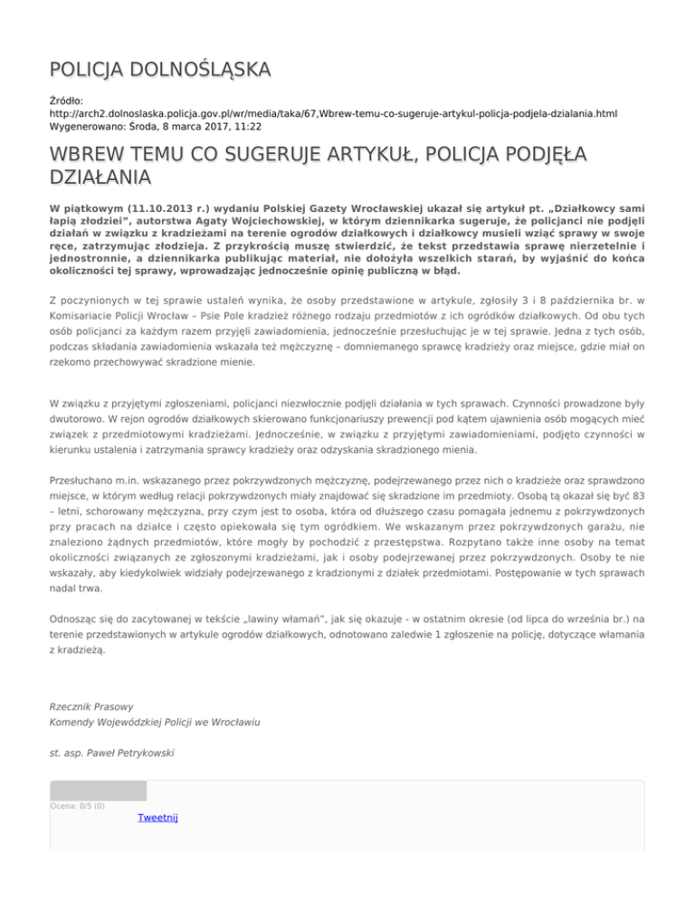 POLICJA DOLNOŚLĄSKA Źródło: http://arch2.dolnoslaska.policja.gov.pl/wr/media/taka/67,Wbrew-temu-co-sugeruje-artykul-policja-podjela-dzialania.html Wygenerowano: Środa, 8 marca 2017, 11:22 WBREW TEMU CO SUGERUJE ARTYKUŁ, POLICJA PODJĘŁA DZIAŁANIA W piątkowym (11.10.2013 r.) wydaniu Polskiej Gazety Wrocławskiej ukazał się artykuł pt. „Działkowcy sami łapią złodziei”, autorstwa Agaty Wojciechowskiej, w którym dziennikarka sugeruje, że policjanci nie podjęli działań w związku z kradzieżami na terenie ogrodów działkowych i działkowcy musieli wziąć sprawy w swoje ręce, zatrzymując złodzieja. Z przykrością muszę stwierdzić, że tekst przedstawia sprawę nierzetelnie i jednostronnie, a dziennikarka publikując materiał, nie dołożyła wszelkich starań, by wyjaśnić do końca okoliczności tej sprawy, wprowadzając jednocześnie opinię publiczną w błąd. Z poczynionych w tej sprawie ustaleń wynika, że osoby przedstawione w artykule, zgłosiły 3 i 8 października br. w Komisariacie Policji Wrocław – Psie Pole kradzież różnego rodzaju przedmiotów z ich ogródków działkowych. Od obu tych osób policjanci za każdym razem przyjęli zawiadomienia, jednocześnie przesłuchując je w tej sprawie. Jedna z tych osób, podczas składania zawiadomienia wskazała też mężczyznę – domniemanego sprawcę kradzieży oraz miejsce, gdzie miał on rzekomo przechowywać skradzione mienie. W związku z przyjętymi zgłoszeniami, policjanci niezwłocznie podjęli działania w tych sprawach. Czynności prowadzone były dwutorowo. W rejon ogrodów działkowych skierowano funkcjonariuszy prewencji pod kątem ujawnienia osób mogących mieć związek z przedmiotowymi kradzieżami. Jednocześnie, w związku z przyjętymi zawiadomieniami, podjęto czynności w kierunku ustalenia i zatrzymania sprawcy kradzieży oraz odzyskania skradzionego mienia. Przesłuchano m.in. wskazanego przez pokrzywdzonych mężczyznę, podejrzewanego przez nich o kradzieże oraz sprawdzono miejsce, w którym według relacji pokrzywdzonych miały znajdować się skradzione im przedmioty. Osobą tą okazał się być 83 – letni, schorowany mężczyzna, przy czym jest to osoba, która od dłuższego czasu pomagała jednemu z pokrzywdzonych przy pracach na działce i często opiekowała się tym ogródkiem. We wskazanym przez pokrzywdzonych garażu, nie znaleziono żądnych przedmiotów, które mogły by pochodzić z przestępstwa. Rozpytano także inne osoby na temat okoliczności związanych ze zgłoszonymi kradzieżami, jak i osoby podejrzewanej przez pokrzywdzonych. Osoby te nie wskazały, aby kiedykolwiek widziały podejrzewanego z kradzionymi z działek przedmiotami. Postępowanie w tych sprawach nadal trwa. Odnosząc się do zacytowanej w tekście „lawiny włamań”, jak się okazuje - w ostatnim okresie (od lipca do września br.) na terenie przedstawionych w artykule ogrodów działkowych, odnotowano zaledwie 1 zgłoszenie na policję, dotyczące włamania z kradzieżą. Rzecznik Prasowy Komendy Wojewódzkiej Policji we Wrocławiu st. asp. Paweł Petrykowski Ocena: 0/5 (0) Tweetnij