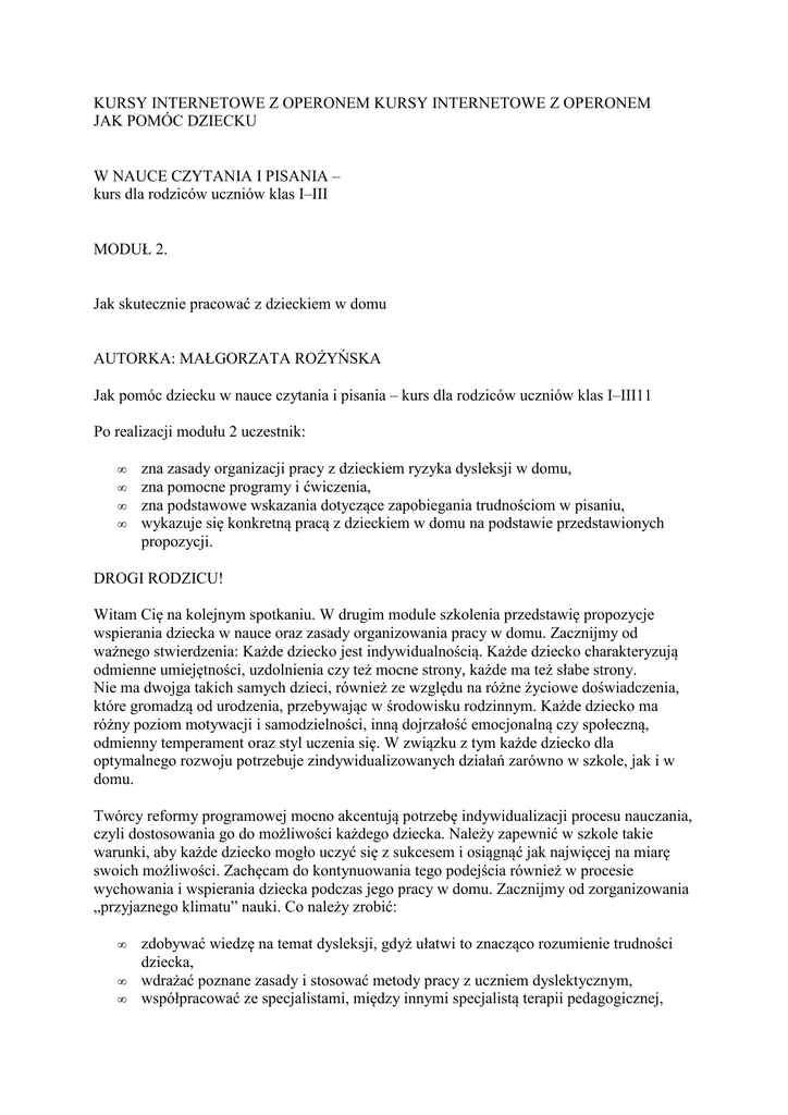 KURSY INTERNETOWE Z OPERONEM KURSY INTERNETOWE Z OPERONEM JAK POMÓC DZIECKU W NAUCE CZYTANIA I PISANIA – kurs dla rodziców uczniów klas I–III MODUŁ 2. Jak skutecznie pracować z dzieckiem w domu AUTORKA: MAŁGORZATA ROŻYŃSKA Jak pomóc dziecku w nauce czytania i pisania – kurs dla rodziców uczniów klas I–III11 Po realizacji modułu 2 uczestnik: • • • • zna zasady organizacji pracy z dzieckiem ryzyka dysleksji w domu, zna pomocne programy i ćwiczenia, zna podstawowe wskazania dotyczące zapobiegania trudnościom w pisaniu, wykazuje się konkretną pracą z dzieckiem w domu na podstawie przedstawionych propozycji. DROGI RODZICU! Witam Cię na kolejnym spotkaniu. W drugim module szkolenia przedstawię propozycje wspierania dziecka w nauce oraz zasady organizowania pracy w domu. Zacznijmy od ważnego stwierdzenia: Każde dziecko jest indywidualnością. Każde dziecko charakteryzują odmienne umiejętności, uzdolnienia czy też mocne strony, każde ma też słabe strony. Nie ma dwojga takich samych dzieci, również ze względu na różne życiowe doświadczenia, które gromadzą od urodzenia, przebywając w środowisku rodzinnym. Każde dziecko ma różny poziom motywacji i samodzielności, inną dojrzałość emocjonalną czy społeczną, odmienny temperament oraz styl uczenia się. W związku z tym każde dziecko dla optymalnego rozwoju potrzebuje zindywidualizowanych działań zarówno w szkole, jak i w domu. Twórcy reformy programowej mocno akcentują potrzebę indywidualizacji procesu nauczania, czyli dostosowania go do możliwości każdego dziecka. Należy zapewnić w szkole takie warunki, aby każde dziecko mogło uczyć się z sukcesem i osiągnąć jak najwięcej na miarę swoich możliwości. Zachęcam do kontynuowania tego podejścia również w procesie wychowania i wspierania dziecka podczas jego pracy w domu. Zacznijmy od zorganizowania „przyjaznego klimatu” nauki. Co należy zrobić: • • • zdobywać wiedzę na temat dysleksji, gdyż ułatwi to znacząco rozumienie trudności dziecka, wdrażać poznane zasady i stosować metody pracy z uczniem dyslektycznym, współpracować ze specjalistami, między innymi specjalistą terapii pedagogicznej, • • • zapewnić dziecku odpowiednie formy pomocy psychologiczno-pedagogicznej, w tym udział w zajęciach korekcyjno-kompensacyjnych, systematycznie współpracować z wychowawcą dziecka, korzystać ze wskazówek do pracy z dzieckiem dyslektycznym. SPECYFIKA PRACY Z DZIEĆMI RYZYKA DYSLEKSJI Drogi Rodzicu, już wiesz, że dziecko powinno systematycznie pracować w domu. Czy zastanawiałeś się nad tym, co jest ważne dla dziecka ryzyka dysleksji w organizowaniu jego pracy w domu? Jeśli nie sugerowałeś się dotąd żadnymi wskazaniami, zastosuj w praktyce poniższe, sprawdzone przez innych rodziców zasady i strategie. ZASADY I STRATEGIE ORGANIZACJI PRACY W DOMU Z DZIECKIEM RYZYKA DYSLEKSJI stały rozkład dnia Młodsze dzieci potrzebują dobrej organizacji dnia, czyli dobrego rozplanowania czasu pracy i zabawy. Istotne jest utrzymanie tej samej pory wstawania, spożywania posiłków, wykonywania obowiązków (prac domowych), zabawy, kładzenia się spać. Dziecko wymaga życia w określonym rytmie i ładzie. Tylko wtedy jego organizm, w szczególności układ nerwowy, ma czas na regenerację. czas nauki Najlepiej, aby zadania (prace domowe) były wykonywane przez dziecko zawsze o tej samej porze dnia. Najkorzystniejszy czas na naukę to godziny 9.00–12.00 oraz 16.00–18.00, ale jest to także sprawa indywidualna. Warto zaobserwować, kiedy w ciągu dnia dziecko ma wyż intelektualny, czyli wykazuje się dobrą aktywnością umysłową i jest gotowe do wykonywania zadań, a kiedy następuje u niego spadek gotowości uczenia się, czyli pojawia się niż intelektualny. Należy pamiętać o zaplanowaniu odpoczynku po nauce w szkole. Zrelaksowane dziecko szybciej zapamiętuje i łatwiej skupia uwagę. miejsce nauki Zadania (prace domowe) dziecko powinno wykonywać zawsze w tym samym miejscu, najlepiej przy swoim biurku. Wpływa to zarówno na jego gotowość do nauki, jak i poczucie bezpieczeństwa. Pomieszczenie musi być dobrze wywietrzone. Należy zadbać o ciszę i spokój (wyłączone radio i telefon, zamknięte okna, jeśli dochodzą odgłosy z otoczenia). W pobliżu miejsca nauki można umieścić zieloną roślinę. przygotowanie biurka i pomocy W miejscu nauki musi panować porządek (schowane wszystkie przedmioty i zabawki, które mogą dziecko rozpraszać, na biurku wyłożone tylko te pomoce, które będą potrzebne do wykonania danego zadania). dziecko „po szkole” Po szkole dziecko ma czas na rzeczywisty i adekwatny do wieku odpoczynek. Najlepszą formą odpoczynku dla dziecka po zajęciach w szkole jest wyjście na krótki spacer lub naplac zabaw, by mogło zrelaksować się na świeżym powietrzu. Najbardziej niewskazaną formą jest siedzenie przed telewizorem bądź komputerem. Zachęcam do ograniczania dziecku oglądania telewizji bądź grania w gry komputerowe. Zajęcia te powinny się odbywać we wcześniej zaplanowanym czasie i być traktowane jako nagroda (dozowana w ścisłych granicach czasowych). dziecko „przed nauką” Należy rozpocząć od ćwiczeń przygotowawczych, które są rozgrzewką dla mózgu. Do takich ćwiczeń zaliczamy zabawy ruchowe, masażyk lub gimnastyka ręki, ćwiczenia oczu, zabawy słowne w skojarzenia. Należy pamiętać, że zabawy powinny być krótkie i przyjemne, na przykład: • ćwiczenia ruchowe przy muzyce (podskoki, marsz w miejscu), • kilka głębokich oddechów przy otwartym oknie, • odgadnięcie zagadki lub zaśpiewanie piosenki, • patrzenie w dal przez „lornetkę” z dłoni lub ćwiczenia oczu. dieta dziecka Prawidłowa dieta dziecka musi być bogata w białko i witaminy oraz wielonienasycone kwasy tłuszczowe. Przystępując do nauki, dziecko powinno być syte i napojone, a „podręką” powinna być woda mine