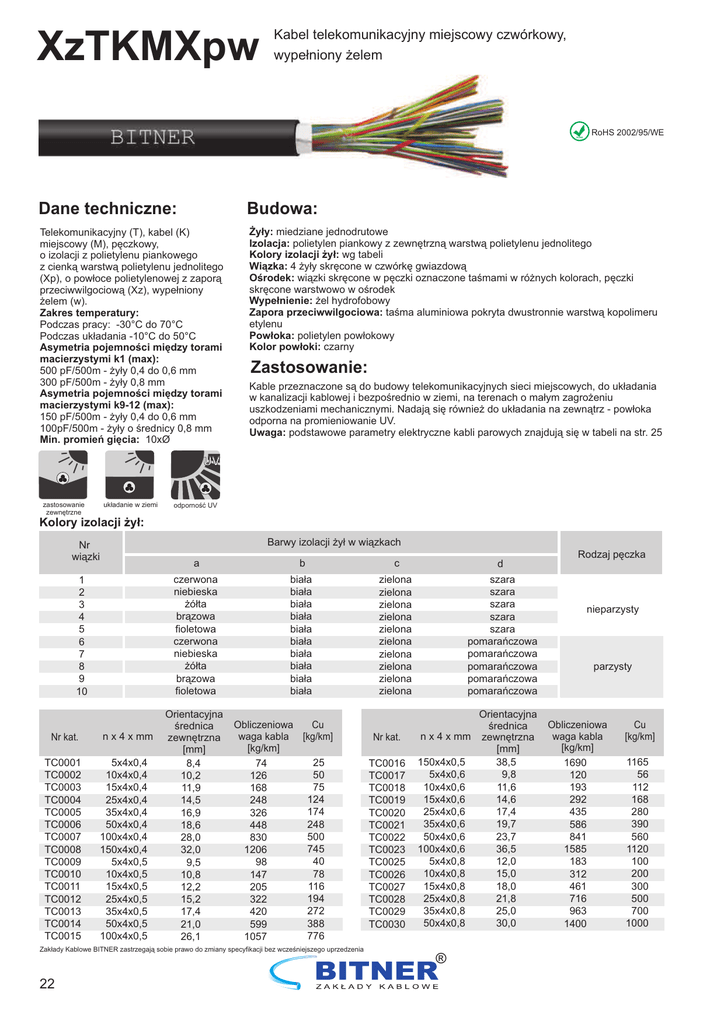 XzTKMXpw Kabel telekomunikacyjny miejscowy czwórkowy, wypełniony żelem RoHS RoHS 2002/95/WE Dane techniczne: Budowa: Telekomunikacyjny (T), kabel (K) miejscowy (M), pęczkowy, o izolacji z polietylenu piankowego z cienką warstwą polietylenu jednolitego (Xp), o powłoce polietylenowej z zaporą przeciwwilgociową (Xz), wypełniony żelem (w). Zakres temperatury: Podczas pracy: -30°C do 70°C Podczas układania -10°C do 50°C Asymetria pojemności między torami macierzystymi k1 (max): 500 pF/500m - żyły 0,4 do 0,6 mm 300 pF/500m - żyły 0,8 mm Asymetria pojemności między torami macierzystymi k9-12 (max): 150 pF/500m - żyły 0,4 do 0,6 mm 100pF/500m - żyły o średnicy 0,8 mm Min. promień gięcia: 10xØ Żyły: miedziane jednodrutowe Izolacja: polietylen piankowy z zewnętrzną warstwą polietylenu jednolitego Kolory izolacji żył: wg tabeli Wiązka: 4 żyły skręcone w czwórkę gwiazdową Ośrodek: wiązki skręcone w pęczki oznaczone taśmami w różnych kolorach, pęczki skręcone warstwowo w ośrodek Wypełnienie: żel hydrofobowy Zapora przeciwwilgociowa: taśma aluminiowa pokryta dwustronnie warstwą kopolimeru etylenu Powłoka: polietylen powłokowy Kolor powłoki: czarny Zastosowanie: Kable przeznaczone są do budowy telekomunikacyjnych sieci miejscowych, do układania w kanalizacji kablowej i bezpośrednio w ziemi, na terenach o małym zagrożeniu uszkodzeniami mechanicznymi. Nadają się również do układania na zewnątrz - powłoka odporna na promieniowanie UV. Uwaga: podstawowe parametry elektryczne kabli parowych znajdują się w tabeli na str. 25 UV zastosowanie zewnętrzne układanie w ziemi odporność UV Kolory izolacji żył: Barwy izolacji żył w wiązkach Nr wiązki 1 2 3 4 5 6 7 8 9 10 Nr kat. TC0001 TC0002 TC0003 TC0004 TC0005 TC0006 TC0007 TC0008 TC0009 TC0010 TC0011 TC0012 TC0013 TC0014 TC0015 n x 4 x mm 5x4x0,4 10x4x0,4 15x4x0,4 25x4x0,4 35x4x0,4 50x4x0,4 100x4x0,4 150x4x0,4 5x4x0,5 10x4x0,5 15x4x0,5 25x4x0,5 35x4x0,5 50x4x0,5 100x4x0,5 a b c d czerwona niebieska żółta brązowa fioletowa czerwona niebieska żółta brązowa fioletowa biała biała biała biała biała biała biała biała biała biała zielona zielona zielona zielona zielona zielona zielona zielona zielona zielona szara szara szara szara szara pomarańczowa pomarańczowa pomarańczowa pomarańczowa pomarańczowa Orientacyjna średnica zewnętrzna [mm] 8,4 10,2 11,9 14,5 16,9 18,6 28,0 32,0 9,5 10,8 12,2 15,2 17,4 21,0 26,1 Cu Obliczeniowa waga kabla [kg/km] [kg/km] 25 74 50 126 75 168 124 248 174 326 248 448 500 830 745 1206 40 98 78 147 116 205 194 322 272 420 388 599 776 1057 Zakłady Kablowe BITNER zastrzegają sobie prawo do zmiany specyfikacji bez wcześniejszego uprzedzenia 22 Nr kat. TC0016 TC0017 TC0018 TC0019 TC0020 TC0021 TC0022 TC0023 TC0025 TC0026 TC0027 TC0028 TC0029 TC0030 Orientacyjna średnica n x 4 x mm zewnętrzna [mm] 38,5 150x4x0,5 9,8 5x4x0,6 11,6 10x4x0,6 14,6 15x4x0,6 17,4 25x4x0,6 19,7 35x4x0,6 23,7 50x4x0,6 100x4x0,6 36,5 5x4x0,8 12,0 15,0 10x4x0,8 18,0 15x4x0,8 21,8 25x4x0,8 25,0 35x4x0,8 30,0 50x4x0,8 ® Rodzaj pęczka nieparzysty parzysty Obliczeniowa waga kabla [kg/km] 1690 120 193 292 435 586 841 1585 183 312 461 716 963 1400 Cu [kg/km] 1165 56 112 168 280 390 560 1120 100 200 300 500 700 1000