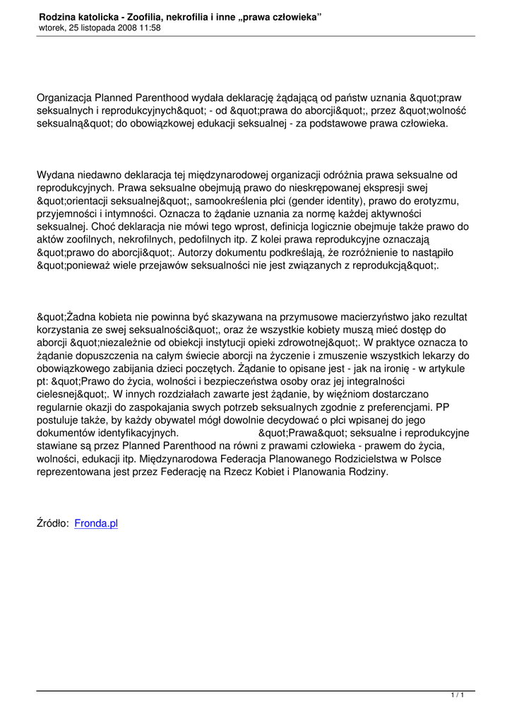 Rodzina katolicka - Zoofilia, nekrofilia i inne „prawa człowieka” wtorek, 25 listopada 2008 11:58 Organizacja Planned Parenthood wydała deklarację żądającą od państw uznania "praw seksualnych i reprodukcyjnych" - od "prawa do aborcji", przez "wolność seksualną" do obowiązkowej edukacji seksualnej - za podstawowe prawa człowieka. Wydana niedawno deklaracja tej międzynarodowej organizacji odróżnia prawa seksualne od reprodukcyjnych. Prawa seksualne obejmują prawo do nieskrępowanej ekspresji swej "orientacji seksualnej", samookreślenia płci (gender identity), prawo do erotyzmu, przyjemności i intymności. Oznacza to żądanie uznania za normę każdej aktywności seksualnej. Choć deklaracja nie mówi tego wprost, definicja logicznie obejmuje także prawo do aktów zoofilnych, nekrofilnych, pedofilnych itp. Z kolei prawa reprodukcyjne oznaczają "prawo do aborcji". Autorzy dokumentu podkreślają, że rozróżnienie to nastąpiło "ponieważ wiele przejawów seksualności nie jest związanych z reprodukcją". "Żadna kobieta nie powinna być skazywana na przymusowe macierzyństwo jako rezultat korzystania ze swej seksualności", oraz że wszystkie kobiety muszą mieć dostęp do aborcji "niezależnie od obiekcji instytucji opieki zdrowotnej". W praktyce oznacza to żądanie dopuszczenia na całym świecie aborcji na życzenie i zmuszenie wszystkich lekarzy do obowiązkowego zabijania dzieci poczętych. Żądanie to opisane jest - jak na ironię - w artykule pt: "Prawo do życia, wolności i bezpieczeństwa osoby oraz jej integralności cielesnej". W innych rozdziałach zawarte jest żądanie, by więźniom dostarczano regularnie okazji do zaspokajania swych potrzeb seksualnych zgodnie z preferencjami. PP postuluje także, by każdy obywatel mógł dowolnie decydować o płci wpisanej do jego dokumentów identyfikacyjnych. "Prawa" seksualne i reprodukcyjne stawiane są przez Planned Parenthood na równi z prawami człowieka - prawem do życia, wolności, edukacji itp. Międzynarodowa Federacja Planowanego Rodzicielstwa w Polsce reprezentowana jest przez Federację na Rzecz Kobiet i Planowania Rodziny. Źródło: Fronda.pl 1/1