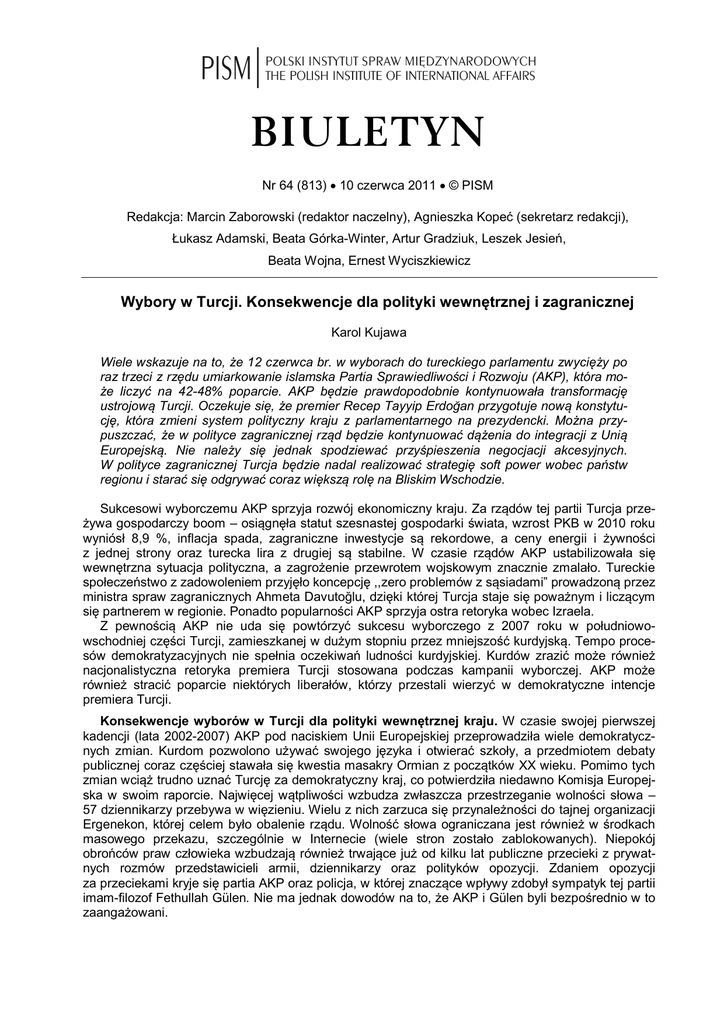 BIULETYN Nr 64 (813) 10 czerwca 2011 © PISM Redakcja: Marcin Zaborowski (redaktor naczelny), Agnieszka Kopeć (sekretarz redakcji), Łukasz Adamski, Beata Górka-Winter, Artur Gradziuk, Leszek Jesień, Beata Wojna, Ernest Wyciszkiewicz Wybory w Turcji. Konsekwencje dla polityki wewnętrznej i zagranicznej Karol Kujawa Wiele wskazuje na to, że 12 czerwca br. w wyborach do tureckiego parlamentu zwycięży po raz trzeci z rzędu umiarkowanie islamska Partia Sprawiedliwości i Rozwoju (AKP), która może liczyć na 42-48% poparcie. AKP będzie prawdopodobnie kontynuowała transformację ustrojową Turcji. Oczekuje się, że premier Recep Tayyip Erdoğan przygotuje nową konstytucję, która zmieni system polityczny kraju z parlamentarnego na prezydencki. Można przypuszczać, że w polityce zagranicznej rząd będzie kontynuować dążenia do integracji z Unią Europejską. Nie należy się jednak spodziewać przyśpieszenia negocjacji akcesyjnych. W polityce zagranicznej Turcja będzie nadal realizować strategię soft power wobec państw regionu i starać się odgrywać coraz większą rolę na Bliskim Wschodzie. Sukcesowi wyborczemu AKP sprzyja rozwój ekonomiczny kraju. Za rządów tej partii Turcja przeżywa gospodarczy boom – osiągnęła statut szesnastej gospodarki świata, wzrost PKB w 2010 roku wyniósł 8,9 %, inflacja spada, zagraniczne inwestycje są rekordowe, a ceny energii i żywności z jednej strony oraz turecka lira z drugiej są stabilne. W czasie rządów AKP ustabilizowała się wewnętrzna sytuacja polityczna, a zagrożenie przewrotem wojskowym znacznie zmalało. Tureckie społeczeństwo z zadowoleniem przyjęło koncepcję ,,zero problemów z sąsiadami” prowadzoną przez ministra spraw zagranicznych Ahmeta Davutoğlu, dzięki której Turcja staje się poważnym i liczącym się partnerem w regionie. Ponadto popularności AKP sprzyja ostra retoryka wobec Izraela. Z pewnością AKP nie uda się powtórzyć sukcesu wyborczego z 2007 roku w południowowschodniej części Turcji, zamieszkanej w dużym stopniu przez mniejszość kurdyjską. Tempo procesów demokratyzacyjnych nie spełnia oczekiwań ludności kurdyjskiej. Kurdów zrazić może również nacjonalistyczna retoryka premiera Turcji stosowana podczas kampanii wyborczej. AKP może również stracić poparcie niektórych liberałów, którzy przestali wierzyć w demokratyczne intencje premiera Turcji. Konsekwencje wyborów w Turcji dla polityki wewnętrznej kraju. W czasie swojej pierwszej kadencji (lata 2002-2007) AKP pod naciskiem Unii Europejskiej przeprowadziła wiele demokratycznych zmian. Kurdom pozwolono używać swojego języka i otwierać szkoły, a przedmiotem debaty publicznej coraz częściej stawała się kwestia masakry Ormian z początków XX wieku. Pomimo tych zmian wciąż trudno uznać Turcję za demokratyczny kraj, co potwierdziła niedawno Komisja Europejska w swoim raporcie. Najwięcej wątpliwości wzbudza zwłaszcza przestrzeganie wolności słowa – 57 dziennikarzy przebywa w więzieniu. Wielu z nich zarzuca się przynależności do tajnej organizacji Ergenekon, której celem było obalenie rządu. Wolność słowa ograniczana jest również w środkach masowego przekazu, szczególnie w Internecie (wiele stron zostało zablokowanych). Niepokój obrońców praw człowieka wzbudzają również trwające już od kilku lat publiczne przecieki z prywatnych rozmów przedstawicieli armii, dziennikarzy oraz polityków opozycji. Zdaniem opozycji za przeciekami kryje się partia AKP oraz policja, w której znaczące wpływy zdobył sympatyk tej partii imam-filozof Fethullah Gülen. Nie ma jednak dowodów na to, że AKP i Gülen byli bezpośrednio w to zaangażowani. 2473 Polski Instytut Spraw Międzynarodowych Przypuszcza się, że w kontekście społecznym po wyborach premier Turcji nadal będzie odwoływać się do wartości islamskich. Prawdopodobnie nie zmieni swojego stanowiska wobec ograniczeń w środkach masowego przekazu. Spodziewać się należy, że AKP przeforsuje kolejne kontrowersyjne ustawy, które mogą ograniczyć wolność słowa w Turcji. Wprowadzenie tych zmian może spowodować demonstracje opozycji. W kwestiach wewnętrznych premier nie będzie skłonny ustępować Kurdom, twierdzi bowiem, że problem kurdyjski został już rozwiązany. Natomiast w wymiarze ekonomicznym pozostanie zwolennikiem gospodarki wolnorynkowej. Nie należy się obawiać wprowadzenia w Turcji rygorystycznego prawa islamskiego. Wywołałoby to bowiem duży sprzeciw nie tylko wśród zwolenników świeckiego państwa, ale i samych wyborców AKP. Przypuszcza się, że po wyborach premier Turcji będzie dążyć do przeforsowania w parlamencie projektu nowej konstytucji, która zwiększy uprawnienia prezydenta. Zdaniem opozycji po upływie kadencji obecnego prezydenta Abdullaha Güla premier chciałby zająć jego miejsce i rządzić przez następne lata. Aby móc przeforsować projekt konstytucji bez poparcia opozycji AKP będzie potrzebowała 330 ze 550 miejsc w parlamencie. W uzyskaniu takiego wyniku AKP może pomóc najwyższy w Europie 10 procentowy próg wyborczy, z przekroczeniem którego trudności może mieć skrajnie prawicowa Partia Ruchu Narodowego (MHP). Porażka MHP oznaczać będzie więcej miejsc w parlamencie dla AKP. Konsekwencje wyborów w Turcji dla polityki zagranicznej. Jednym z priorytetów tureckiej polityki zagranicznej po wyborach pozostanie członkostwo w Unii Europejskiej. Nie jest jednak pewne czy AKP przyspieszy prace pozwalające sprawniej pertraktować warunki członkostwa Turcji w UE i szybciej zamykać kolejne rozdziały negocjacyjne. Punktem spornym rozmów pozostaje kwestia cypryjska. Ustępstwa Turcji w tej kwestii wydają się mało prawdopodobne, ponieważ w szeregach AKP znajduje się wielu polityków, którzy wyrażają nacjonalistyczne poglądy i sprzeciwiają się idei zjednoczenia Cypru. Ewentualna zgoda na ustępstwa w tej mierze może narazić AKP na utrat