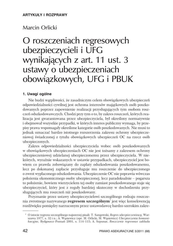 ARTYKU£Y I ROZPRAWY ARTYKU£Y I ROZPRAWY Marcin Orlicki O roszczeniach regresowych ubezpieczycieli i UFG wynikaj¹cych z art. 11 ust. 3 ustawy o ubezpieczeniach obowi¹zkowych, UFG i PBUK 1. Uwagi ogólne Nie budzi w¹tpliwoœci, ¿e zasadniczym celem obowi¹zkowych ubezpieczeñ odpowiedzialnoœci cywilnej jest ochrona interesów maj¹tkowych osób poszkodowanych poprzez zapewnienie realizacji przys³uguj¹cych tym osobom roszczeñ odszkodowawczych. Chodzi przy tym o to, by zakres roszczeñ, których realizacja jest gwarantowana przez ubezpieczyciela, by³ okreœlony normatywnie i obejmowa³ wszystkie przypadki, w których interes publiczny wymaga, by przepisy prawa wspomaga³y okreœlone kategorie osób poszkodowanych. Nie musi to jednak oznaczaæ bardzo istotnego rozszerzenia zakresu ochrony ubezpieczeniowej œwiadczonej z tytu³u obowi¹zkowych ubezpieczeñ OC na rzecz osób ubezpieczonych. Zakres odpowiedzialnoœci ubezpieczyciela wobec osób poszkodowanych w obowi¹zkowych ubezpieczeniach OC nie jest to¿samy z zakresem ochrony ubezpieczeniowej udzielanej ubezpieczonemu przez ubezpieczyciela. W niektórych, wyraŸnie wskazanych w ustawie przypadkach, ubezpieczyciel jest bowiem co prawda zobowi¹zany do zap³aty odszkodowania poszkodowanemu, lecz po dokonanej zap³acie przys³uguje mu roszczenie do ubezpieczonego o zwrot wyp³aconego odszkodowania. Ubezpieczenie OC nie poprawia wówczas po³o¿enia ekonomicznego osoby ubezpieczonej, lecz paradoksalnie – pogarsza to po³o¿enie, bowiem wierzycielem tej osoby zamiast poszkodowanego staje siê ubezpieczyciel, który jest z regu³y bardziej skuteczny w dochodzeniu przys³uguj¹cych mu roszczeñ ni¿ poszkodowany. Przyznanie przez ustawy ubezpieczycielowi szczególnego rodzaju roszczenia zwrotnego nazywanego regresem szczególnym1 jest wiêc konsekwencj¹ rozdŸwiêku pomiêdzy narzuconym przez ustawodawcê bardzo szerokim zakre1 42 O istocie regresu szczególnego najszerzej pisali: T. Sangowski, Regres ubezpieczeniowy, Warszawa 1977, s. 32 i n.; A. W¹siewicz (opr. M. Orlicki, M. W¹siewicz) Ubezpieczenia komunikacyjne, Bydgoszcz–Poznañ 2001, s. 114–115; A. Szpunar, Roszczenie regresowe zak³adu PRAWO ASEKURACYJNE 3/2011 (68) O roszczeniach regresowych ubezpieczycieli i UFG wynikaj¹cych z art. 11 ust. 3 sem odpowiedzialnoœci ubezpieczyciela wobec poszkodowanych a ograniczonym zakresem ochrony ubezpieczeniowej œwiadczonej dla ubezpieczonego2. Jego charakter prawny jest zupe³nie odmienny od typowego regresu ubezpieczeniowego, o którym mowa w art. 828 k.c. Racj¹ bytu regresu szczególnego jest za³o¿enie, ¿e wadliwoœæ zachowañ ubezpieczaj¹cego lub ubezpieczonego nie powinna w ¿adnym razie poci¹gaæ za sob¹ pozbawienia poszkodowanego roszczeñ wobec ubezpieczyciela. Mechanizm ochrony interesów osób poszkodowanych poprzez obowi¹zkowe ubezpieczenia OC by³by w takim przypadku ca³kowicie nieskuteczny, bowiem poszkodowani mogliby ¿¹daæ od ubezpieczyciela odszkodowañ wy³¹cznie wówczas, gdy zachowanie sprawcy szkody nie by³o w ogóle wadliwe czy te¿ nie by³o wadliwe w szczególnym stopniu. Aby obowi¹zkowe ubezpieczenia OC nie straci³y w takim przypadku swego spo³ecznego i gospodarczego znaczenia, niezbêdne by³oby bardzo istotne rozszerzenie zakresu dzia³añ Ubezpieczeniowego Funduszu Gwarancyjnego. Najczêœciej opisywanymi w literaturze przypadkami regresu szczególnego s¹ te, które zosta³y unormowane w art. 43 ustawy o ubezpieczeniach obowi¹zkowych, Ubezpieczeniowym Funduszu Gwarancyjnym i Polskim Biurze 3 Ubezpieczycieli Komunikacyjnych (w odniesieniu do obowi¹zkowego ubezpieczenia odpowiedzialnoœci cywilnej posiadaczy pojazdów mechanicznych) i w art. 58 tej¿e ustawy (w odniesieniu do obowi¹zkowego ubezpieczenia rolników). Przedmiotem analizy zawartej w niniejszym artykule bêdzie norma prawna zamieszczona w art. 11 ust. 3 ustawy o ubezpieczeniach obowi¹zkowych, UFG i PBUK. Dotyczy ona roszczeñ regresowych ubezpieczyciela w obowi¹zkowych ubezpieczeniach OC, o których mowa w art. 4 pkt 4 ustawy o ubezpieczeniach obowi¹zkowych, UFG i PBUK (tzn. obowi¹zkowych ubezpieczeniach OC wynikaj¹cych z przepisów odrêbnych ustaw lub umów miêdzynarodowych ratyfikowanych przez Rzeczpospolit¹ Polsk¹, nak³adaj¹cych na okreœlone podmioty obowi¹zek zawarcia umowy ubezpieczenia). W szczególnoœci nale¿y udzieliæ odpowiedzi na istotne dla praktyki ubezpieczeniowej pytania: • Jakie jest uzasadnienie dla obowi¹zkowego w³¹czenia w zakres odpowiedzialnoœci ubezpieczyciela wzglêdem poszkodowanych, szkód wyrz¹dzonych w wyniku ra¿¹cego niedbalstwa ubezpieczonego lub osób, za które ponosi on odpowiedzialnoœæ? • Jakie jest uzasadnienie dla regresu szczególnego z art. 11 ust. 3 ustawy o ubezpieczeniach obowi¹zkowych, UFG i PBUK? 2 3 ubezpieczeñ, (w:) A. W¹siewicz (red.) Ubezpieczenia w gospodarce rynkowej, Bydgoszcz 1994, s. 106; J. Pokrzywniak, Kilka uwag o regresie nietypowym w ubezpieczeniu OC posiadaczy pojazdów mechanicznych, (w:) A. Koch, Aktualne problemy ubezpieczeñ komunikacyjnych, Warszawa 2008, s. 53 i n. J. Pokrzywniak, Kilka uwag o regresie…, s. 56–57. Ustawa z dnia 22 maja 2003 r. o ubezpieczeniach obowi¹zkowych, Ubezpieczeniowym Funduszu Gwarancyjnym i Polskim Biurze Ubezpieczycieli Komunikacyjnych (Dz. U. Nr 124, poz. 1152 z póŸn. zm.). PRAWO ASEKURACYJNE 3/2011 (68) 43 ARTYKU£Y I ROZPRAWY • Czy ryzyko ponoszenia przez ubezpieczonego odpowiedzialnoœci regresowej wobec ubezpieczyciela na podstawie art. 11 ust. 3 ustawy o ubezpieczeniach obowi¹zkowych, UFG i PBUK jest ubezpieczalne? • Czy ewentualna rezygnacja ubezpieczyciela z roszczeñ regresowych opartych na przepisie art. 11 ust. 3 ustawy o ubezpieczeniach obowi¹zkowych, UFG i PBUK rozci¹ga³aby siê w razie upad³oœci tego ubezpieczyciela na Ubezpieczeniowy Fundusz Gwarancyjny? 2. Ratio legis art. 11 ust. 2 ustawy o ubezpieczeniach obowi¹zkowych, UFG i PBUK Przepis art. 11 ust. 2 ustawy o ubezpi