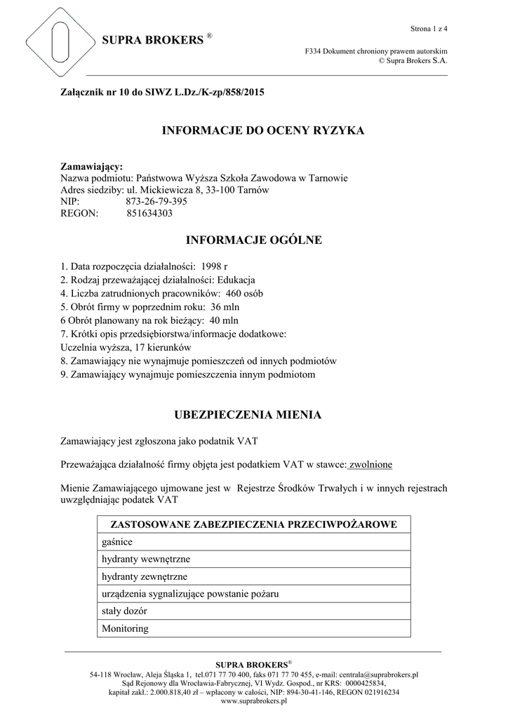 Strona 1 z 4 SUPRA BROKERS ® F334 Dokument chroniony prawem autorskim © Supra Brokers S.A. _____________________________________________________________________________ Załącznik nr 10 do SIWZ L.Dz./K-zp/858/2015 INFORMACJE DO OCENY RYZYKA Zamawiający: Nazwa podmiotu: Państwowa Wyższa Szkoła Zawodowa w Tarnowie Adres siedziby: ul. Mickiewicza 8, 33-100 Tarnów NIP: 873-26-79-395 REGON: 851634303 INFORMACJE OGÓLNE 1. Data rozpoczęcia działalności: 1998 r 2. Rodzaj przeważającej działalności: Edukacja 4. Liczba zatrudnionych pracowników: 460 osób 5. Obrót firmy w poprzednim roku: 36 mln 6 Obrót planowany na rok bieżący: 40 mln 7. Krótki opis przedsiębiorstwa/informacje dodatkowe: Uczelnia wyższa, 17 kierunków 8. Zamawiający nie wynajmuje pomieszczeń od innych podmiotów 9. Zamawiający wynajmuje pomieszczenia innym podmiotom UBEZPIECZENIA MIENIA Zamawiający jest zgłoszona jako podatnik VAT Przeważająca działalność firmy objęta jest podatkiem VAT w stawce: zwolnione Mienie Zamawiającego ujmowane jest w Rejestrze Środków Trwałych i w innych rejestrach uwzględniając podatek VAT ZASTOSOWANE ZABEZPIECZENIA PRZECIWPOŻAROWE gaśnice hydranty wewnętrzne hydranty zewnętrzne urządzenia sygnalizujące powstanie pożaru stały dozór Monitoring SUPRA BROKERS® 54-118 Wrocław, Aleja Śląska 1, tel.071 77 70 400, faks 071 77 70 455, e-mail: [email protected] Sąd Rejonowy dla Wrocławia-Fabrycznej, VI Wydz. Gospod., nr KRS: 0000425834, kapitał zakł.: 2.000.818,40 zł – wpłacony w całości, NIP: 894-30-41-146, REGON 021916234 www.suprabrokers.pl Strona 2 z 4 SUPRA BROKERS ® F334 Dokument chroniony prawem autorskim © Supra Brokers S.A. _____________________________________________________________________________ OCENA BUDYNKÓW I BUDOWLI Budynki nie stoją w zabudowie zwartej Minimalne odległości między budynkami 20 m Budynki stoją na posesji ogrodzonej Posesja jest oświetlona Konstrukcja budynków: materiały niepalne, materiały mieszane Budynki nie są wykonane z płyt warstwowych z palnym wypełnieniem np. styropianem lub pianką poliuretanową. Ściany działowe wykonane są z: materiałów palnych, materiałów palnych zabezpieczonych ognioodpornie Wystrój wnętrz budynków wykonany jest z : materiałów palnych, materiałów palnych zabezpieczonych ognioodpornie, Obiekty posiadają wymaganą i sprawną instalację odgromową Istnieją centralne wyłączniki prądu odcinające dopływ energii do wszystkich urządzeń Rodzaj istniejącej instalacji grzewczej: ogrzewanie wodne, ogrzewanie elektryczne OCENA OCHRONY PRZECIWPOŻAROWEJ Odległość od najbliższej jednostki straży pożarnej 2 km Czas dojazdu jednostek straży pożarnej 10 min Istnieje możliwość dojazdu jednostek straży pożarnej o każdej porze roku Oznakowane są: drogi pożarowe, drogi i wyjścia ewakuacyjne, lokalizacje sprzętu ppoż. Budynki są wyposażone w sprzęt ratowniczo-gaśniczy zgodnie z wymaganiami Istnieje regulamin ppoż. Pracownicy przechodzą szkolenie na wypadek pożaru i prowadzenia akcji gaśniczej Na terenie zakładu istnieje zakaz palenia Zatrudniony jest specjalista z zakresu ochrony ppoż. Przeprowadzane są regularne kontrole z ramienia straży pożarnej Prowadzi się kontrole sprzętu ratowniczo-gaśniczego Źródła dostarczenia wody: Hydranty SUPRA BROKERS® 54-118 Wrocław, Aleja Śląska 1, tel.071 77 70 400, faks 071 77 70 455, e-mail: [email protected] Sąd Rejonowy dla Wrocławia-Fabrycznej, VI Wydz. Gospod., nr KRS: 0000425834, kapitał zakł.: 2.000.818,40 zł – wpłacony w całości, NIP: 894-30-41-146, REGON 021916234 www.suprabrokers.pl Strona 3 z 4 SUPRA BROKERS ® F334 Dokument chroniony prawem autorskim © Supra Brokers S.A. _____________________________________________________________________________ INFORMACJE DODATKOWE Wskazane w SIWZ lokalizacje nie znajdują się na terenie zalewowym. Na terenie wymienionych w SIWZ lokalizacji począwszy od 1997 r. nie wystąpiła powódź. W odniesieniu do obiektów posiadających w swej konstrukcji elementy drewniane instalacja elektryczna nie jest prowadzona w niepalnych peszlach. – W odniesieniu do obiektów zawierających w konstrukcji elementy drewniane – nie zostały one zaimpregnowane ogniochronnie (impregnacja wykonana przez wyspecjalizowane firmy posiadające odpowiednie certyfikaty). ZABEZPIECZENIA PRZECIWKRADZIEŻOWE Stosowane zabezpieczenia Lokalizacja (nr poz. z tabeli nieruchomości – wykaz środków trwałych gr. I-II) Kraty lub żaluzje p/włamaniowe w oknach na parterze Poz.1 Alarm p/włamaniowy z monitoringiem Poz. 1-4 Firma ochrony Poz. 1-5 Stały dozór (jaki?) Całodobowa ochrona, w każdym budynku jeden pracownik ochrony Sposób przechowywania wartości pieniężnych Kasa pancerna przytwierdzona do podłoża Transport gotówki Ilość transportów gotówki w miesiącu, roku: 4 razy w miesiącu Rodzaj używanego środka transportu: pieszo INFORMACJA O SZKODOWOŚCI SUPRA BROKERS® 54-118 Wrocław, Aleja Śląska 1, tel.071 77 70 400, faks 071 77 70 455, e-mail: [email protected] Sąd Rejonowy dla Wrocławia-Fabrycznej, VI Wydz. Gospod., nr KRS: 0000425834, kapitał zakł.: 2.000.818,40 zł – wpłacony w całości, NIP: 894-30-41-146, REGON 021916234 www.suprabrokers.pl Strona 4 z 4 SUPRA BROKERS ® F334 Dokument chroniony prawem autorskim © Supra Brokers S.A. _____________________________________________________________________________ UBEZPIECZENIA MIENIA ZESTAWIENIE ZGŁOSZONYCH SZKÓD WG DATY ZDARZENIA PRZYPADAJĄCEJ W OKRESIE OSTATNICH 3 LAT (TJ. OD 01.01.2012) Rok Rodzaj ubezpieczenia akademicki 2011/2012 2013/2014 2013/2014 ogień ogień ogień Liczba zgłoszonych szkód 1 2 4 Kwota wypłaconych odszkodowań 38 440,08 zł 18 879,14 zł 26 653,05 zł Kwota utworzonych rezerw 0 zł 0 zł 0 zł UBEZPIECZENIA NNW ZESTAWIENIE ZGŁOSZONYCH SZKÓD WG DATY ZDARZENIA PRZYPADAJĄCEJ W OKRESIE OSTATNICH 3 LAT (TJ. OD 01.01.2012) Rok Rodzaj ubezpieczenia akademicki 