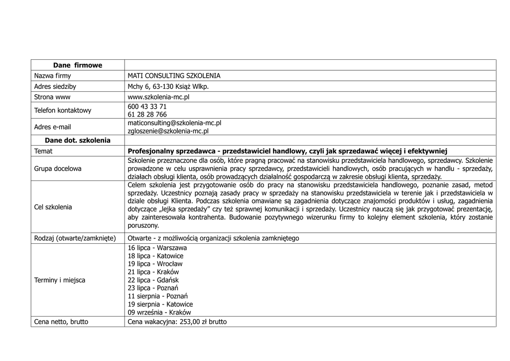 Dane firmowe Nazwa firmy MATI CONSULTING SZKOLENIA Adres siedziby Mchy 6, 63-130 Książ Wlkp. Strona www www.szkolenia-mc.pl 600 43 33 71 61 28 28 766 [email protected] [email protected] Telefon kontaktowy Adres e-mail Dane dot. szkolenia Temat Grupa docelowa Cel szkolenia Rodzaj (otwarte/zamknięte) Terminy i miejsca Cena netto, brutto Profesjonalny sprzedawca - przedstawiciel handlowy, czyli jak sprzedawać więcej i efektywniej Szkolenie przeznaczone dla osób, które pragną pracować na stanowisku przedstawiciela handlowego, sprzedawcy. Szkolenie prowadzone w celu usprawnienia pracy sprzedawcy, przedstawicieli handlowych, osób pracujących w handlu - sprzedaży, działach obsługi klienta, osób prowadzących działalność gospodarczą w zakresie obsługi klienta, sprzedaży. Celem szkolenia jest przygotowanie osób do pracy na stanowisku przedstawiciela handlowego, poznanie zasad, metod sprzedaży. Uczestnicy poznają zasady pracy w sprzedaży na stanowisku przedstawiciela w terenie jak i przedstawiciela w dziale obsługi Klienta. Podczas szkolenia omawiane są zagadnienia dotyczące znajomości produktów i usług, zagadnienia dotyczące „lejka sprzedaży” czy też sprawnej komunikacji i sprzedaży. Uczestnicy nauczą się jak przygotować prezentację, aby zainteresowała kontrahenta. Budowanie pozytywnego wizerunku firmy to kolejny element szkolenia, który zostanie poruszony. Otwarte - z możliwością organizacji szkolenia zamkniętego 16 lipca - Warszawa 18 lipca - Katowice 19 lipca - Wrocław 21 lipca - Kraków 22 lipca - Gdańsk 23 lipca - Poznań 11 sierpnia - Poznań 19 sierpnia - Katowice 09 września - Kraków Cena wakacyjna: 253,00 zł brutto Co zawiera cena Trenerzy Szkolenie, imienny certyfikat, przerwa kawowa 1. Charakterystyka zawodu sprzedawcy 2. Cechy i predyspozycje do sprzedaży 3. Sprawna komunikacja i budowanie dobrych relacji z klientem 4. Sposoby prezentacji 5. Obsługa klienta jako klucz do sukcesu 6. Budowanie pozytywnego wizerunku firmy 7. Psychologia sprzedaży – znaczenie motywacji i własnych przekonań w procesie sprzedaży Doświadczeni praktycy – trenerzy z wieloletnim stażem pracy Metodologia warsztaty, ćwiczenia Materiały szkoleniowe tak Certyfikaty tak – imienny certyfikat Program szkolenia – ramowy