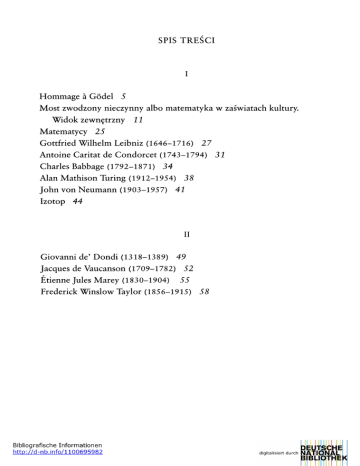 SPIS TREŚCI Hommage à Gödel 5 Most zwodzony nieczynny albo matematyka w zaświatach kultury. Widok zewnętrzny 11 Matematycy 25 Gottfried Wilhelm Leibniz (16싸 27 A n to in e Гяп^яг d e s o n d o r r e t ( 1 7 4 3 - 1 7 9 4 ) 31 Charles Babbage (1792-1871) 34 Alan Mathison Turing (1912-1954) 38 John von Neumann (1903-1957) 41 Izotop 44 II Giovanni de5 Dondi (1318-1389) 49 Jacques de Vaucanson (1709-1782) 52 Étienne Jules Marey (1830-1904) SS Frederick Winslow Taylor (1856—1915) 58 Na pamiątkę sir Hirama Maxima (1840-1916) 60 Grozę budzące postępy, o dziele Sigfrieda Giediona Die Herrschaft der Mecbanisierung 63 Model berliński 1967 73 zając w centrum komputerowym 75 Cyfrowa ewangelia. Prorocy,beneficjenci i szydercy 77 III Czarno-biały rysunek 101 Nauka astralna 102 Podziemna katedra. Miejsce pielgrzymek fizyki - zbliżenia 103 Osobliwy atraktor 122 Szczegóły o pewnym drzewie 123 Bifurkacje 125 Przewidywania w sprawie turbulencji 126 Maszyna klimatyczna 13S Astrolabium 136 Tycho Brahe (154Ố-1601) 138 Charles Messier (1730-1817) 141 Pytania do kosmologów 144 Teologia naukowa 146 IV Bibliografia 149 Carl von Linné (1707-1778) IS I Lazzaro Spallanzani (1729-1799) 154 Charles Robert Darwin (1809-1882) 157 Rzecz prosta,a wynaleźć trudno 161 Puczysci w laboratorium, o najnowszej rewolucji w naukach 162 Masa atomowa 12,011 179 V Siec neuronalna 183 Ukiad limbiczny 184 Językowe piszczałki 186 A 188 Co mówią lekarze 190 Medytacja kliniczna 192 Pod skórą 193 Raimondo di Sangro (1710-1771) 195 Ignaz Philipp Semmelweis (1818-1865) 198 Ugo Cerletti (1877-1963) 203 Wilhelm Reich (1897-1957) 206 VI R ťrn arA n o d e S ah agń n ( 1 4 9 9 - 1 5 9 0 ) 213 Thomas Robert Malthus (1766-1834) 217 Alexander von Humboldt (1769-1859) 220 Towarzystwo badawcze 224 Studenci filozofii 226 Badacz renesansu 228 O francuskim cieście czasu. Medytacja o anachronizmie Podziw 250 W wyższych partiach zakłócenia burzowe 252 230 Biskup Berkeley do sztambucha 254 Co błędne jest 256 Świata zagadki 258 Ostatnia myśl w kwestii pewności 260 Coraz krótsze konwersacje 261 Model teoriopoznawczy 262 VII P o e z j^ u k i. Postscriptum 1๖ 7