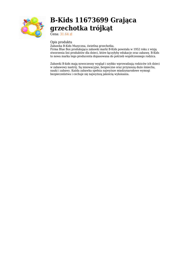 B-Kids 11673699 Grająca grzechotka trójkąt Cena: 31.64 zł Opis produktu Zabawka B-Kids Muzyczna, świetlna grzechotka. Firma Blue Box produkująca zabawki marki B-Kids powstała w 1952 roku z wizją stworzenia lini produktów dla dzieci, które łączyłyby edukacje oraz zabawę. B-Kids to nowa marka tego producenta dopasowana do potrzeb współczesnego rodzica. Zabawki B-kids mają nowoczesny wygląd i szybko wprowadzają rodziców ich dzieci w zabawowy nastrój. Są innowacyjne, bezpieczne oraz przynoszą dużo śmiechu, nauki i zabawy. Każda zabawka spełnia najwyższe międzynarodowe wymogi bezpieczeństwa i cechuje się najwyższą jakością wykonania.
