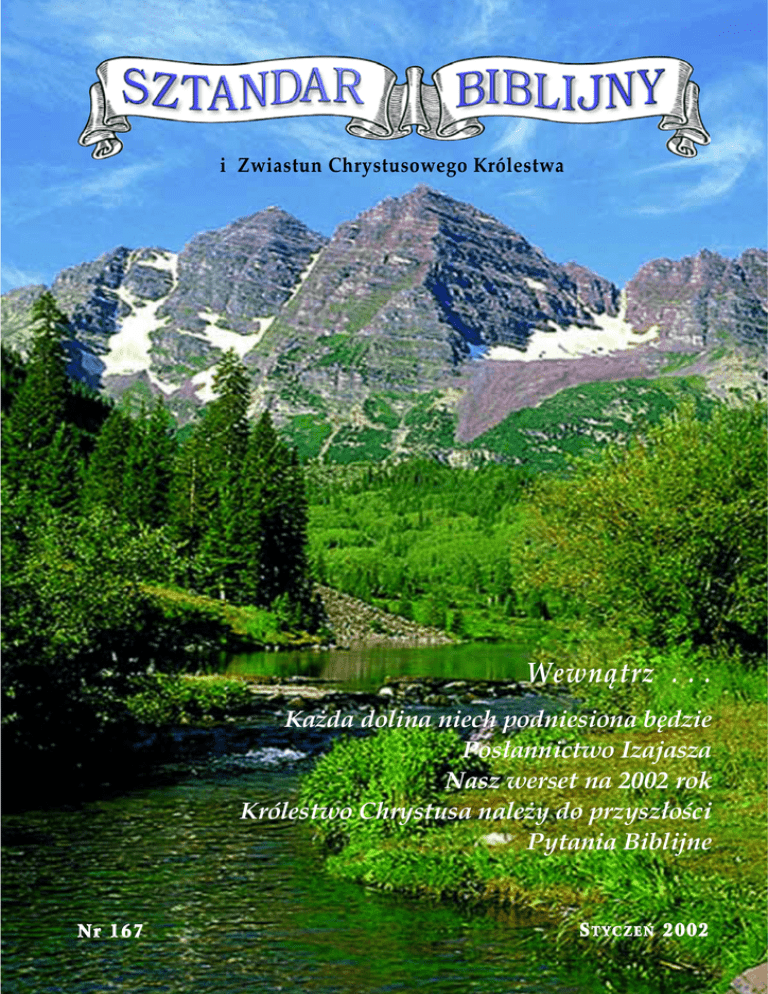 i Zwiastun Chrystusowego Królestwa Wewnątrz . . . Każda dolina niech podniesiona będzie Posłannictwo Izajasza Nasz werset na 2002 rok Królestwo Chrystusa należy do przyszłości Pytania Biblijne Nr 167 STYCZEŃ 2002 K AŻDA D OLINA N IECH P ODNIESIONA B ĘDZIE „Każda dolina niech podniesiona będzie, a każda góra i pagórek niech poniżony będzie; co jest krzywego niech się wyprostuje, a miejsca nierówne niech będą równiną” – Izajasz 40 : 4, 5 – częta swoje pod skrzydła, a nie chcieliście? Oto wam dom wasz pusty zostanie” (Mat. 23:37,38). POSłANNICTWO IZAJASZA z 40 rozdziału jest skierowane do Izraela, do ludu związanego z Bogiem przez przymierze. Od najdawniejszych czasów ów naród uważał, że jest przeznaczony do jakiegoś szczególnego celu w Boskiej służbie. Dzięki Boskiej łasce dostąpił wyjątkowego zbliżenia z Nim, dzięki któremu lojalność mogłaby zapewnić mu pokój, powodzenie i dalsze przywileje. Natomiast nielojalność wywołałaby Boskie niezadowolenie i wycofanie Jego protekcji. Chociaż historia zapisała liczne przejawy nieposłuszeństwa tego narodu oraz wiele okazji surowego karania, zasadniczy sens przeznaczenia pozostał – świadomość pewnej misji danej przez Boga dla Jego celu. Przez 1845 lat, od śmierci Jakuba, gdy ich pozycja jako narodu była pierwszy raz uznana, oni cieszyli się Boską opieką i nauką. Mimo, że często cierpieli z powodu srogich kar i napraw za liczne grzechy, Bóg słyszał ich pokutujące wołania i wielokrotnie uwalniał ich od nieprzyjaciół. Lecz odrzucenie przez nich Mesjasza nie pozostawiało żadnej nadziei dalszego Boskiego uznania, a Jezus w A.D. 33 oświadczył, że Dom Izraela będzie spustoszony, zaznaczając początek odpowiednich 1845 lat Boskiej niełaski. Wkrótce skazany na wygnanie ze swej ojczyzny, naród Izraela w rzeczywistości znalazł się w warunkach osamotnienia i odrzucenia – lud rozproszony między wszystkimi innymi narodami znosił antagonizm i nienawiść ze strony wrogo usposobionego świata. Ten cel był niejasno zrozumiany aż do przyjścia Mesjasza. Lecz wówczas tylko kilku zrozumiało, uznało i oddało swoje życie dla tej szczególnej misji, którą On wyjawił. Pośród przywódców owego narodu stare nieprzejednanie pozostało. Jezus nie zapoznał się z tymi błędnymi oczekiwaniami o wyzwolicielu mającym przywrócić prestiż Izraela po stuleciach niewolniczego trzymania się kolejnych imperializmów. Ostrość bólu Jezusa, z powodu tego odrzucenia, można dostrzec w Jego bezgranicznym smutku z powodu zdrady: „Jeruzalem! Jeruzalem! Które zabijasz proroki, i które kamionujesz te, którzy do ciebie byli posyłani: ilekroć chciałem zgromadzić dzieci twoje, tak jako zgromadza kokosz kur- „PODNIEŚCIE SZTANDAR „CIESZCIE LUD MÓJ” Ale Izrael nigdy nie stracił swej tożsamości. „Miłymi dla ojców” (Rzym. 11:28), czas ich niełaski wygasł pod koniec 19 stulecia, a lud początkowo rozproszony powracał do ziemi zwanej „świętą”. Nastał czas mówienia pocieszająco do Jeruzalem. A ów „głos ... na puszczy” (Iz. 40:3) był posłannictwem Boskiego ludu wiernego i poświęconego, ludu, który poznawał znaki czasu i miał przywilej DO NARODÓW“ – Izaj. 62:10 Spis Treści Styczeń 2002 Każda Dolina Niech Podniesiona Będzie 2 „Napisz Rzetelnie na Tablicach“ W świecie grzechu dobro nie zawsze jest wyniesione na szczyt. Odwołując się do potężnej symbologii Pisma Sw. widzimy, w jaki sposób obecne struktury społeczne zostaną obalone. Znaczenie „dobrego rozbierania słowa prawdy“ jest właściwą radą przy próbach umieszczenia epok i wieków Planu Bożego w historii. 5 Pytania Biblijne 11 Miłość widziana w chrześcijańskiej perspektywie 11 Interesujące 10 Ogłoszenia 12 Sztandar Biblijny i Zwiastun Chrystusowego Królestwa (PL ISSN 1230-1086) Miesięcznik – Wydawany przez Świecki Ruch Misyjny „Epifania” w Nowym Dworze Mazowieckim. Redaktor: Bernard Hedman Chester Springs, Pa. 19425, USA, Redaktor odpowiedzialny w Polsce: Piotr Woźnicki, ul. Zdobywców Kosmosu 17, 05-100 Nowy Dwór Mazowiecki. Witryna internetowa: http://epifania.pl Cena: pojedynczego numeru - 1,50 zł; prenumerata roczna (12 numerów) - 18 zł. ogłaszać nadchodzące Królestwo, Tysiącletnie Panowanie Mesjasza. Ten lud głosił o niezmiennym przeznaczeniu Boskiego narodu Izraelskiego, niezbędnego podczas ustanawiania tego Królestwa na ziemi – ów naród tę misję uświadamiał sobie niewyraźnie, lecz ona wkrótce się stanie jasna. My mamy zapewnienie Pisma Świętego, że chociaż powrócili głównie niewierzący, dotąd głusi i ślepi na działania Boskiego Planu Zbawienia, narodowe nawrócenie Izraela spełni się przez Chrystusa w chwale. „Przyjdzie z Syjonu wybawiciel i odwróci niepobożności od Jakuba” (Rzym. 11:26). Generacje chrześcijan modliły się: „Przyjdź Królestwo Twoje; bądź wola twoja jako w niebie, tak i na ziemi”, głównie z wielką dozą niepewności, co do natury tego Królestwa. Niektórzy źle je interpretowali, jako będące tylko działaniem łaski w sercach wierzących, nie oceniając niektórych z najmocniejszych obietnic Pisma Świętego. Ps. 72:8 mówi nam, że to Królestwo będzie panować „od morza do morza”. Apostoł Paweł do Filipian 2:9-11 mówi, że „każde kolano się pokłoni i każdy język będzie wyznawał, że Jezus Chrystus jest Panem ku chwale Boga Ojca”. Takie proroctwa dotąd się nie spełniły. Nasze ciągłe pytania świadczą o tym, że Boże Królestwo jeszcze nie nastało. Ono bowiem przyniesie z sobą błogosławieństwo dla świata, a intencje Ojca Niebiańskiego zmierzają do ustanowienia swego dominium pośród Jego ziemskich poddanych. My modlimy się „Przyjdź Królestwo Twoje”, ponieważ oczekujemy na Zbawiciela ukazującego się drugi raz i przynoszącego zbawienie wszystkim. Izrael będzie błogosławił świat Gdy na tę modlitw