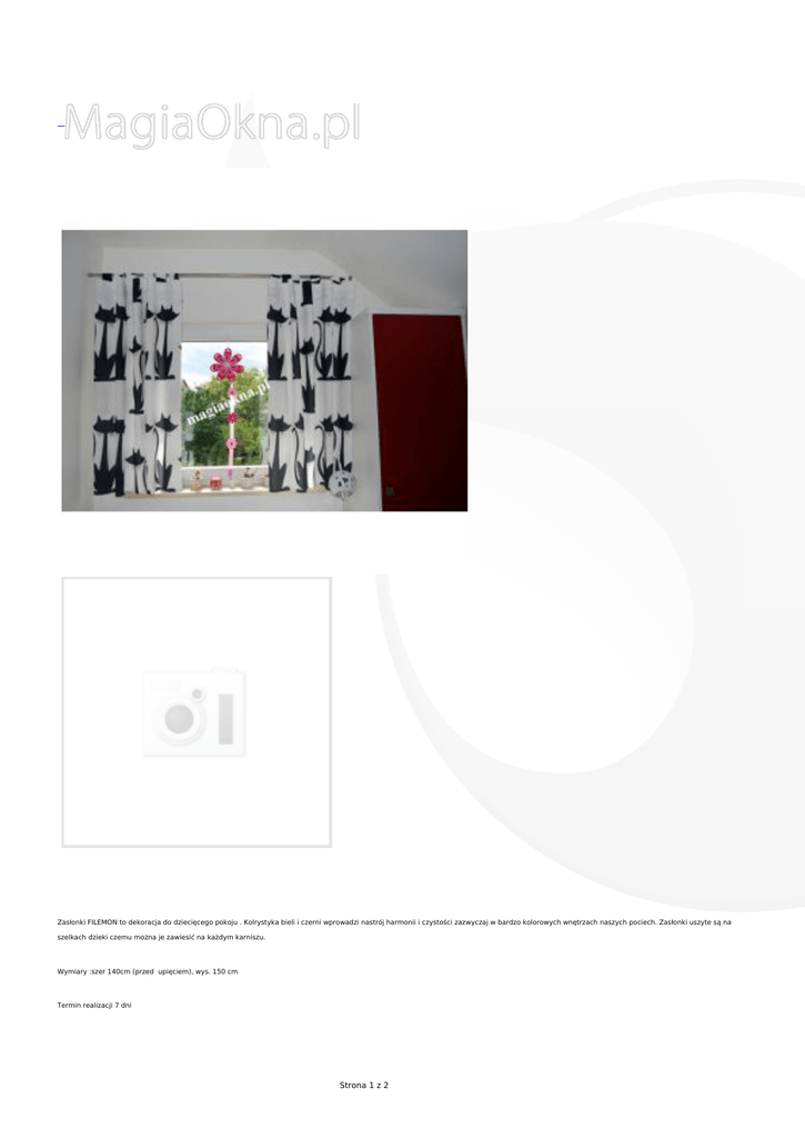 Zasłonki FILEMON to dekoracja do dziecięcego pokoju . Kolrystyka bieli i czerni wprowadzi nastrój harmonii i czystości zazwyczaj w bardzo kolorowych wnętrzach naszych pociech. Zasłonki uszyte są na szelkach dzieki czemu można je zawiesić na każdym karniszu. Wymiary :szer 140cm (przed upięciem), wys. 150 cm Termin realizacji 7 dni Strona 1 z 2 Cena dotyczy 1 szt. Strona 2 z 2