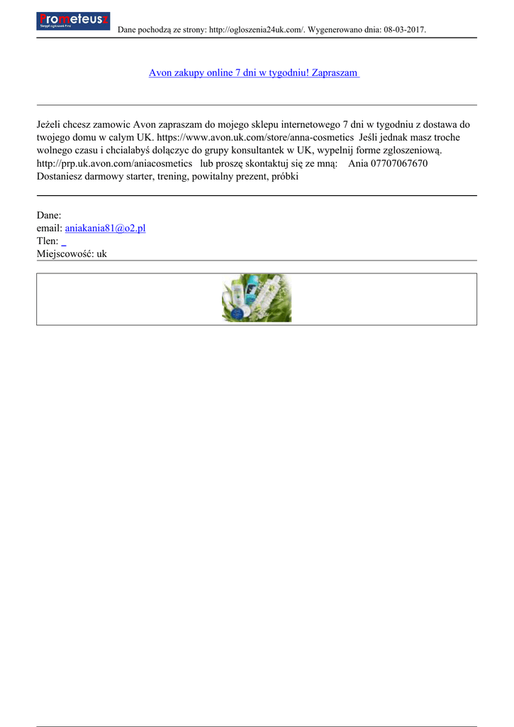 Dane pochodzą ze strony: http://ogloszenia24uk.com/. Wygenerowano dnia: 08-03-2017. Avon zakupy online 7 dni w tygodniu! Zapraszam Jeżeli chcesz zamowic Avon zapraszam do mojego sklepu internetowego 7 dni w tygodniu z dostawa do twojego domu w calym UK. https://www.avon.uk.com/store/anna-cosmetics Jeśli jednak masz troche wolnego czasu i chcialabyś dolączyc do grupy konsultantek w UK, wypelnij forme zgloszeniową. http://prp.uk.avon.com/aniacosmetics lub proszę skontaktuj się ze mną: Ania 07707067670 Dostaniesz darmowy starter, trening, powitalny prezent, próbki Dane: email: [email protected] Tlen: Miejscowość: uk