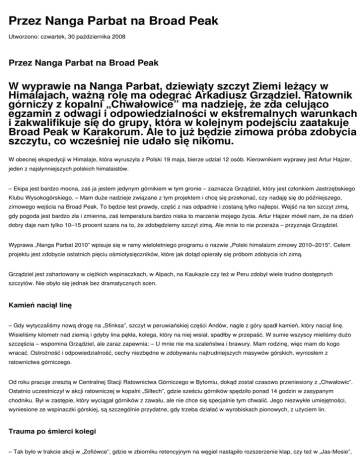 Przez Nanga Parbat na Broad Peak Utworzono: czwartek, 30 października 2008 Przez Nanga Parbat na Broad Peak W wyprawie na Nanga Parbat, dziewiąty szczyt Ziemi leżący w Himalajach, ważną rolę ma odegrać Arkadiusz Grządziel. Ratownik górniczy z kopalni „Chwałowice” ma nadzieję, że zda celująco egzamin z odwagi i odpowiedzialności w ekstremalnych warunkach i zakwalifikuje się do grupy, która w kolejnym podejściu zaatakuje Broad Peak w Karakorum. Ale to już będzie zimowa próba zdobycia szczytu, co wcześniej nie udało się nikomu. W obecnej ekspedycji w Himalaje, która wyruszyła z Polski 19 maja, bierze udział 12 osób. Kierownikiem wyprawy jest Artur Hajzer, jeden z najsłynniejszych polskich himalaistów. – Ekipa jest bardzo mocna, zaś ja jestem jedynym górnikiem w tym gronie – zaznacza Grządziel, który jest członkiem Jastrzębskiego Klubu Wysokogórskiego. – Mam duże nadzieje związane z tym projektem i chcę się przekonać, czy nadaję się do późniejszego, zimowego wejścia na Broad Peak. To będzie test prawdy, część z nas odpadnie i zostaną tylko najlepsi. Wejść na ten szczyt zimą, gdy pogoda jest bardzo zła i zmienna, zaś temperatura bardzo niska to marzenie mojego życia. Artur Hajzer mówił nam, że na dzień dobry daje nam tylko 10–15 procent szans na to, że zdobędziemy szczyt zimą. Ale mnie to nie przeraża – przyznaje Grządziel. Wyprawa „Nanga Parbat 2010” wpisuje się w ramy wieloletniego programu o nazwie „Polski himalaizm zimowy 2010–2015”. Celem projektu jest zdobycie ostatnich pięciu ośmiotysięczników, które jak dotąd opierały się próbom zdobycia ich zimą. Grządziel jest zahartowany w ciężkich wspinaczkach, w Alpach, na Kaukazie czy też w Peru zdobył wiele trudno dostępnych szczytów. Nie obyło się jednak bez dramatycznych scen. Kamień naciął linę – Gdy wytyczaliśmy nową drogę na „Sfinksa”, szczyt w peruwiańskiej części Andów, nagle z góry spadł kamień, który naciął linę. Wisieliśmy kilometr nad ziemią i gdyby lina pękła, kolega, który na niej wisiał, spadłby w przepaść. W sumie wszyscy mieliśmy dużo szczęścia – wspomina Grządziel, ale zaraz zapewnia: – U mnie nie ma szaleństwa i brawury. Mam rodzinę, więc mam do kogo wracać. Ostrożność i odpowiedzialność, cechy niezbędne w zdobywaniu najtrudniejszych masywów górskich, wyniosłem z ratownictwa górniczego. Od roku pracuje zresztą w Centralnej Stacji Ratownictwa Górniczego w Bytomiu, dokąd został czasowo przeniesiony z „Chwałowic”. Ostatnio uczestniczył w akcji ratowniczej w kopalni „Siltech”, gdzie sześciu górników spędziło ponad 14 godzin w zasypanym chodniku. Był w zastępie, który wyciągał górników z zawału, ale nie chce się specjalnie tym chwalić. Jego niezwykłe umiejętności, wyniesione ze wspinaczki górskiej, są szczególnie przydatne, gdy trzeba działać w wyrobiskach pionowych, z użyciem lin. Trauma po śmierci kolegi – Tak było w trakcie akcji w „Zofiówce”, gdzie w zbiorniku retencyjnym na węgiel nastąpiło rozszerzenie klap, czy też w „Jas-Mosie”, gdzie z kolei doszło do zakleszczenia klatki pomocniczej w szybie. Tam właśnie zjeżdżaliśmy na linach – przyznaje Grządziel, który nie zapomina o wdzięczności wobec swojego pracodawcy. – Gdy dwa lata temu wszedłem na Pik Korżeniewskiej w Pamirze, zrobiłem sobie fotkę z logo Centralnej Stacji Ratownictwa Górniczego i kopalni „Chwałowice” – śmieje się Grządziel. Mimo upływu czasu nadal walczy z traumą, będącą następstwem śmiertelnego wypadku jego kolegi, Krzysztofa Apanasewicza. Do tragedii doszło w tadżyckim Pamirze, gdzie Apanasewicz, który był ratownikiem górniczym w kopalni „Borynia”, pozostał na zawsze. Kierownikiem wyprawy był właśnie Grządziel, który od razu podjął akcję ratunkową. – Prawdopodobnie Krzysiek spadł wraz z oderwanym płatem śniegu. Po tym wypadku zmieniłem podejście do wypraw, ten uraz psychiczny został we mnie na lata – wyznaje swój ból, który nie zabił w nim jednak pasji do gór. Jerzy Mucha