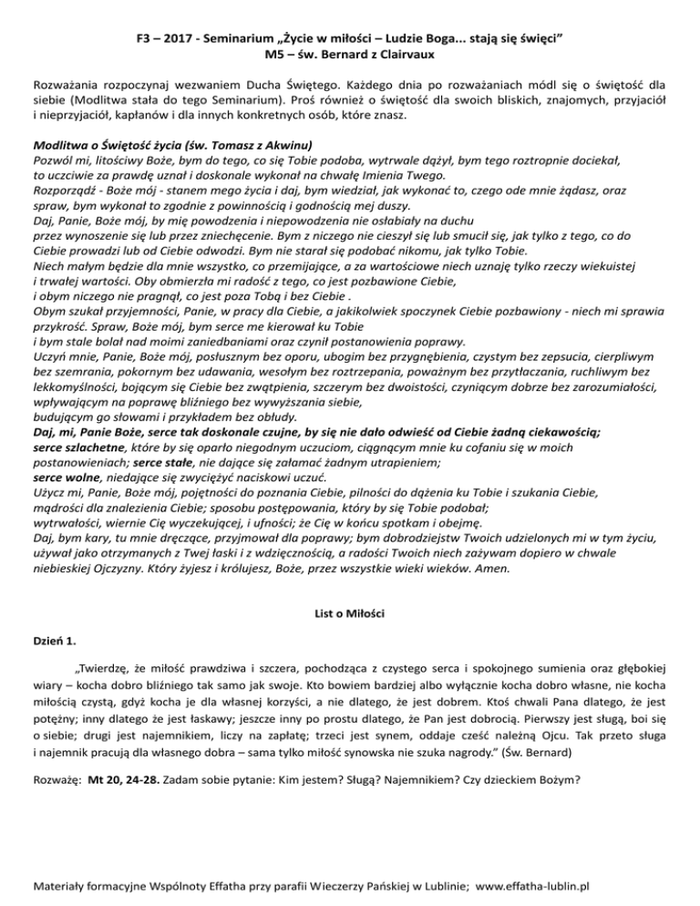 F3 – 2017 - Seminarium „Życie w miłości – Ludzie Boga... stają się święci” M5 – św. Bernard z Clairvaux Rozważania rozpoczynaj wezwaniem Ducha Świętego. Każdego dnia po rozważaniach módl się o świętość dla siebie (Modlitwa stała do tego Seminarium). Proś również o świętość dla swoich bliskich, znajomych, przyjaciół i nieprzyjaciół, kapłanów i dla innych konkretnych osób, które znasz. Modlitwa o Świętość życia (św. Tomasz z Akwinu) Pozwól mi, litościwy Boże, bym do tego, co się Tobie podoba, wytrwale dążył, bym tego roztropnie dociekał, to uczciwie za prawdę uznał i doskonale wykonał na chwałę Imienia Twego. Rozporządź - Boże mój - stanem mego życia i daj, bym wiedział, jak wykonać to, czego ode mnie żądasz, oraz spraw, bym wykonał to zgodnie z powinnością i godnością mej duszy. Daj, Panie, Boże mój, by mię powodzenia i niepowodzenia nie osłabiały na duchu przez wynoszenie się lub przez zniechęcenie. Bym z niczego nie cieszył się lub smucił się, jak tylko z tego, co do Ciebie prowadzi lub od Ciebie odwodzi. Bym nie starał się podobać nikomu, jak tylko Tobie. Niech małym będzie dla mnie wszystko, co przemijające, a za wartościowe niech uznaję tylko rzeczy wiekuistej i trwałej wartości. Oby obmierzła mi radość z tego, co jest pozbawione Ciebie, i obym niczego nie pragnął, co jest poza Tobą i bez Ciebie . Obym szukał przyjemności, Panie, w pracy dla Ciebie, a jakikolwiek spoczynek Ciebie pozbawiony - niech mi sprawia przykrość. Spraw, Boże mój, bym serce me kierował ku Tobie i bym stale bolał nad moimi zaniedbaniami oraz czynił postanowienia poprawy. Uczyń mnie, Panie, Boże mój, posłusznym bez oporu, ubogim bez przygnębienia, czystym bez zepsucia, cierpliwym bez szemrania, pokornym bez udawania, wesołym bez roztrzepania, poważnym bez przytłaczania, ruchliwym bez lekkomyślności, bojącym się Ciebie bez zwątpienia, szczerym bez dwoistości, czyniącym dobrze bez zarozumiałości, wpływającym na poprawę bliźniego bez wywyższania siebie, budującym go słowami i przykładem bez obłudy. Daj, mi, Panie Boże, serce tak doskonale czujne, by się nie dało odwieść od Ciebie żadną ciekawością; serce szlachetne, które by się oparło niegodnym uczuciom, ciągnącym mnie ku cofaniu się w moich postanowieniach; serce stałe, nie dające się załamać żadnym utrapieniem; serce wolne, niedające się zwyciężyć naciskowi uczuć. Użycz mi, Panie, Boże mój, pojętności do poznania Ciebie, pilności do dążenia ku Tobie i szukania Ciebie, mądrości dla znalezienia Ciebie; sposobu postępowania, który by się Tobie podobał; wytrwałości, wiernie Cię wyczekującej, i ufności; że Cię w końcu spotkam i obejmę. Daj, bym kary, tu mnie dręczące, przyjmował dla poprawy; bym dobrodziejstw Twoich udzielonych mi w tym życiu, używał jako otrzymanych z Twej łaski i z wdzięcznością, a radości Twoich niech zażywam dopiero w chwale niebieskiej Ojczyzny. Który żyjesz i królujesz, Boże, przez wszystkie wieki wieków. Amen. List o Miłości Dzień 1. „Twierdzę, że miłość prawdziwa i szczera, pochodząca z czystego serca i spokojnego sumienia oraz głębokiej wiary – kocha dobro bliźniego tak samo jak swoje. Kto bowiem bardziej albo wyłącznie kocha dobro własne, nie kocha miłością czystą, gdyż kocha je dla własnej korzyści, a nie dlatego, że jest dobrem. Ktoś chwali Pana dlatego, że jest potężny; inny dlatego że jest łaskawy; jeszcze inny po prostu dlatego, że Pan jest dobrocią. Pierwszy jest sługą, boi się o siebie; drugi jest najemnikiem, liczy na zapłatę; trzeci jest synem, oddaje cześć należną Ojcu. Tak przeto sługa i najemnik pracują dla własnego dobra – sama tylko miłość synowska nie szuka nagrody.” (Św. Bernard) Rozważę: Mt 20, 24-28. Zadam sobie pytanie: Kim jestem? Sługą? Najemnikiem? Czy dzieckiem Bożym? Materiały formacyjne Wspólnoty Effatha przy parafii Wieczerzy Pańskiej w Lublinie; www.effatha-lublin.pl Dzień 2. „Ani bojaźń, ani miłość własna nie nawracają duszy. Zmieniają niekiedy okoliczności albo działanie, lecz nie serce. Czasami i sługa wykonuje dzieło zbożne, ale jak widać nie czyni tego ochoczo i nie wyzbywa się twardości serca. Podobnie najemnik, ale nie bezinteresownie, gdyż kieruje nim chciwość. Niewolnik więc idzie za swym prawem strachu, natomiast najemnik za pożądliwością zysku. Ani jedno ani drugie nie nawróci duszy. Natomiast miłość nawraca duszę i rodzi w niej wolę czynienia dobra.” (Św. Bernard) Rozważę: Łk 12, 13-21. Pomyślę, czym kieruję się w swoich codziennych działaniach. Jakie są moje motywacje? Dzień 3. „Sługa i najemnik posiadają prawo, lecz nie od Pana, tylko takie, jakie sobie sami nadali: pierwszy nie kochając Boga, drugi kochając stworzenia więcej niż Boga. O Panie Boże mój! «Dlaczego nie zgładzisz grzechu mego i czemu nie usuniesz nieprawości mojej» (Job 7, 21), abym zrzuciwszy nieznośne jarzmo własnej woli, odetchnął swobodniej pod wdzięcznym ciężarem miłości, by mnie nie przerażał strach niewolnika i nie łudziła chciwość najemnika, lecz by mną kierował Duch Twój, Duch wolności, który prowadzi dzieci Twoje? «Nikomu nic nie bądźcie dłużni poza wzajemną miłością» (Rz 13, 8).” (Św. Bernard) Rozważę: Ps 119, 1-16. Czy wypełniam wolę Pana? Dzień 4. „Dobre i pełne słodyczy jest prawo miłości, które nie tylko można z łatwością wypełnić, ale które i prawa niewolników oraz najemników czyni lżejszymi. «Nie przyszedłem znieść Prawo, ale wypełnić». Prawo miłości łagodzi bowiem prawo niewolników, porządkuje prawo najemników, jedno i drugie czyni łatwiejszym. Miłość więc dopełnia prawo niewolnika pobożnością, a prawo najemnika, poskramiając jego pożądliwość. Gdy to za łaską Bożą nastąpi, ciało i wszelkie dobra ziemskie będz