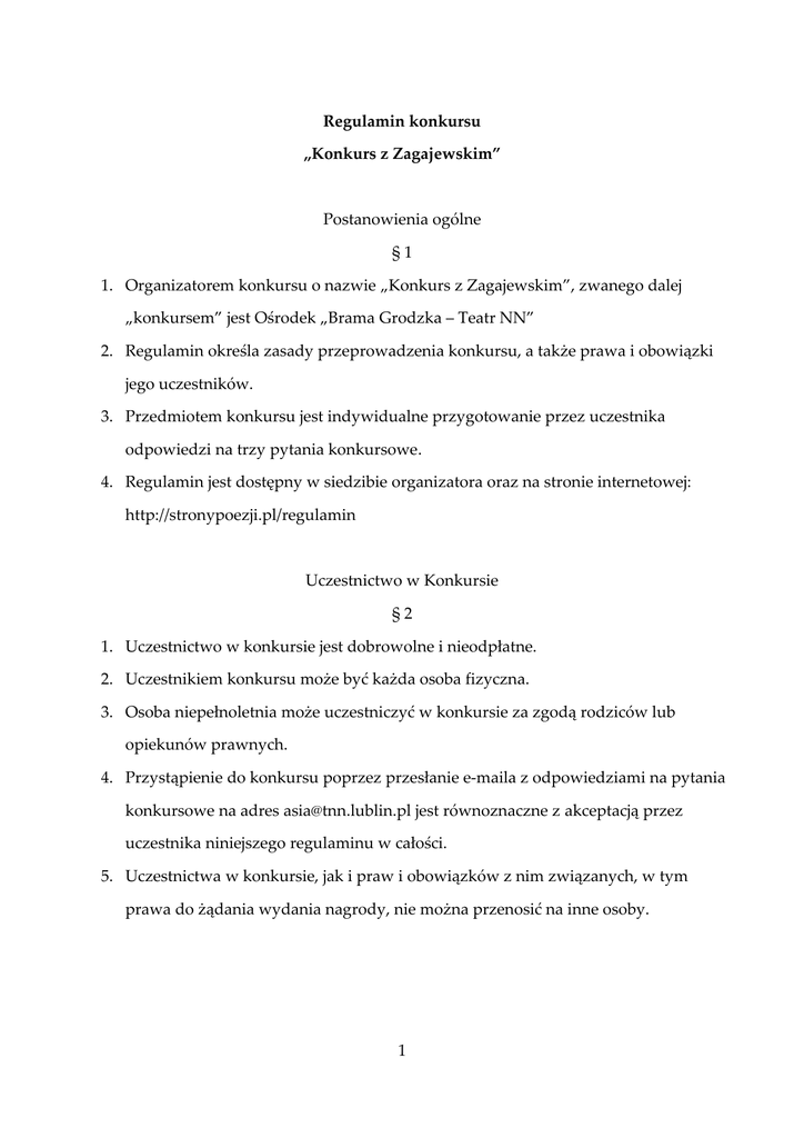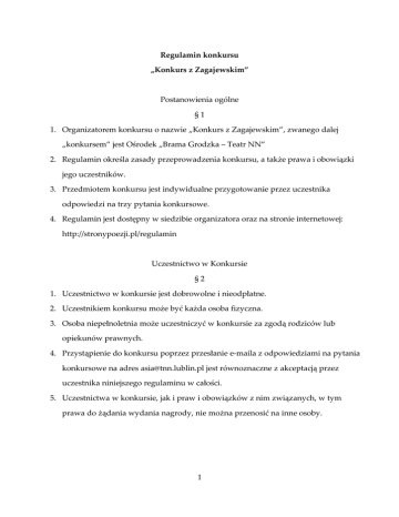 Regulamin konkursu „Konkurs z Zagajewskim” Postanowienia ogólne §1 1. Organizatorem konkursu o nazwie „Konkurs z Zagajewskim”, zwanego dalej „konkursem” jest Ośrodek „Brama Grodzka – Teatr NN” 2. Regulamin określa zasady przeprowadzenia konkursu, a także prawa i obowiązki jego uczestników. 3. Przedmiotem konkursu jest indywidualne przygotowanie przez uczestnika odpowiedzi na trzy pytania konkursowe. 4. Regulamin jest dostępny w siedzibie organizatora oraz na stronie internetowej: http://stronypoezji.pl/regulamin Uczestnictwo w Konkursie §2 1. Uczestnictwo w konkursie jest dobrowolne i nieodpłatne. 2. Uczestnikiem konkursu może być każda osoba fizyczna. 3. Osoba niepełnoletnia może uczestniczyć w konkursie za zgodą rodziców lub opiekunów prawnych. 4. Przystąpienie do konkursu poprzez przesłanie e-maila z odpowiedziami na pytania konkursowe na adres [email protected] jest równoznaczne z akceptacją przez uczestnika niniejszego regulaminu w całości. 5. Uczestnictwa w konkursie, jak i praw i obowiązków z nim związanych, w tym prawa do żądania wydania nagrody, nie można przenosić na inne osoby. 1 Zasady konkursu §3 1. Konkurs rozpoczyna się 14 czerwca 2016 r. o godzinie 21:00 i trwa do 16 czerwca 2016 r. do godz. 23:59. 2. Pytania konkursowe będą zamieszczane na fanpage'u Ośrodka „Brama Grodzka – Teatr NN” (https://www.facebook.com/brama.grodzka/) i Festiwalu „Miasto Poezji” (https://www.facebook.com/miasto.poezji/) na Facebooku każdego dnia trwania konkursu o godzinie 21:00. 3. Warunki poprawnego zgłoszenia: • przesłanie na adres [email protected] e-maila o tytule „Konkurs z Zagajewskim”, • w treści e-maila powinny znajdować się poprawne odpowiedzi na wszystkie trzy pytania konkursowe, • e-mail powinien zawierać imię i nazwisko uczestnika konkursu. 4. Zwycięzcą konkursu będzie osoba, która pierwsza prześle poprawne zgłoszenie na adres [email protected]. 5. Organizator nie ponosi odpowiedzialności za ewentualne problemy techniczne uczestnika konkursu. 6. Zwycięzca konkursu zostanie ogłoszony na fanpage'u Festiwalu „Miasto Poezji” i na fanpage'u Ośrodka „Brama Grodzka – Teatr NN” na Facebooku. §4 1. Uczestnik konkursu ponosi pełną odpowiedzialność za ewentualne wady prawne zgłoszenia konkursowego. 2. Uczestnik konkursu może wysłać jedno zgłoszenie konkursowe. 3. Przesłanie e-maila z odpowiedziami jest równoznaczne z oświadczeniem uczestnika, że: 1) zapoznał się i akceptuje treść niniejszego regulaminu; 2 2) wyraża zgodę na zbieranie i przetwarzanie swoich danych osobowych zgodnie z ustawą z dnia 29 sierpnia 1997 r. o ochronie danych osobowych (tekst jednolity, Dz. U. z 2014 r., poz. 1182, z późn. zm.) na potrzeby konkursu. 3) Wraża zgodę na ogłoszenie imienia i nazwiska zwycięzcy na wspomnianych wyżej fanpage'ach. 4. Nagrody w konkursie nie podlegają wymianie na inną nagrodę, ani na ekwiwalent pieniężny. Organizator nie ponosi odpowiedzialności z tytułu rękojmi za wady nagrody oraz nie udziela gwarancji jej jakości. 5. Organizator nie ponosi odpowiedzialności za niemożność odbioru nagrody z przyczyn leżących po stronie uczestnika. Nagrody w konkursie §5 1. Nagrodą w konkursie jest książka „Wiersze wybrane” Adama Zagajewskiego. 2. Zwycięzca konkursu zostanie powiadomiony poprzez e-mail. 3. Werdykt podejmie przedstawiciel organizatora konkursu. 4. Werdykt przedstawiciela organizatora konkursu jest ostateczny i nieodwołalny. 5. Uprawnienie do odbioru nagrody, określonej w § 5 ust. 1 niniejszego regulaminu, uczestnik nabywa z chwilą ogłoszenia werdyktu. 6. Nagroda zostanie przesłana do zwycięzcy nieodpłatnie na wskazany przez uczestnika adres. Postanowienia końcowe §6 1. Organizator może w każdym terminie unieważnić konkurs i nie rozstrzygnąć go bez podania przyczyn. 2. Uczestnik konkursu wyraża zgodę na zbieranie i przetwarzanie jego danych osobowych zgodnie z ustawą z dnia 29 sierpnia 1997 r. o ochronie danych osobowych (tekst jednolity, Dz. U. z 2014 r. poz. 1182 z póżn. zm.) na potrzeby 3 konkursu. Podanie danych jest dobrowolne, ale niezbędne dla wzięcia udziału w konkursie. Uczestnicy konkursu mają prawo do wglądu w swoje dane osobowe oraz do ich poprawiania. 3. W sprawach nieuregulowanych niniejszym regulaminem stosuję się przepisy prawa powszechnie obowiązującego, w szczególności przepisy kodeksu cywilnego oraz ustawy z dnia 4 lutego 1994 r. o prawie autorskim i prawach pokrewnych (tekst jednolity, Dz. U. z 2006 r., Nr 90, poz. 631, ze zm.). 4. Organizator zastrzega sobie prawo zmiany postanowień niniejszego regulaminu w przypadku istotnych zdarzeń mających wpływ na organizację konkursu. 5. Osoby, które nie spełniają któregokolwiek z wymogów określonych w niniejszym regulaminie są wykluczane z udziału w konkursie. 4