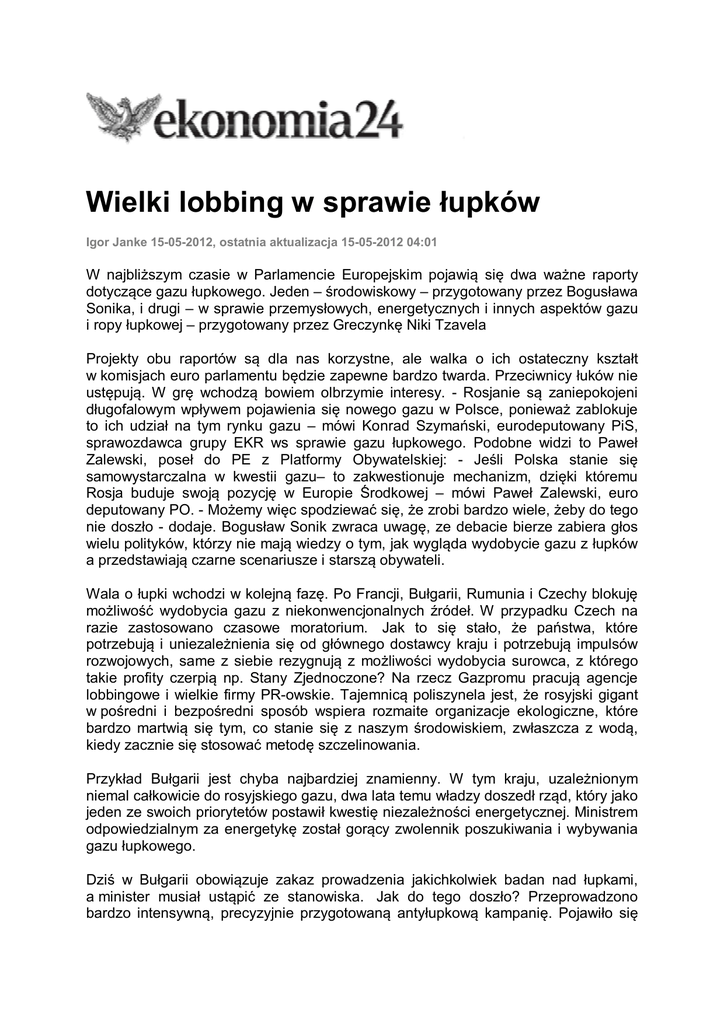 Wielki lobbing w sprawie łupków Igor Janke 15-05-2012, ostatnia aktualizacja 15-05-2012 04:01 W najbliższym czasie w Parlamencie Europejskim pojawią się dwa ważne raporty dotyczące gazu łupkowego. Jeden – środowiskowy – przygotowany przez Bogusława Sonika, i drugi – w sprawie przemysłowych, energetycznych i innych aspektów gazu i ropy łupkowej – przygotowany przez Greczynkę Niki Tzavela Projekty obu raportów są dla nas korzystne, ale walka o ich ostateczny kształt w komisjach euro parlamentu będzie zapewne bardzo twarda. Przeciwnicy łuków nie ustępują. W grę wchodzą bowiem olbrzymie interesy. - Rosjanie są zaniepokojeni długofalowym wpływem pojawienia się nowego gazu w Polsce, ponieważ zablokuje to ich udział na tym rynku gazu – mówi Konrad Szymański, eurodeputowany PiS, sprawozdawca grupy EKR ws sprawie gazu łupkowego. Podobne widzi to Paweł Zalewski, poseł do PE z Platformy Obywatelskiej: - Jeśli Polska stanie się samowystarczalna w kwestii gazu– to zakwestionuje mechanizm, dzięki któremu Rosja buduje swoją pozycję w Europie Środkowej – mówi Paweł Zalewski, euro deputowany PO. - Możemy więc spodziewać się, że zrobi bardzo wiele, żeby do tego nie doszło - dodaje. Bogusław Sonik zwraca uwagę, ze debacie bierze zabiera głos wielu polityków, którzy nie mają wiedzy o tym, jak wygląda wydobycie gazu z łupków a przedstawiają czarne scenariusze i starszą obywateli. Wala o łupki wchodzi w kolejną fazę. Po Francji, Bułgarii, Rumunia i Czechy blokuję możliwość wydobycia gazu z niekonwencjonalnych źródeł. W przypadku Czech na razie zastosowano czasowe moratorium. Jak to się stało, że państwa, które potrzebują i uniezależnienia się od głównego dostawcy kraju i potrzebują impulsów rozwojowych, same z siebie rezygnują z możliwości wydobycia surowca, z którego takie profity czerpią np. Stany Zjednoczone? Na rzecz Gazpromu pracują agencje lobbingowe i wielkie firmy PR-owskie. Tajemnicą poliszynela jest, że rosyjski gigant w pośredni i bezpośredni sposób wspiera rozmaite organizacje ekologiczne, które bardzo martwią się tym, co stanie się z naszym środowiskiem, zwłaszcza z wodą, kiedy zacznie się stosować metodę szczelinowania. Przykład Bułgarii jest chyba najbardziej znamienny. W tym kraju, uzależnionym niemal całkowicie do rosyjskiego gazu, dwa lata temu władzy doszedł rząd, który jako jeden ze swoich priorytetów postawił kwestię niezależności energetycznej. Ministrem odpowiedzialnym za energetykę został gorący zwolennik poszukiwania i wybywania gazu łupkowego. Dziś w Bułgarii obowiązuje zakaz prowadzenia jakichkolwiek badan nad łupkami, a minister musiał ustąpić ze stanowiska. Jak do tego doszło? Przeprowadzono bardzo intensywną, precyzyjnie przygotowaną antyłupkową kampanię. Pojawiło się wiele artykułów o szkodliwości odwiertów, wiele historii o tym, jak piękne pola i wsie zostaną zniszczone przez potężne amerykańskie maszyny wiertnicze. Silnie grano na antyamerykańskiej nucie. W wielu miastach Bułgarii jednocześnie zorganizowano demonstracje ekologów. Manifestacje były świetnie przygotowane, były barwne i zostały dokładnie zrelacjonowane przez media. W akcje protestu włączyli się nawet biznesmeni. Tak się złożyło, że byli to akurat biznesmeni prowadzący interesy z Rosją. Protesty w sprawie bułgarskich łupków odbywały się także w wielu miastach Europy Zachodniej, gdzie bułgarscy ekspaci tak bardzo przejęci zagrożeniem ekologicznym swojego kraju też postanowili zabrać głos. Artykuły w tej sprawie pojawiały się w europejskiej prasie, na portalach społecznościowych. Zapowiedzi demonstracji były na nawet na stronie internetowej CNN a tekst ten miał 6 tysięcy rekomendacji na twitterze. Akcja była zorganizowana z wielkim rozmachem i przeprowadzona bardzo precyzyjnie. Okazała się stuprocentowo skuteczna. W Francji lobbing prowadziły organizacje zwiane z biznesem atomowym, dla których inne źródła energii były zagrożeniem. W kraju, w którym stoi około siedemdziesięciu reaktorów nuklearnych ekolodzy wystraszyli się gazu łupkowego. Niemieckie lobby zielonego biznesu zamawia raporty, które przedstawiają przerażające wizje, jak będzie wyglądał świat, gdyby łupki były wydobywane. Raport ten był promowany w europarlamencie przez niemieckich socjalistów. W ostatnich dniach krytycznie na temat szczelinowania zaczęli wypowiadać się dwaj niemieccy ministrowie – gospodarki i ochrony środowiska. Komisja Europejska pracuje w tej chwili nad rozwiązaniami prawnymi, które mogą mieć wpływ na wydobycie gazu ze źródeł niekonwencjonalnych. Presja antyłupkowego lobby rośnie. Pierwsze – na razie lokalne protesty zaczynają wybuchać i w Polsce. Jednak Konrad Szymański zwraca uwagę na inny problem: - Bardziej niż rosyjskiego lobbyingu w Polsce obawiam się niewydolności naszego państwa i nieprzygotowania polskiego prawa. Proces koncesyjny jest zaskarżony do ETS, podatki i opłaty nieustalone, a system pozwoleń i kontroli jest na tyle skomplikowany i rozproszony, ze może stać się istotna przeszkoda w sprawnej realizacji inwestycji, które wymagają tempa. Nie widzę też myślenia strategicznego o komercjalizacji tego gazu. Przecież trzeba umieścić go gdzieś na rynku, dostarczyć do elektrowni, zakładów chemicznych, czy tez eksportować - dodaje. Debata o gazie Na Europejskim Kongresie Gospodarczym w Katowicach dziś odbędzie się dyskusja „Gaz łupkowy – szansa dla Polski, szansa dla Europy" z udziałem m.in. Jana Chadama – szefa Gaz-Systemu i Rafała Milanda – z-ca dyr. Departamentu Geologii i Koncesji Geologicznych resortu ś́ rodowiska. Moderatorem debaty jest Jakub Kurasz, z-ca red. nacz. „Rz" i red. nacz. „GG Parkiet". Rzeczpospolita