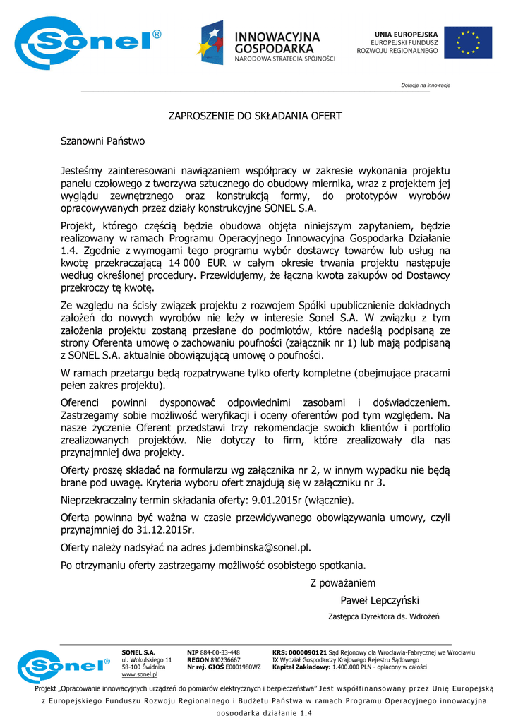 Dotacje na innowacje ___________________________________________________________________________________________________________________________________________________________________________________________________________ ZAPROSZENIE DO SKŁADANIA OFERT Szanowni Państwo Jesteśmy zainteresowani nawiązaniem współpracy w zakresie wykonania projektu panelu czołowego z tworzywa sztucznego do obudowy miernika, wraz z projektem jej wyglądu zewnętrznego oraz konstrukcją formy, do prototypów wyrobów opracowywanych przez działy konstrukcyjne SONEL S.A. Projekt, którego częścią będzie obudowa objęta niniejszym zapytaniem, będzie realizowany w ramach Programu Operacyjnego Innowacyjna Gospodarka Działanie 1.4. Zgodnie z wymogami tego programu wybór dostawcy towarów lub usług na kwotę przekraczającą 14 000 EUR w całym okresie trwania projektu następuje według określonej procedury. Przewidujemy, że łączna kwota zakupów od Dostawcy przekroczy tę kwotę. Ze względu na ścisły związek projektu z rozwojem Spółki upublicznienie dokładnych założeń do nowych wyrobów nie leży w interesie Sonel S.A. W związku z tym założenia projektu zostaną przesłane do podmiotów, które nadeślą podpisaną ze strony Oferenta umowę o zachowaniu poufności (załącznik nr 1) lub mają podpisaną z SONEL S.A. aktualnie obowiązującą umowę o poufności. W ramach przetargu będą rozpatrywane tylko oferty kompletne (obejmujące pracami pełen zakres projektu). Oferenci powinni dysponować odpowiednimi zasobami i doświadczeniem. Zastrzegamy sobie możliwość weryfikacji i oceny oferentów pod tym względem. Na nasze życzenie Oferent przedstawi trzy rekomendacje swoich klientów i portfolio zrealizowanych projektów. Nie dotyczy to firm, które zrealizowały dla nas przynajmniej dwa projekty. Oferty proszę składać na formularzu wg załącznika nr 2, w innym wypadku nie będą brane pod uwagę. Kryteria wyboru ofert znajdują się w załączniku nr 3. Nieprzekraczalny termin składania oferty: 9.01.2015r (włącznie). Oferta powinna być ważna w czasie przewidywanego obowiązywania umowy, czyli przynajmniej do 31.12.2015r. Oferty należy nadsyłać na adres [email protected]. Po otrzymaniu oferty zastrzegamy możliwość osobistego spotkania. Z poważaniem Paweł Lepczyński Zastępca Dyrektora ds. Wdrożeń SONEL S.A. ul. Wokulskiego 11 58-100 Świdnica www.sonel.pl NIP 884-00-33-448 REGON 890236667 Nr rej. GIOŚ E0001980WZ KRS: 0000090121 Sąd Rejonowy dla Wrocławia-Fabrycznej we Wrocławiu IX Wydział Gospodarczy Krajowego Rejestru Sądowego Kapitał Zakładowy: 1.400.000 PLN - opłacony w całości Projekt „Opracowanie innowacyjnych urządzeń do pomiarów elektrycznych i bezpieczeństwa” J e s t w s p ó ł f i n a n s o w a n y p r z e z U n i ę E u r o p e j s k ą z Europejskiego Funduszu Rozwoju Regionalnego i Budżetu Państwa w ramach Programu Operacyjnego innowacyjna gospodarka działanie 1.4