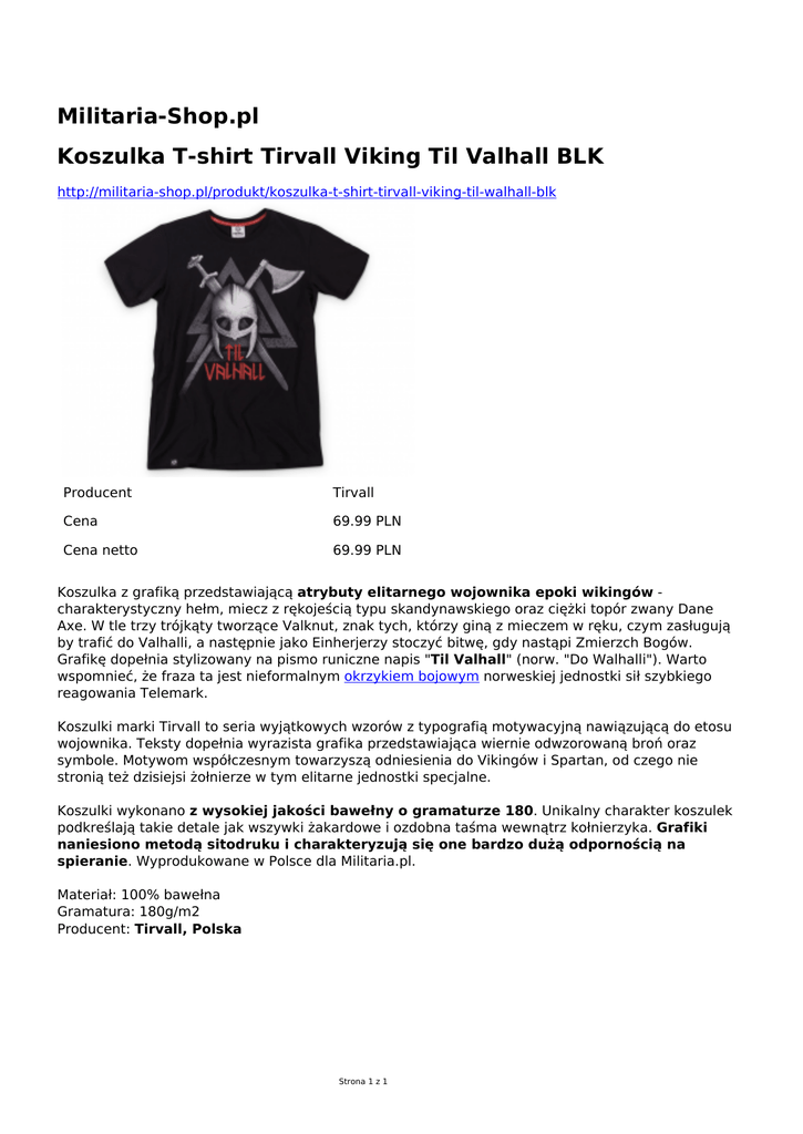Militaria-Shop.pl Koszulka T-shirt Tirvall Viking Til Valhall BLK http://militaria-shop.pl/produkt/koszulka-t-shirt-tirvall-viking-til-walhall-blk Producent Tirvall Cena 69.99 PLN Cena netto 69.99 PLN Koszulka z grafiką przedstawiającą atrybuty elitarnego wojownika epoki wikingów charakterystyczny hełm, miecz z rękojeścią typu skandynawskiego oraz ciężki topór zwany Dane Axe. W tle trzy trójkąty tworzące Valknut, znak tych, którzy giną z mieczem w ręku, czym zasługują by trafić do Valhalli, a następnie jako Einherjerzy stoczyć bitwę, gdy nastąpi Zmierzch Bogów. Grafikę dopełnia stylizowany na pismo runiczne napis "Til Valhall" (norw. "Do Walhalli"). Warto wspomnieć, że fraza ta jest nieformalnym okrzykiem bojowym norweskiej jednostki sił szybkiego reagowania Telemark. Koszulki marki Tirvall to seria wyjątkowych wzorów z typografią motywacyjną nawiązującą do etosu wojownika. Teksty dopełnia wyrazista grafika przedstawiająca wiernie odwzorowaną broń oraz symbole. Motywom współczesnym towarzyszą odniesienia do Vikingów i Spartan, od czego nie stronią też dzisiejsi żołnierze w tym elitarne jednostki specjalne. Koszulki wykonano z wysokiej jakości bawełny o gramaturze 180. Unikalny charakter koszulek podkreślają takie detale jak wszywki żakardowe i ozdobna taśma wewnątrz kołnierzyka. Grafiki naniesiono metodą sitodruku i charakteryzują się one bardzo dużą odpornością na spieranie. Wyprodukowane w Polsce dla Militaria.pl. Materiał: 100% bawełna Gramatura: 180g/m2 Producent: Tirvall, Polska Strona 1 z 1