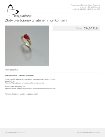 Pracownia Jubilerska Adam Dziadosz ul.Cicha 1, 23-400 Biłgoraj +48 696 441 225, +48 696 441 238 Złoty pierścionek z rubinem i cyrkoniami Cena: 534,00 PLN Opis produktu Złoty pierścionek z rubinem i cyrkoniami Szyna o profilu półokrągłym szerokości 3 mm zwężająca się do 1,5 mm. Waga 2,67 gr. Rozmiar 11 (możliwość zmniejszenia lub powiększenia) Kruszc :żółte złoto próby 585 Kamienie: Rubin syntetyczny owal 8 x 6 mm,6 okrągłych cyrkonii 1,5 mm. Pierścionek zostanie wysłany w ozdobnym etui. Plik wygenerowano: 08-03-2017 Oprogramowanie sklepu: AptusShop Pracownia Jubilerska Adam Dziadosz ul.Cicha 1, 23-400 Biłgoraj +48 696 441 225, +48 696 441 238 Galeria Plik wygenerowano: 08-03-2017 Powered by TCPDF (www.tcpdf.org) Oprogramowanie sklepu: AptusShop
