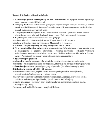 Temat: U źródeł cywilizacji helleńskiej 1. Cywilizacja grecka rozwinęła się na Płw. Bałkańskim, na wyspach Morza Egejskiego oraz na wybrzeżu Azji Mniejszej. 2. Półwysep Bałkański jest obszarem górzystym poprzecinanym licznymi dolinami, o dobrze rozwiniętej linii brzegowej. Dlatego Grecy nie utworzyli jednego państwa – mieszkali w małych państwach nazywanych polis. 3. Grecy zajmowali się uprawą ziemi, rzemiosłem i handlem. Uprawiali: zboże, drzewa oliwne i owocowe, winorośl; hodowali kozy i owce. Byli znakomitymi żeglarzami. 4. Najstarszymi kulturami na obszarze Grecji były: a) kultura minojska, która rozwijała się na Wyspie Krecie w II tys. p.n.e. b) kultura mykeńska, która rozwijała się w Mykenach w II tys. p.n.e. 5. Historia Grecji klasycznej ma swój początek w VIII w. p.n.e. 6. Grecy zamieszkiwali w polis – jest to miasto-państwo, które obejmuje obszar miasta, wraz z otaczającymi je terenami uprawnymi i wsiami; polityczna i religijna wspólnota mieszkańców zamieszkujących jego terytorium. Najsławniejsze greckie polis to Sparta i Ateny. Polis różniły się miedzy sobą ustrojem (systemem rządów). 7. Typy ustrojów greckich: a) oligarchia – rządy sprawuje tylko niewielka część społeczeństwa np. najbogatsi b) tyrania – rządy sprawuje jedna osoba (tyran), który nie ma do tego podstaw prawnych. c) demokracja – władzę sprawują wszyscy obywatele. (demokracja to rządy ludu). 8.Kolonizacja grecka od VIII – VI w. p.n.e. a) przyczyny – brak ziemi, szybki wzrost ludności polis greckich, rozwój handlu, poszukiwanie źródeł surowców i rynków zbytu. b) Grecy skolonizowali wybrzeże Morza Śródziemnego, Czarnego. Najwięcej kolonii założono na Półwyspie Apenińskim, Sycylii oraz w Azji Mniejszej. c) skutki kolonizacji – powstały nowe szlaki handlowe, rozwinęła się kultura grecka, wzbogacili się Grecy. Grecy nazywali siebie Hellenami, a swój kraj Helladą.