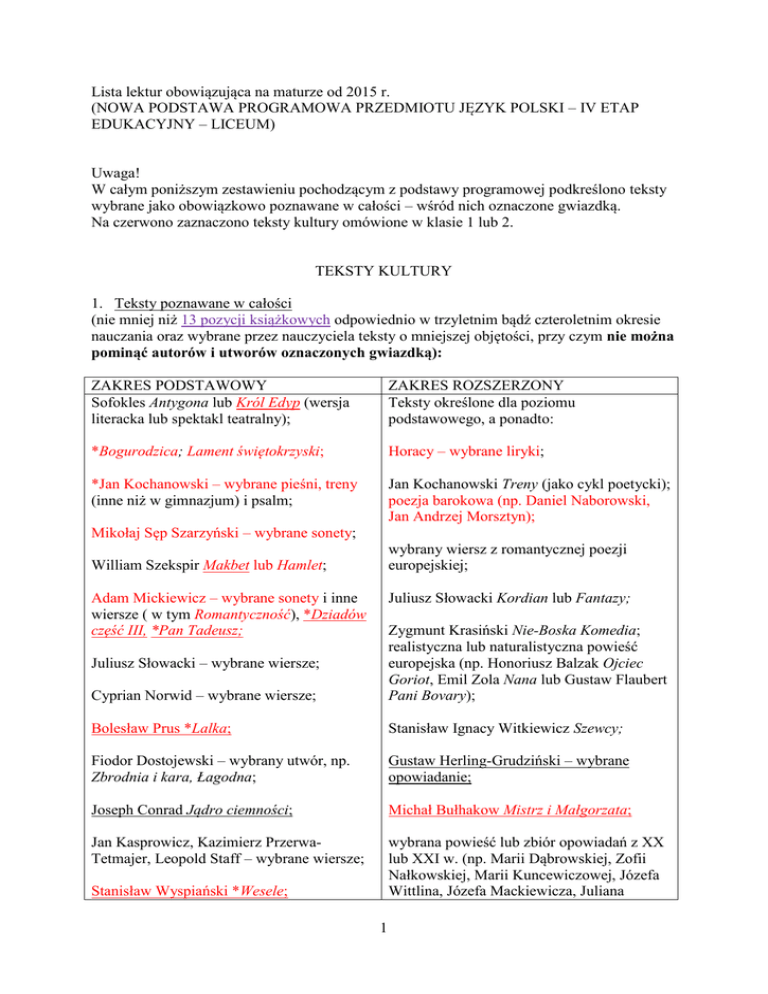 Lista lektur obowiązująca na maturze od 2015 r. (NOWA PODSTAWA PROGRAMOWA PRZEDMIOTU JĘZYK POLSKI – IV ETAP EDUKACYJNY – LICEUM) Uwaga! W całym poniższym zestawieniu pochodzącym z podstawy programowej podkreślono teksty wybrane jako obowiązkowo poznawane w całości – wśród nich oznaczone gwiazdką. Na czerwono zaznaczono teksty kultury omówione w klasie 1 lub 2. TEKSTY KULTURY 1. Teksty poznawane w całości (nie mniej niż 13 pozycji książkowych odpowiednio w trzyletnim bądź czteroletnim okresie nauczania oraz wybrane przez nauczyciela teksty o mniejszej objętości, przy czym nie można pominąć autorów i utworów oznaczonych gwiazdką): ZAKRES PODSTAWOWY Sofokles Antygona lub Król Edyp (wersja literacka lub spektakl teatralny); ZAKRES ROZSZERZONY Teksty określone dla poziomu podstawowego, a ponadto: *Bogurodzica; Lament świętokrzyski; Horacy – wybrane liryki; *Jan Kochanowski – wybrane pieśni, treny (inne niż w gimnazjum) i psalm; Jan Kochanowski Treny (jako cykl poetycki); poezja barokowa (np. Daniel Naborowski, Jan Andrzej Morsztyn); Mikołaj Sęp Szarzyński – wybrane sonety; wybrany wiersz z romantycznej poezji europejskiej; William Szekspir Makbet lub Hamlet; Adam Mickiewicz – wybrane sonety i inne wiersze ( w tym Romantyczność), *Dziadów część III, *Pan Tadeusz; Juliusz Słowacki Kordian lub Fantazy; Cyprian Norwid – wybrane wiersze; Zygmunt Krasiński Nie-Boska Komedia; realistyczna lub naturalistyczna powieść europejska (np. Honoriusz Balzak Ojciec Goriot, Emil Zola Nana lub Gustaw Flaubert Pani Bovary); Bolesław Prus *Lalka; Stanisław Ignacy Witkiewicz Szewcy; Fiodor Dostojewski – wybrany utwór, np. Zbrodnia i kara, Łagodna; Gustaw Herling-Grudziński – wybrane opowiadanie; Joseph Conrad Jądro ciemności; Michał Bułhakow Mistrz i Małgorzata; Jan Kasprowicz, Kazimierz PrzerwaTetmajer, Leopold Staff – wybrane wiersze; wybrana powieść lub zbiór opowiadań z XX lub XXI w. (np. Marii Dąbrowskiej, Zofii Nałkowskiej, Marii Kuncewiczowej, Józefa Wittlina, Józefa Mackiewicza, Juliana Juliusz Słowacki – wybrane wiersze; Stanisław Wyspiański *Wesele; 1 Stryjkowskiego, Andrzeja Kuśniewicza, Władysław Stanisław Reymont Chłopi (tom I Tadeusza Konwickiego, Stanisław Lema, – Jesień); Wiesław Myśliwskiego, Marka Nowakowskiego, Jerzego Pilcha, Olgi Stefan Żeromski – wybrany utwór (Ludzie Tokarczuk, Stefana Chwina, Pawła bezdomni, Wierna rzeka, Echa leśne lub Huellego); Przedwiośnie); wybrana powieść (lub zbiory opowiadań) Bolesław Leśmian, Julian Tuwim, Jan dwudziestowiecznych autorów z literatury Lechoń, Julian Przyboś, Józef Czechowicz, światowej (np. Franza Kafki, Thomasa Konstanty Ildefons Gałczyński – wybrane Manna, Vladimira Nabokova, Alberta wiersze; Camusa, Isaaca Bashevisa Singera, Johna Steinbecka, Kurta Vonneguta, Gabriela Jarosław Iwaszkiewicz – wybrane Garcii Marqueza, Güntera Grassa, Umberto opowiadanie; Eco, Milana Kundery); *Bruno Schulz – wybrane opowiadanie; wybrane wiersze dwudziestowiecznych poetów polskich (innych niż wymienieni na poziomie podstawowym). Tadeusz Borowski – wybrane opowiadanie; Krzysztof Kamil Baczyński, Tadeusz Różewicz, Czesław Miłosz, Wisława Szymborska, Zbigniew Herbert, Ewa Lipska, Adam Zagajewski, Stanisław Barańczak – wybrane wiersze; Miron Białoszewski – wybrane utwory wybrany dramat dwudziestowieczny z literatury polskiej ( np. Stanisława Ignacego Witkiewicza, Sławomira Mrożka lub Tadeusza Różewicza); wybrana powieść polska z XX lub XXI w. (np. Marii Kuncewiczowej Cudzoziemka, Zofii Nałkowskiej Granica, Józefa Mackiewicza Droga donikąd, Stanisława Lema Solaris, Juliana Stryjkowskiego Austeria, Tadeusza Konwickiego Kronika wypadków miłosnych); wybrana powieść światowa z XX lub XXI w. (np. Franza Kafki Proces, Alberta Camusa Dżuma, George’a Orwella Rok 1984, Isaaca Bashevisa Singera Sztukmistrz z Lublina, Gabriela Garcii Marqueza Sto lat samotności, Umberto Eco Imię róży). 2 2. Teksty poznawane w całości lub w części (decyzja należy do nauczyciela), przy czym nie można pominąć utworu oznaczonego gwiazdką: wybór mitów; teksty określone dla zakresu podstawowego, a ponadto: Dzieje Tristana i Izoldy; wybrany esej Mieczysława Jastruna lub Zygmunta Kubiaka poświęcony kulturze antycznej; Miguel Cervantes Don Kichot; Jan Chryzostom Pasek Pamiętniki; Dante Alighieri Boska komedia; Ignacy Krasicki – wybrana satyra lub Monachomachia; Johann Wolfgang Goethe Faust; Adam Mickiewicz Dziady część IV; Czesław Miłosz – wybrany esej; Juliusz Słowacki Kordian; Zbigniew Herbert – wybrany esej; Witold Gombrowicz *Ferdydurke; inny esej autora polskiego (np. Kazimierza Wyki, Jana Błońskiego, Marii Janion, Leszka Kołakowskiego, ks. Józefa Tischnera, Jarosława Rymkiewicza, Jerzego Stempowskiego); Irit Amiel – wybrane opowiadanie z tomu Osmaleni lub Hanna Krall Zdążyć przed Panem Bogiem; Gustaw Herling-Grudziński Inny świat; wybrany reportaż autora polskiego (np. Ryszarda Kapuścińskiego, Krzysztofa Kąkolewskiego, Hanny Krall, Henryka Grynberga); Ryszard Kapuściński Podróże z Herodotem; dziennik (np. Marii Dąbrowskiej, Zofii Nałkowskiej, Jarosława Iwaszkiewicza, Witolda Gombrowicza); Jan Paweł II Tryptyk Rzymski; Biblia (wybrane psalmy, fragmenty: Pieśni nad Pieśniami, Księgi Hioba, Apokalipsy św. Jana); 3 Biblia (fragmenty Starego i Nowego Testamentu jako konteksty interpretacyjne dla lektury dzieł z innych epok). 3. Inne: wybrane filmy z twórczości polskich reżyserów (np. Krzysztofa Kieślowskiego, Andrzeja Munka, Andrzeja Wajdy, Krzysztofa Zanussiego); jak dla zakresu podstawowego a ponadto: wybrane filmy z klasyki kinematografii światowej (np. Ingmara Bergmana, Charlesa Chaplina, Federico Felliniego, Akiry Kurosawy, Andrieja Tarkowskiego, Orsona Wellesa); homilia Jana Pawła II wygłoszona 2 czerwca 1979 roku w Warszawie na Placu Zwycięstwa (Piłsudskiego) – na