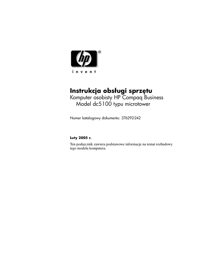 Instrukcja obsługi sprztu Komputer osobisty HP Compaq Business Model dc5100 typu microtower Numer katalogowy dokumentu: 376292-242 Luty 2005 r. Ten podręcznik zawiera podstawowe informacje na temat rozbudowy tego modelu komputera. © Copyright 2004 Hewlett-Packard Development Company, L.P. Informacje zawarte w niniejszym dokumencie mogą zostać zmienione bez uprzedzenia. Microsoft, MS-DOS, Windows oraz Windows NT są znakami towarowymi firmy Microsoft Corporation w USA i w innych krajach. Jedyne warunki gwarancji na produkty i usługi firmy HP są ujęte w odpowiednich informacjach o gwarancji towarzyszących tym produktom i usługom. Żadne z podanych tu informacji nie powinny być uznawane za jakiekolwiek gwarancje dodatkowe. Firma HP nie ponosi odpowiedzialności za błędy techniczne lub wydawnicze ani pominięcia, jakie mogą wystąpić w tekście. Niniejszy dokument zawiera prawnie zastrzeżone informacje, które są chronione prawami autorskimi. Żadna część tego dokumentu nie może być kopiowana, reprodukowana ani tłumaczona na inny język bez uprzedniej pisemnej zgody firmy Hewlett-Packard. Å OSTRZEENIE: Tak oznaczane s zalecenia, których nieprzestrzeganie moe doprowadzić do obrae ciała lub mierci. Ä PRZESTROGA: Tak oznaczane s zalecenia, których nieprzestrzeganie moe doprowadzić do uszkodzenia sprztu lub utraty danych. Instrukcja obsługi sprztu Komputer osobisty HP Compaq Business Model dc5100 typu microtower Wydanie pierwsze — Listopad 2004 r. Wydanie drugie — Luty 2005 r. Numer katalogowy dokumentu: 376292-242 Spis tre'ci 1 Elementy produktu Elementy w konfiguracji standardowej. . . . . . . . . . . . . . . . . . . . . . . . . . . . . . . . . . . . . Elementy panelu przedniego . . . . . . . . . . . . . . . . . . . . . . . . . . . . . . . . . . . . . . . . . . . . . Elementy panelu tylnego . . . . . . . . . . . . . . . . . . . . . . . . . . . . . . . . . . . . . . . . . . . . . . . . Elementy klawiatury . . . . . . . . . . . . . . . . . . . . . . . . . . . . . . . . . . . . . . . . . . . . . . . . . . . Opcjonalna klawiatura HP Modular Keyboard . . . . . . . . . . . . . . . . . . . . . . . . . . . Klawisz z logo systemu Windows . . . . . . . . . . . . . . . . . . . . . . . . . . . . . . . . . . . . . Funkcje specjalne myszy. . . . . . . . . . . . . . . . . . . . . . . . . . . . . . . . . . . . . . . . . . . . . . . . Umiejscowienie numeru seryjnego . . . . . . . . . . . . . . . . . . . . . . . . . . . . . . . . . . . . . . . . 1–1 1–2 1–3 1–4 1–5 1–5 1–6 1–6 2 Rozbudowa komputera Cechy komputera ułatwiające rozbudowę i serwisowanie . . . . . . . . . . . . . . . . . . . . . . 2–1 Ostrzeżenia i przestrogi . . . . . . . . . . . . . . . . . . . . . . . . . . . . . . . . . . . . . . . . . . . . . . . . . 2–1 Zdejmowanie panelu dostępu komputera . . . . . . . . . . . . . . . . . . . . . . . . . . . . . . . . . . . 2–3 Zdejmowanie pokrywy przedniej . . . . . . . . . . . . . . . . . . . . . . . . . . . . . . . . . . . . . . . . . 2–4 Instalowanie dodatkowej pamięci . . . . . . . . . . . . . . . . . . . . . . . . . . . . . . . . . . . . . . . . . 2–6 Moduły DIMM . . . . . . . . . . . . . . . . . . . . . . . . . . . . . . . . . . . . . . . . . . . . . . . . . . . . 2–6 Moduły DIMM typu DDR2-SDRAM . . . . . . . . . . . . . . . . . . . . . . . . . . . . . . . . . . 2–6 Wypełnianie gniazd DIMM . . . . . . . . . . . . . . . . . . . . . . . . . . . . . . . . . . . . . . . . . . 2–7 Instalowanie modułów DIMM . . . . . . . . . . . . . . . . . . . . . . . . . . . . . . . . . . . . . . . . 2–9 Wymiana lub rozbudowa napędów . . . . . . . . . . . . . . . . . . . . . . . . . . . . . . . . . . . . . . . 2–12 Położenie napędów w komputerze . . . . . . . . . . . . . . . . . . . . . . . . . . . . . . . . . . . . 2–12 Wyjmowanie napędu . . . . . . . . . . . . . . . . . . . . . . . . . . . . . . . . . . . . . . . . . . . . . . 2–14 Wkładanie napędu. . . . . . . . . . . . . . . . . . . . . . . . . . . . . . . . . . . . . . . . . . . . . . . . . 2–17 Instalowanie i wyjmowanie kart rozszerzeń . . . . . . . . . . . . . . . . . . . . . . . . . . . . . . . . 2–22 Ponowny montaż komputera . . . . . . . . . . . . . . . . . . . . . . . . . . . . . . . . . . . . . . . . . . . . 2–28 Instrukcja obsługi sprztu www.hp.com iii Spis treci A Dane techniczne B Wymiana baterii C Blokady zabezpieczaj2ce Instalowanie blokady zabezpieczającej. . . . . . . . . . . . . . . . . . . . . . . . . . . . . . . . . . . . . C–1 Blokada kablowa. . . . . . . . . . . . . . . . . . . . . . . . . . . . . . . . . . . . . . . . . . . . . . . . . . . C–1 Kłódka. . . . . . . . . . . . . . . . . . . . . . . . . . . . . . . . . . . . . . . . . . . . . . . . . . . . . . . . . . . C–2 D Wyładowania elektrostatyczne Zapobieganie wyładowaniom elektrostatycznym . . . . . . . . . . . . . . . . . . . . . . . . . . . . . D–1 Metody uziemiania . . . . . . . . . . . . . . . . . . . . . . . . . . . . . . . . . . . . . . . . . . . . . . . . . . . . D–1 E Zalecenia dotycz2ce pracy komputera, rutynowa pielgnacja i przygotowywanie komputera do transportu Zalecenia dotyczące pracy komputera i jego rutynowa pielęgnacja . . . . . . . . . . . . . . . Środki ostrożności przy obchodzeniu się z napędem optycznym . . . . . . . . . . . . . . . . . Obsługa . . . . . . . . . . . . . . . . . . . . . . . . . . . . . . . . . . . . . . . . . . . . . . . . . . . . . . . . . . Czyszczenie . . . . . . . . . . . . . . . . . . . . . . . . . . . . . . . . . . . . . . . . . . . . . . . . . . . . . . Środki bezpieczeństwa . . . . . . . . . . . . . . . . . . . . . . . . . . . . . . . . . . . . . . . . . . . . . . Przygotowanie do transportu. . . . . . . . . . . . . . . . . . . . . . . . . . . . . . . . . . . . . . . . . . . . . E–1 E–2 E–2 E–3 E–3 E–3 Indeks iv www.hp.com Instrukcja obsługi sprztu 1 Elementy produktu Elementy w konfiguracji standardowej Elemen