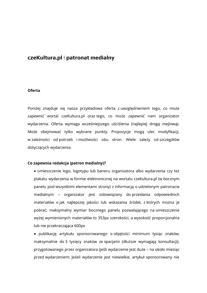 czeKultura.pl | patronat medialny Oferta Poniżej znajduje się nasza przykładowa oferta z uwzględnieniem tego, co może zapewnić wortal czeKultura.pl oraz tego, co może zapewnić nam organizator wydarzenia. Oferta wymaga wcześniejszego uściślenia (najlepiej drogą mejlową). Może obejmować tylko wybrane punkty. Propozycje mogą ulec modyfikacji, w zależności od potrzeb i możliwości obu stron. Wiele zależy od szczegółów dotyczących wydarzenia. Co zapewnia redakcja (patron medialny)? umieszczenie logo, logotypu lub baneru organizatora albo wydarzenia czy też plakatu wydarzenia w formie elektronicznej na wortalu czeKultura.pl (w bocznym panelu pod wszystkimi elementami strony) z informacją o udzielonym patronacie medialnym – organizator jest zobowiązany do przesłania odpowiednich materiałów o jak najlepszej jakości lub wskazania źródeł, z których można je pobrać; maksymalny wymiar bocznego panelu pozwalającego na umieszczenie wyżej wymienionych materiałów to 353px szerokości, a wysokość proporcjonalna lub nie przekraczająca 600px publikację artykułu sponsorowanego o objętości minimum tysiąc znaków, maksymalnie do 3 tysięcy znaków ze spacjami (dłuższe wymagają konsultacji), przygotowanego przez organizatora (jeśli wydarzenie jest duże – na około miesiąc przed wydarzeniem; jeżeli wydarzenie jest niewielkie, artykuł sponsorowany nie wchodzi w grę; duże wydarzenie rozumie się tu jako wydarzenie o sporym zasięgu, znaczące, przygotowywane z dużym wyprzedzeniem, co pozwala odpowiednio przygotować jego promocję), po uprzedniej konsultacji (redakcja zastrzega sobie prawo do sugerowania poprawek, a także prawo do odrzucenia publikacji tekstu), artykuł powinien spełniać podstawowe warunku tekstu informacyjnego lub publicystycznego a także być uzupełniony o odpowiednie materiały graficzne publikację wywiadu z gośćmi, artystami, uczestnikami wydarzenia lub z organizatorami – przygotowanego albo przez organizatora (jeśli jest taka wola), albo przez redakcję (zależnie od zainteresowania redakcji tego typu materiałem), po uprzednim skonsultowaniu tego z organizatorem (a więc otrzymania zgody od organizatora, rozmówcy i ustalenia szczegółów dotyczących przeprowadzenia rozmowy) newsów zapowiadających, przygotowywanych przez patrona, na podstawie materiałów przesłanych przez organizatora, w przypadku kiedy organizator nie dostarczy materiałów lub nie zrobi tego na czas (miesiąc w przypadku wielkich wydarzeń, dziewięć dni w przypadku mniejszych wydarzeń) redakcja może nie publikować żadnych newsów zapowiadających – organizator jest bezwzględnie zobowiązany do dostarczenia odpowiednich materiałów; redakcja zastrzega sobie prawo do przeredagowania tekstu wedle standardów obowiązujących w redakcji informowanie na bieżąco o przygotowaniach do wydarzenia (np. nowych gościach, etapach produkcji, kolejnych krokach organizacji) – na podstawie przesłanych przez organizatora materiałów w dowolnej formie publikację materiału relacjonującego wydarzenie na wortalu czeKultura.pl oraz jego dystrybucję w używanych przez wortal kanałach (np. Facebook, Twitter) barter na Facebooku oparty na obopólnym udostępnieniu profili lub adresów stron internetowych z informacją o patronacie po uprzednim ustaleniu terminu i zasad, co najmniej raz – więcej razy po uzgodnieniu dystrybucję informacji o wydarzeniu lub o organizatorze kanałami używanymi przez redakcję (strona internetowa, Facebook, Instagram, Twitter) umieszczenie informacji o organizatorze (lub innych podmiotach, jeśli występują) w przygotowywanych materiałach, z wyłączeniem tych, gdzie jest to niewskazane (np. posty na Instagramie, Twitterze) lub tych, na które organizator wskaże Co zapewnia organizator? logo lub logotyp patrona na stronie internetowej (jeśli ją posiada) wraz z odwołaniem do strony internetowej wortalu czeKultura.pl logo lub logotyp na ulotkach, plakatach czy innych materiałach promocyjnych dystrybuowanych przez organizatora przekazanie patronowi medialnemu przynajmniej jednej kopii każdego drukowanego materiału promocyjnego, na którym pojawia się logo i informacja o patronacie medialnym informacje na temat patronatu medialnego w rozsyłanych materiałach prasowych, w newsletterach czy mejlingu oraz dystrybucję informacji o patronacie kanałami używanymi przez organizatora (np. strona internetowa, Facebook, Instagram, Twitter – jeśli z nich korzysta) zaproszenia, bilety lub karnety (lub inne przedmioty związane z wydarzeniem lub organizatorem), w tym także na konkursy organizowane przez patrona (we własnym zakresie) po wcześniejszym uzgodnieniu – jeżeli wydarzenie jest biletowane lub organizator dysponuje rzeczami mogącymi być przedmiotem konkursu automatyczne akredytacje na konferencje prasowe, briefingi, spotkania prasowe oraz na samo wydarzenie (wydarzenia) organizowane przez organizatora, co umożliwia przygotowanie odpowiedniego materiału i tekstu relacjonującego bieżące informacje w formie materiałów prasowych, np. o przygotowaniach do wydarzenia, opracowane i dostarczone przez organizatora w odpowiednim czasie, w tym także możliwość przeprowadzenia wywiadu z osobami odpowiedzialnymi za organizację i przygotowanie wydarzenia możliwość przeprowadzenia wywiadu z wybranym artystą, gościem lub uczestnikiem wydarzenia (po uprzednim ustaleniu warunków i szczegółów) barter na Facebooku oparty na obopólnym udostępnieniu profili lub adresów stron internetowych z informacją o patronacie po uprzednim ustaleniu terminu i zasad, co najmniej raz – więcej razy po uzgodnieniu.