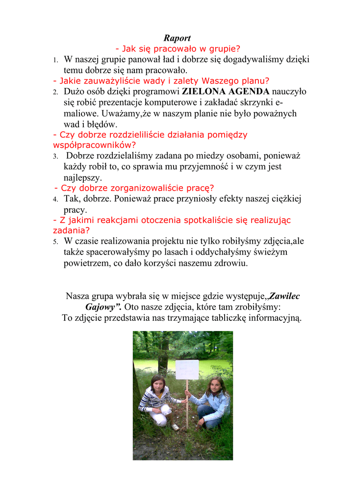 Raport - Jak się pracowało w grupie? 1. W naszej grupie panował ład i dobrze się dogadywaliśmy dzięki temu dobrze się nam pracowało. - Jakie zauważyliście wady i zalety Waszego planu? 2. Dużo osób dzięki programowi ZIELONA AGENDA nauczyło się robić prezentacje komputerowe i zakładać skrzynki emaliowe. Uważamy,że w naszym planie nie było poważnych wad i błędów. - Czy dobrze rozdzieliliście działania pomiędzy współpracowników? 3. Dobrze rozdzielaliśmy zadana po miedzy osobami, ponieważ każdy robił to, co sprawia mu przyjemność i w czym jest najlepszy. - Czy dobrze zorganizowaliście pracę? 4. Tak, dobrze. Ponieważ prace przyniosły efekty naszej ciężkiej pracy. - Z jakimi reakcjami otoczenia spotkaliście się realizując zadania? 5. W czasie realizowania projektu nie tylko robiłyśmy zdjęcia,ale także spacerowałyśmy po lasach i oddychałyśmy świeżym powietrzem, co dało korzyści naszemu zdrowiu. Nasza grupa wybrała się w miejsce gdzie występuje,,Zawilec Gajowy”. Oto nasze zdjęcia, które tam zrobiłyśmy: To zdjęcie przedstawia nas trzymające tabliczkę informacyjną. A to właśnie ta tabliczka jest na niej napis: Nominacja na pomnik przyrody ZAWILEC GAJOWY A na tym zdjęciu sprzątamy śmieci. Udział w tym konkursie sprawił nam wiele przyjemności i zabawy.