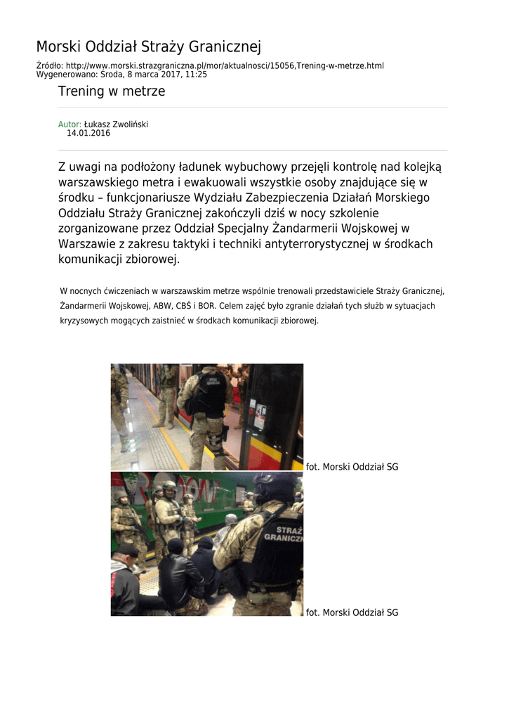 Morski Oddział Straży Granicznej Źródło: http://www.morski.strazgraniczna.pl/mor/aktualnosci/15056,Trening-w-metrze.html Wygenerowano: Środa, 8 marca 2017, 11:25 Trening w metrze Autor: Łukasz Zwoliński 14.01.2016 Z uwagi na podłożony ładunek wybuchowy przejęli kontrolę nad kolejką warszawskiego metra i ewakuowali wszystkie osoby znajdujące się w środku – funkcjonariusze Wydziału Zabezpieczenia Działań Morskiego Oddziału Straży Granicznej zakończyli dziś w nocy szkolenie zorganizowane przez Oddział Specjalny Żandarmerii Wojskowej w Warszawie z zakresu taktyki i techniki antyterrorystycznej w środkach komunikacji zbiorowej. W nocnych ćwiczeniach w warszawskim metrze wspólnie trenowali przedstawiciele Straży Granicznej, Żandarmerii Wojskowej, ABW, CBŚ i BOR. Celem zajęć było zgranie działań tych służb w sytuacjach kryzysowych mogących zaistnieć w środkach komunikacji zbiorowej. fot. Morski Oddział SG fot. Morski Oddział SG