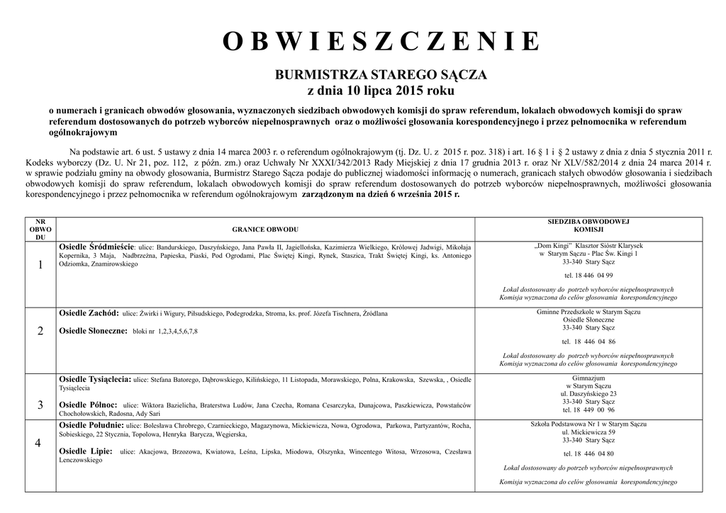 OBWIESZCZENIE BURMISTRZA STAREGO SĄCZA z dnia 10 lipca 2015 roku o numerach i granicach obwodów głosowania, wyznaczonych siedzibach obwodowych komisji do spraw referendum, lokalach obwodowych komisji do spraw referendum dostosowanych do potrzeb wyborców niepełnosprawnych oraz o możliwości głosowania korespondencyjnego i przez pełnomocnika w referendum ogólnokrajowym Na podstawie art. 6 ust. 5 ustawy z dnia 14 marca 2003 r. o referendum ogólnokrajowym (tj. Dz. U. z 2015 r. poz. 318) i art. 16 § 1 i § 2 ustawy z dnia z dnia 5 stycznia 2011 r. Kodeks wyborczy (Dz. U. Nr 21, poz. 112, z późn. zm.) oraz Uchwały Nr XXXI/342/2013 Rady Miejskiej z dnia 17 grudnia 2013 r. oraz Nr XLV/582/2014 z dnia 24 marca 2014 r. w sprawie podziału gminy na obwody głosowania, Burmistrz Starego Sącza podaje do publicznej wiadomości informację o numerach, granicach stałych obwodów głosowania i siedzibach obwodowych komisji do spraw referendum, lokalach obwodowych komisji do spraw referendum dostosowanych do potrzeb wyborców niepełnosprawnych, możliwości głosowania korespondencyjnego i przez pełnomocnika w referendum ogólnokrajowym zarządzonym na dzień 6 września 2015 r. NR OBWO DU GRANICE OBWODU SIEDZIBA OBWODOWEJ KOMISJI ulice: Bandurskiego, Daszyńskiego, Jana Pawła II, Jagiellońska, Kazimierza Wielkiego, Królowej Jadwigi, Mikołaja Kopernika, 3 Maja, Nadbrzeżna, Papieska, Piaski, Pod Ogrodami, Plac Świętej Kingi, Rynek, Staszica, Trakt Świętej Kingi, ks. Antoniego Odziomka, Znamirowskiego „Dom Kingi” Klasztor Sióstr Klarysek w Starym Sączu - Plac Św. Kingi 1 33-340 Stary Sącz Osiedle Śródmieście: 1 tel. 18 446 04 99 Lokal dostosowany do potrzeb wyborców niepełnosprawnych Komisja wyznaczona do celów głosowania korespondencyjnego Osiedle Zachód: 2 Gminne Przedszkole w Starym Sączu Osiedle Słoneczne 33-340 Stary Sącz ulice: Żwirki i Wigury, Piłsudskiego, Podegrodzka, Stroma, ks. prof. Józefa Tischnera, Źródlana Osiedle Słoneczne: bloki nr 1,2,3,4,5,6,7,8 tel. 18 446 04 86 Lokal dostosowany do potrzeb wyborców niepełnosprawnych Komisja wyznaczona do celów głosowania korespondencyjnego Osiedle Tysiąclecia: ulice: Stefana Batorego, Dąbrowskiego, Kilińskiego, 11 Listopada, Morawskiego, Polna, Krakowska, Szewska, , Osiedle Tysiąclecia 3 Osiedle Północ: ulice: Wiktora Bazielicha, Braterstwa Ludów, Jana Czecha, Romana Cesarczyka, Dunajcowa, Paszkiewicza, Powstańców Chochołowskich, Radosna, Ady Sari Osiedle Południe: ulice: Bolesława Chrobrego, Czarnieckiego, Magazynowa, Mickiewicza, Nowa, Ogrodowa, 4 Parkowa, Partyzantów, Rocha, Sobieskiego, 22 Stycznia, Topolowa, Henryka Barycza, Węgierska, Osiedle Lipie: Lenczowskiego ulice: Akacjowa, Brzozowa, Kwiatowa, Leśna, Lipska, Miodowa, Olszynka, Wincentego Witosa, Wrzosowa, Czesława Gimnazjum w Starym Sączu ul. Daszyńskiego 23 33-340 Stary Sącz tel. 18 449 00 96 Szkoła Podstawowa Nr 1 w Starym Sączu ul. Mickiewicza 59 33-340 Stary Sącz tel. 18 446 04 80 Lokal dostosowany do potrzeb wyborców niepełnosprawnych Komisja wyznaczona do celów głosowania korespondencyjnego 5 Środowiskowy Dom Samopomocy w Cyganowicach, Cyganowice 95 33-340 Stary Sącz Osiedle Cyganowice tel. 18 446 04 88 Lokal dostosowany do potrzeb wyborców niepełnosprawnych Komisja wyznaczona do celów głosowania korespondencyjnego 6 Szkoła Podstawowa w Gołkowicach Górnych Gołkowice Górne 65 33-388 Gołkowice Dolne tel 18 446 34 44 Sołectwo Gołkowice Dolne, Sołectwo Gołkowice Górne Lokal dostosowany do potrzeb wyborców niepełnosprawnych Komisja wyznaczona do celów głosowania korespondencyjnego 7 8 Szkoła Podstawowa w Gaboniu Gaboń 67 33-388 Gołkowice Dolne tel. 18 446 32 60 Sołectwo Gaboń Sołectwo Wola Krogulecka Sołectwo Barcice z wyłączeniem Dzielnicy od granicy z Sołectwem Barcice Dolne (od cmentarza drogi powiatowej nr 1530K (Barcice – Wola Krogulecka) i drogi krajowej nr 87 w kierunku szkoły do i rzeki Poprad Zespół Szkół: Szkoła Podstawowa i Gimnazjum w Barcicach Barcice 66 33-342 Barcice tel. 18 446 66 60 Lokal dostosowany do potrzeb wyborców niepełnosprawnych Komisja wyznaczona do celów głosowania korespondencyjnego 9 Sołectwo Przysietnica Zespół Szkół: Szkoła Podstawowa i Gimnazjum w Przysietnicy Przysietnica 152 33-342 Barcice tel. 18 448 00 66 10 Sołectwo Moszczenica Niżna, Sołectwo Moszczenica Wyżna Szkoła Podstawowa w Moszczenicy Moszczenica Niżna 64 33-340 Stary Sącz tel. 18 446 02 96 11 Sołectwo Łazy Biegonickie Sołectwo Myślec WDK w Łazach Biegonickich 33-340 Stary Sącz tel. 18 442 90 66 Lokal dostosowany do potrzeb wyborców niepełnosprawnych Komisja wyznaczona do celów głosowania korespondencyjnego 12 Sołectwo Popowice Szkoła Podstawowa w Popowicach Popowice 115 33-340 Stary Sącz tel. 18 442 95 82 13 Sołectwo Barcice Dolne część Sołectwa Barcice obejmująca Dzielnicę od granicy z Sołectwem Barcice Dolne (od cmentarza) i drogi krajowej nr 87 w kierunku szkoły do drogi powiatowej nr 1530K (Barcice – Wola Krogulecka) i rzeki Poprad Zespół Szkół: Szkoła Podstawowa i Gimnazjum w Barcicach Barcice 66 33-342 Barcice tel. 18 446 66 60 14 Sołectwo Mostki WDK w Mostkach Mostki 86 33-340 Stary Sącz tel. 18 547 66 80 15 Sołectwa: Skrudzina, Gaboń - Praczka Szkoła Podstawowa w Skrudzinie Skrudzina 42 33-388 Gołkowice Dolne tel. 18 446 36 85 Lokale wyborcze będą otwarte w dniu głosowania w godzinach od 6.00 do godz. 22.00 Przed przystąpieniem do głosowania wyborca będzie obowiązany okazać obwodowej komisji wyborczej dowód osobisty lub inny dokument umożliwiający stwierdzenie tożsamości. Wyborca może głosować korespondencyjnie. Zamiar głosowania korespondencyjnego należy zgłosić Burmistrzowi Starego Sącza w terminie do dnia 22 sierpnia 2015 r. W przypadku zgłoszenia przez wyborcę niepełnosprawnego zamiaru głosowania korespondencyjnego, głosowanie za pośrednictwem pełnomocnika jest wyłączone. Wyborca nie
