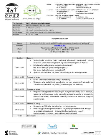 LIDER: STOWARZYSZENIE BIELSKIE CENTRUM PRZEDSIĘBIORCZOŚCI ul. Cieszyńska 367 43-382 Bielsko-Biała tel. 33 496 02 44 e-mail: [email protected] PARTNER: BIELSKIE STOWARZYSZENIE ARTYSTYCZNE TEATR GRODZKI ul. Sempołowskiej 13 43-300 Bielsko-Biała tel. 693 887 115 e-mail: [email protected] PARTNER: MIASTO BIELSKO -BIAŁA - OWES pl. Opatrzności Bożej 18 43-300 Bielsko-Biała tel. 33 497 07 90 e-mail: [email protected] www.owes.bcp.org.pl Tytuł projektu Nr projektu Priorytet Działanie Poddziałanie Partner OWES subregionu południowego WND-RPSL.09.03.01-24-0137/15-001 IX. Włączenie społeczne 9.3. Rozwój ekonomii społecznej w regionie 9.3.1. Wsparcie sektora ekonomii społecznej – konkurs BCP / TG / UM PROGRAM SZKOLENIA Temat Program szkolenia „Tworzenie spółdzielni socjalnej przez podmioty ekonomii społecznej” Trener/ka Waldemar Żbik Stowarzyszenie Bielskie Centrum Przedsiębiorczości; ul. Cieszyńska 367; 43-382 Bielsko-Biała 28-29 września 2015 roku Miejsce Data Godzina Dzień 1 9:30-11:00 11:00-11:15 11:15-12:15 12:15-12:45 12:45-14:15 14:15-14:30 14:30-16:30 16:30 Spółdzielnia socjalna jako podmiot ekonomii społecznej. Istota działania spółdzielni socjalnych. Spółdzielnie socjalne w Polsce. Założyciele i członkowie spółdzielni socjalnej: kto może założyć spółdzielnię socjalną? kto może być członkiem spółdzielni? Specyfika spółdzielni socjalnej zakładanej przez osoby prawne. Przerwa na kawę Istota spółdzielczości socjalnej – warsztaty. Wsparcie dla spółdzielni socjalnych (w tym warsztaty): dotacje na założenie spółdzielni socjalnej (środki unijne, FP. PFRON). Przerwa na lunch Wsparcie dla spółdzielni socjalnych (w tym warsztaty) c.d – dotacje, wsparcie niefinansowe m.in. klauzule społeczne, udział w otwartych konkursach ofert, możliwość realizacji działań w zakresie pożytku publicznego. Przerwa na kawę Wsparcie spółdzielni socjalnych – podsumowanie. Podstawy prawne spółdzielczości socjalnej: podejmowanie decyzji w spółdzielni socjalnej – organy i ich kompetencje, zasady podejmowania uchwał i warunki ważności uchwał. Zakończenie www.owes.bcp.org.pl Godzina 9:00-10:30 10:30-10:45 10:45-12:15 12:15-12:45 12:45-14:15 14:15-14:30 14:30-16:00 16:00 LIDER: STOWARZYSZENIE BIELSKIE CENTRUM PRZEDSIĘBIORCZOŚCI ul. Cieszyńska 367 43-382 Bielsko-Biała tel. 33 496 02 44 e-mail: [email protected] PARTNER: BIELSKIE STOWARZYSZENIE ARTYSTYCZNE TEATR GRODZKI ul. Sempołowskiej 13 43-300 Bielsko-Biała tel. 693 887 115 e-mail: [email protected] PARTNER: MIASTO BIELSKO -BIAŁA - OWES pl. Opatrzności Bożej 18 43-300 Bielsko-Biała tel. 33 497 07 90 e-mail: [email protected] Dzień 2 Podstawy prawne spółdzielczości socjalnej: statut jako kręgosłup działania każdej spółdzielni – omówienie najważniejszych elementów statutu, tworzenie wybranych regulacji statutowych przykładowych spółdzielni. Przerwa na kawę Spółdzielnia socjalna jako przedsiębiorca, pracodawca i podatnik – podstawowe obowiązki spółdzielni i odpowiedzialność członków zarządu. Zakładanie spółdzielni socjalnej osób prawnych krok po kroku . Przerwa na lunch Zakładanie spółdzielni socjalnej osób prawnych krok po kroku c.d. Biznesplan i plan marketingowy jako narzędzia planowania działalności gospodarczej w formie spółdzielni socjalnej: najważniejsze elementy biznes planu. Przerwa na kawę Praca nad koncepcją działania przykładowych spółdzielni (warsztaty). Jak nie zmarnować czasu? Co można zrobić już teraz przygotowując się do założenia spółdzielni? Zakończenie szkolenia