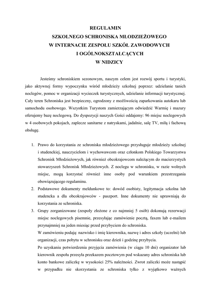 REGULAMIN SZKOLNEGO SCHRONISKA MŁODZIEŻOWEGO W INTERNACIE ZESPOŁU SZKÓŁ ZAWODOWYCH I OGÓLNOKSZTAŁCĄCYCH W NIDZICY Jesteśmy schroniskiem sezonowym, naszym celem jest rozwój sportu i turystyki, jako aktywnej formy wypoczynku wśród młodzieży szkolnej poprzez: udzielanie tanich noclegów, pomoc w organizacji wycieczek turystycznych, udzielanie informacji turystycznej. Cały teren Schroniska jest bezpieczny, ogrodzony z możliwością zaparkowania autokaru lub samochodu osobowego. Wszystkim Turystom zamierzającym odwiedzić Warmię i mazury oferujemy bazę noclegową. Do dyspozycji naszych Gości oddajemy: 96 miejsc noclegowych w 4 osobowych pokojach, zaplecze sanitarne z natryskami, jadalnie, salę TV, miłą i fachową obsługę. 1. Prawo do korzystania ze schroniska młodzieżowego przysługuje młodzieży szkolnej i studenckiej, nauczycielom i wychowawcom oraz członkom Polskiego Towarzystwa Schronisk Młodzieżowych, jak również obcokrajowcom należącym do macierzystych stowarzyszeń Schronisk Młodzieżowych. Z noclegu w schronisku, w razie wolnych miejsc, mogą korzystać również inne osoby pod warunkiem przestrzegania obowiązującego regulaminu. 2. Podstawowe dokumenty meldunkowe to: dowód osobisty, legitymacja szkolna lub studencka a dla obcokrajowców - paszport. Inne dokumenty nie uprawniają do korzystania ze schroniska. 3. Grupy zorganizowane (zespoły złożone z co najmniej 5 osób) dokonują rezerwacji miejsc noclegowych pisemnie, przesyłając zamówienie pocztą, faxem lub e-mailem przynajmniej na jeden miesiąc przed przybyciem do schroniska. W zamówieniu podają: nazwisko i imię kierownika, nazwę i adres szkoły (uczelni) lub organizacji, czas pobytu w schronisku oraz dzień i godzinę przybycia. Po uzyskaniu potwierdzenia przyjęcia zamówienia (w ciągu 10 dni) organizator lub kierownik zespołu przesyła przekazem pocztowym pod wskazany adres schroniska lub konto bankowe zaliczkę w wysokości 25% należności. Zwrot zaliczki może nastąpić w przypadku nie skorzystania ze schroniska tylko z wyjątkowo ważnych i udokumentowanych przyczyn uznanych przez kierownika schroniska, po potrąceniu poniesionych już przez schronisko kosztów. W przypadku nienadesłania zaliczki na 10 dni przed przybyciem do schroniska zespołu wycieczkowego, kierownik schroniska może zamówienie anulować, o czym pisemnie powiadamia organizatora. Zamówienia wycieczek są kwalifikowane według kolejności zgłoszeń, z uwzględnieniem pierwszeństwa dla zespołów młodzieży szkolnej i studenckiej. 4. Turyści indywidualni w grupach poniżej 5 osób mogą być przyjęci na noclegi bezpośrednio w schronisku, jeżeli są wolne miejsca z tym, że pierwszeństwo ma młodzież szkolna i studencka, a następnie inne osoby. 5. Doba w schronisku trwa od godz. 1700 do 1000 dnia następnego. 6. W godz. od 10.00 do 17.00 z pomieszczeń sypialnych korzystają osoby, które wcześniej uregulowały opłatę za pobyt dzienny. 7. Przybywający do schroniska (powinno to nastąpić w godz. 17.00 - 20.00) są wpisywani do książki rejestracyjnej schroniska, zgodnie z obowiązującymi przepisami prawa oraz regulują należne opłaty, według cennika wywieszonego w schronisku w widocznym miejscu. 8. Ze schroniska można korzystać nie dłużej niż przez 3 kolejne noce - chyba, że są wolne miejsca i kierownik schroniska wyrazi zgodę na dłuższy pobyt. 9. Osoby płci męskiej i żeńskiej kwateruje się w oddzielnych pomieszczeniach, przydzielonych przez kierownika schroniska. 10. Osoby, które przebyły chorobę zakaźną, nie mogą w okresie kwarantanny korzystać ze schroniska. 11. Kierownik zespołu wycieczkowego i opiekunowie obowiązani są nocować w schronisku razem z uczestnikami. W przeciwnym wypadku zespół nie może być przyjęty do schroniska. 12. Korzystający z noclegu w schronisku, o ile rezygnują ze schroniskowej bielizny pościelowej muszą być wyposażeni we własną bieliznę pościelową (dwa prześcieradła i poszewkę na poduszkę) lub śpiwór bieliźniany. 13. Nocujący powinni przygotować łóżka do snu przed godz. 21.00 tak, aby można było sprawdzić, czy wszyscy mają bieliznę pościelową lub śpiwór. Bez bielizny pościelowej nie można korzystać z noclegu. 14. Od godziny 2200 do 600 obowiązuje cisza nocna. Turyści, którzy przychodzą późno lub bardzo rano wychodzą ze schroniska, nie powinni zakłócać wypoczynku pozostałym osobom. Odchylenia od ustalonych godzin ciszy nocnej są możliwe tylko w wyjątkowych przypadkach za zgodą kierownika schroniska. 15. Pracownik SSM ze względu na bezpieczeństwo ma prawo odmówić otwarcia obiektu w godzinach od 2300 do 600. 16. Korzystający ze schroniska powinni najpóźniej do godz. 8.00 zasłać łóżka i sprzątnąć pomieszczenia schroniska. 17. Używanie grzałek, kuchenek elektrycznych w Schronisku jest zabronione, jak również przemieszczanie lub przesuwanie wyposażenia w sypialniach. 18. Wszelkie zniszczenia i uszkodzenia przedmiotów stanowiących własność schroniska należy zgłaszać w recepcji schroniska, która ustali wysokość odszkodowania. 19. W schronisku obowiązuje spokojne i uprzejme zachowanie; picie alkoholu, używanie narkotyków, uprawianie gier hazardowych oraz palenie tytoniu w Schronisku jest zabronione. 20. Schronisko nie ponosi odpowiedzialności za przedmioty pozostawione w pokoju oraz za pojazdy zaparkowane przy budynku. 21. Schronisko ponosi odpowiedzialność jedynie za przedmioty wartościowe i pieniądze oddane do depozytu schroniska. 22. W razie przekroczenia regulaminu schroniska lub nieodpowiedniego zachowania, kierownik schroniska (wychowawca dyżurny) jest uprawniony do zatrzymania winnemu legitymacji (uczniowskiej, studenckiej, członkowskiej, dokumentu tożsamości) i usunięcie go ze schroniska z równoczesnym powiadomieniem właściwej szkoły, uczelni lub organizacji. 23. Korzystający ze schroniska mogą wszelkie pozytywne i negatywne uwagi 