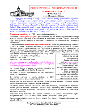OGŁOSZENIA DUSZPASTERSKIE 20 NIEDZIELA ZWYKŁA 14.08.2011 rok www.klemens.beskidy.pl Bóg pyta nas dzisiaj o wiarę. To ona otwiera bramę, przez którą Bóg może wejść do naszego serca. Miejsce żywej wiary zajmuje czasami przyzwyczajenie i rutyna. Bezmyślnie uczyniony znak krzyża, kucnięcie przed Najświętszym Sakramentem, fizyczna obecność w kościele, podczas gdy myśli podążają gdzie indziej. Wiara poganki, o której mówi dzisiejsza Ewangelia, zachwyciła Jezusa: „O niewiasto, wielka jest wiara twoja; niech ci się stanie jak chcesz”. Wiara otwiera serca i pozwala przyjąć Boże dary. Czy wierzysz? Nieszpory niedzielne o 17.30 - serdecznie zapraszamy. Dzisiejsza kolekta jako specjalna przeznaczona jest na dalszy ciąg remontu naszego kościoła. Gorąco polecamy tę sprawę uwadze wszystkich Parafian i Gości. Za wszelkie ofiary składane dziś, składane w kopertach czy wpłacane na konto bankowe - serdeczne „Bóg zapłać”. Jutro obchodzimy uroczystość Wniebowzięcia NMP. Msze św. jak w niedzielę. Msza św. o 10.30 w intencji Ojczyzny i Jej Żołnierzy, po niej wyruszymy pod pomnik za Urzędem Miejskim na uroczystość patriotyczną. Pamiętajmy o wywieszeniu flag narodowych na naszych domach. Po wszystkich mszach św. poświęcać będziemy wianki i zioła. Nieszpory ku czci NMP Wniebowziętej jutro o 17.30 – zapraszamy. Przy drzwiach kościoła jutro kwesta na pomoc dla dotkniętej klęską suszy Afryki. W przyszłą niedzielę We wtorek – św. Stefana Węgierskiego na mszy św. o 9.00 W środę - św. Jacka podziękujemy W sobotę - św. Bernarda, opata Opatrzności Bożej za tegoroczne zbiory z naszych pól, łąk i sadów. Zapraszamy już dziś wszystkich Parafian i Gości. Na Jasnej Górze z piątku na sobotę odbędzie się Ci, którzy po południu czuwanie naszej Diecezji Bielsko-Żywieckiej. będą występowali W piątek o 15.00 nabożeństwo ku czci Miłosierdzia w strojach ludowych Bożego – zapraszamy. proszeni są o taką obecność już na mszy św., oraz Do końca sierpnia w każdą niedzielę o 20.00 o przygotowanie liturgii. odprawiamy mszę św. w języku łacińskim. We wtorek zaczynamy półkolonie – dzieci zgłoszą się o 9.00 na dziedzińcu kościoła. Półkolonie są nieodpłatne. Dzieci otrzymują śniadanie i obiad. Pamiętajmy, że przychodzimy na mszę św. na zaproszenie samego Chrystusa, dlatego zwróćmy naszą uwagę na godny strój w kościele. W ostatnią sobotę sierpnia odbędzie się IV Festyn Parafialny. W zakrystii lub kancelarii można jeszcze składać różnego rodzaju fanty. Sponsorzy mile widziani. Więcej informacji w gazetce festynowej i na plakatach. Zebranie organizatorów w czwartek po wieczornej mszy św. Polecamy prasę katolicką: „Po górach, dolinach...”, w „Gościu niedzielnym” płytka z nagraniem AKATYSTU na cześć NMP; „Źródło”, „Niedziela”, i inne tytuły. Spotkanie przed pielgrzymką do Rzymu, Asyżu, San Giovanni Rotondo i Manopello, we wtorek o 19.00. Konto parafialne: Bank Śląski S.A. O/Ustroń 14 1050 1096 1000 0001 0395 1596