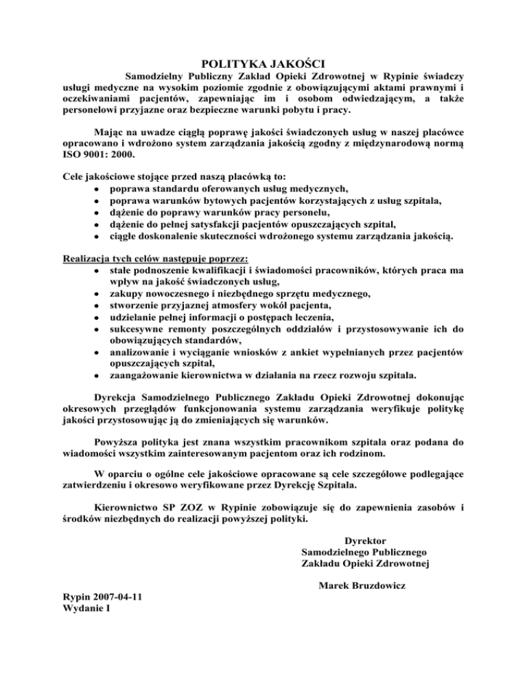 POLITYKA JAKOŚCI Samodzielny Publiczny Zakład Opieki Zdrowotnej w Rypinie świadczy usługi medyczne na wysokim poziomie zgodnie z obowiązującymi aktami prawnymi i oczekiwaniami pacjentów, zapewniając im i osobom odwiedzającym, a także personelowi przyjazne oraz bezpieczne warunki pobytu i pracy. Mając na uwadze ciągłą poprawę jakości świadczonych usług w naszej placówce opracowano i wdrożono system zarządzania jakością zgodny z międzynarodową normą ISO 9001: 2000. Cele jakościowe stojące przed naszą placówką to: poprawa standardu oferowanych usług medycznych, poprawa warunków bytowych pacjentów korzystających z usług szpitala, dążenie do poprawy warunków pracy personelu, dążenie do pełnej satysfakcji pacjentów opuszczających szpital, ciągłe doskonalenie skuteczności wdrożonego systemu zarządzania jakością. Realizacja tych celów następuje poprzez: stałe podnoszenie kwalifikacji i świadomości pracowników, których praca ma wpływ na jakość świadczonych usług, zakupy nowoczesnego i niezbędnego sprzętu medycznego, stworzenie przyjaznej atmosfery wokół pacjenta, udzielanie pełnej informacji o postępach leczenia, sukcesywne remonty poszczególnych oddziałów i przystosowywanie ich do obowiązujących standardów, analizowanie i wyciąganie wniosków z ankiet wypełnianych przez pacjentów opuszczających szpital, zaangażowanie kierownictwa w działania na rzecz rozwoju szpitala. Dyrekcja Samodzielnego Publicznego Zakładu Opieki Zdrowotnej dokonując okresowych przeglądów funkcjonowania systemu zarządzania weryfikuje politykę jakości przystosowując ją do zmieniających się warunków. Powyższa polityka jest znana wszystkim pracownikom szpitala oraz podana do wiadomości wszystkim zainteresowanym pacjentom oraz ich rodzinom. W oparciu o ogólne cele jakościowe opracowane są cele szczegółowe podlegające zatwierdzeniu i okresowo weryfikowane przez Dyrekcję Szpitala. Kierownictwo SP ZOZ w Rypinie zobowiązuje się do zapewnienia zasobów i środków niezbędnych do realizacji powyższej polityki. Dyrektor Samodzielnego Publicznego Zakładu Opieki Zdrowotnej Marek Bruzdowicz Rypin 2007-04-11 Wydanie I