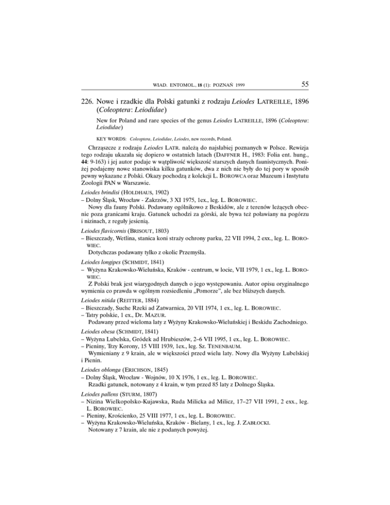 WIAD. ENTOMOL., 18 (1): POZNAŃ 1999 55 226. Nowe i rzadkie dla Polski gatunki z rodzaju Leiodes LATREILLE, 1896 (Coleoptera: Leiodidae) New for Poland and rare species of the genus Leiodes LATREILLE, 1896 (Coleoptera: Leiodidae) KEY WORDS: Coleoptera, Leiodidae, Leiodes, new records, Poland. Chrząszcze z rodzaju Leiodes LATR. należą do najsłabiej poznanych w Polsce. Rewizja tego rodzaju ukazała się dopiero w ostatnich latach (DAFFNER H., 1983: Folia ent. hung., 44: 9-163) i jej autor podaje w wątpliwość większość starszych danych faunistycznych. Poniżej podajemy nowe stanowiska kilku gatunków, dwa z nich nie były do tej pory w sposób pewny wykazane z Polski. Okazy pochodzą z kolekcji L. B OROWCA oraz Muzeum i Instytutu Zoologii PAN w Warszawie. Leiodes brindisi (HOLDHAUS, 1902) – Dolny Śląsk, Wrocław - Zakrzów, 3 XI 1975, 1ex., leg. L. BOROWIEC . Nowy dla fauny Polski. Podawany ogólnikowo z Beskidów, ale z terenów leżących obecnie poza granicami kraju. Gatunek uchodzi za górski, ale bywa też poławiany na pogórzu i nizinach, z reguły jesienią. Leiodes flavicornis (BRISOUT , 1803) – Bieszczady, Wetlina, stanica koni straży ochrony parku, 22 VII 1994, 2 exx., leg. L. BOROWIEC. Dotychczas podawany tylko z okolic Przemyśla. Leiodes longipes (SCHMIDT, 1841) – Wyżyna Krakowsko-Wieluńska, Kraków - centrum, w locie, VII 1979, 1 ex., leg. L. BOROWIEC. Z Polski brak jest wiarygodnych danych o jego występowaniu. Autor opisu oryginalnego wymienia co prawda w ogólnym rozsiedleniu „Pomorze”, ale bez bliższych danych. Leiodes nitida (REITTER , 1884) – Bieszczady, Suche Rzeki ad Zatwarnica, 20 VII 1974, 1 ex., leg. L. BOROWIEC . – Tatry polskie, 1 ex., Dr. MAZUR. Podawany przed wieloma laty z Wyżyny Krakowsko-Wieluńskiej i Beskidu Zachodniego. Leiodes obesa (SCHMIDT, 1841) – Wyżyna Lubelska, Gródek ad Hrubieszów, 2–6 VII 1995, 1 ex., leg. L. BOROWIEC . – Pieniny, Trzy Korony, 15 VIII 1939, 1ex., leg. Sz. TENENBAUM. Wymieniany z 9 krain, ale w większości przed wielu laty. Nowy dla Wyżyny Lubelskiej i Pienin. Leiodes oblonga (ERICHSON , 1845) – Dolny Śląsk, Wrocław - Wojnów, 10 X 1976, 1 ex., leg. L. BOROWIEC . Rzadki gatunek, notowany z 4 krain, w tym przed 85 laty z Dolnego Śląska. Leiodes pallens (STURM , 1807) – Nizina Wielkopolsko-Kujawska, Ruda Milicka ad Milicz, 17–27 VII 1991, 2 exx., leg. L. BOROWIEC . – Pieniny, Krościenko, 25 VIII 1977, 1 ex., leg. L. BOROWIEC . – Wyżyna Krakowsko-Wieluńska, Kraków - Bielany, 1 ex., leg. J. Z ABŁOCKI. Notowany z 7 krain, ale nie z podanych powyżej. 56 KRÓTKIE DONIESIENIA Leiodes strigipenne (DAFFNER, 1983) – Pieniny, Dolina Pienińskiego potoku, 25 VIII 1977, 1 ex., leg. L. BOROWIEC . Niedawno opisany gatunek, nowy dla fauny Polski. Lech B OROWIEC, Wrocław (Polska) Jan COOTER, Hereford (Wielka Brytania) 227. Nowe stanowisko Sympetrum fonscolombii (SÉLYS, 1840) (Odonata: Libellulidae) na Pojezierzu Pomorskim New record of Sympetrum fonscolombii (SÉLYS , 1840) (Odonata: Libellulidae) from the Pomeranian Lakeland KEY WORDS: Odonata, Libellulidae, Sympetrum fonscolombii, larva, record, Poland. Sympetrum fonscolombii (SÉL.) jest gatunkiem śródziemnomorskim, w Polsce osiągającym północną granicę areału. W polskich warunkach klimatycznych jest allochtonem, nie tworzącym trwałych populacji ze względu na surową zimę. Źródłem znajdowanych co pewien czas populacji jest migracja. Osobniki zaleciałe do Polski, pierwsza generacja (łowiona wiosną) rozmnażają się jednak, czego dowodzą odłowy larw i imagines drugiej generacji (lato i jesień). W trakcie badań prowadzonych w 1998 roku na Pojezierzu Pomorskim stwierdzono nowe stanowisko S. fonscolombii: – 4,5 km na zachód od wsi Załom, 53°06' N, 16°01' E, UTM: WU67, rów wypływający z osuszonego torfowiska niskiego, szerokość 40–50 cm, głębokość 5–10 cm, woda przejrzysta, nurt wolny, dno piaszczysto-muliste, roślinność: trawy, turzyce, nielicznie rzęsa, 26 VI 1998, 1 larwa w próbie zebranej czerpakiem hydrobiologicznym, razem z larwą S. vulgatum (L.). W Polsce znanych było dotychczas 16 stanowisk S. fonscolombii, położonych przeważnie na południu kraju. Na północy kraju znajdowano go na Mazurach (Kłębowo, Ełk) i Pomorzu (okolice Szczecina). Wykazano go też z Polski środkowo-wschodniej, Puszczy Kampinoskiej, Wielkopolskiego P. N. i Poznania. Stanowisko podane w niniejszej pracy jest drugim w Polsce, obok Wielkopolskiego P. N. (MIELEWCZYK 1966: Pr. Monograf. Przyr. Wielkop. Parku Nar., 4, 3: 57-93.) i najdalej wysuniętym na północ, na którym stwierdzono larwę omawianego gatunku. Wykazanie larw na Pojezierzach: Pomorskim i Wielkopolskim, jak też odłów w Poznaniu młodego imago drugiej generacji (BERNARD 1997: Notul. odonatol., 4, 10: 159-160.), uprawdopodobnia kwestionowane przez J. URBAŃSKIEGO (U RBAŃSKI 1948: Ann. UMCS, C, 3, 11: 289-317.) dane ze Szczecina i Ełku. Obserwacje czynione ostatnio w Europie Środkowej wskazują na poszerzanie się areału S. fonscolombii ku północy. W niektóre lata odnotowuje się liczne i o dużym zasięgu inwazje: obserwowana w 1996 r. osiągnęła 54° N szerokości geograficznej (LEMPERT 1997: Libellula, 16, 3/4: 143-168.). Można więc założyć, że przy odpowiednio ukierunkowanej penetracji terenu może pojawić się więcej informacji o występowaniu tego bardzo interesującego gatunku w naszym kraju. Przy poszukiwaniach należy zwrócić szczególną uwagę na takie środowiska, jak: płytkie stawy, drobne zbiorniki (zwłaszcza w piaskowniach i żwirowniach) oraz stagnujące rowy melioracyjne. Warto też zbierać larwy i wylinki, które ze względu na charakterystyczny wygląd (brak kolców grzbietowych) są łatwe do oznaczenia. Paweł BUCZYŃSKI, Lublin Stanisław CZACHOROWSKI, Olsztyn
