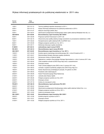 Wykaz informacji przekazanych do publicznej wiadomości w 2011 roku Numer raportu Data publikacji 1/2011 2011-01-13 Terminy publikacji raportów okresowych w 2011 r. 2/2011 2011-01-13 Wykaz informacji przekazanych do publicznej wiadomości w 2010 r. 3/2011 2011-01-27 Nabycie znacznego pakietu akcji 4/2011 2011-02-07 Zakończenie postępowania likwidacyjnego wobec spółki zaleŜnej Metalplast Karo Sp. o.o. QSr4/2010 2011-02-09 Skonsolidowany raport kwartalny QSr 4/2010 5/2011 2011-02-09 Prognoza wyników finansowych na 2011 rok 6/2011 2011-02-15 Otrzymanie przez spółkę zaleŜną nowego zezwolenia na prowadzenie działalności w SSE 7/2011 2011-02-22 Wyrejestrowanie spółki zaleŜnej EURL ALUPROF ALG 8/2011 2011-03-30 Wstępna prognoza wyników za I kw. 2011 r. 9/2011 2011-04-11 Deklaracja dotycząca wypłaty dywidendy R 20010 2011-04-14 Jednostkowy raport roczny R 2010 RS 2010 2011-04-14 Skonsolidowany raport roczny RS 2010 QSr1/2011 2011-04-20 Skonsolidowany raport kwartalny za 1 kw. 2011 r. 10/2011 2011-04-20 Korekta raportu kwartalnego skonsolidowanego QSr z dnia 20 kwietnia 2011 r. 11/2011 2011-04-21 Rekomendacja Zarządu dotycząca wypłaty dywidendy 12/2011 2011-05-04 Zamierzone zmiany w Statucie Spółki 13/2011 2011-05-04 Ogłoszenie o zwołaniu Zwyczajnego Walnego Zgromadzenia w dniu 2 czerwca 2011 roku 14/2011 2011-05-04 Treść projektów uchwał na ZWZ Grupy Kęty wraz z uzasadnieniami 15/2011 2011-05-24 Znacząca umowa 16/2011 2011-06-03 Treść uchwał podjętych przez ZWZ w dniu 2 czerwca 2011 roku 17/2011 2011-06-03 Uchwała o wypłacie dywidendy podjęta przez ZWZ Grupy Kęty S.A. Wykaz akcjonariuszy posiadających powyŜej 5% głosów na ZWZ temat 18/2011 2011-06-03 19/2011 2011-06-03 Powołanie osób nadzorujących 20/2011 2011-06-09 Wybór Przewodniczącego Rady Nadzorczej 21/2011 2011-06-27 Jednolity tekst Statutu Spółki 22/2011 2011-06-28 Wstępna prognoza wyników za II kw. 2011 23/2011 2011-07-05 Znacząca umowa 24/2011 2011-07-19 Aneksy do znaczących umów PSr2011 2011-08-10 Skonsolidowany raport półroczny PSr 2010 25/2011 2011-08-22 Znacząca umowa 26/2011 2011-09-06 Zakończenie postępowania likwidacyjnego wobec spółki zaleŜnej Celtech Sp. z o.o. 27/2011 2011-09-28 Wstępna prognoza wyników za III kw. 2011 r. 28/2011 2011-10-03 Aneks do znaczącej umowy QSr 3/2011 2011-10-26 Skonsolidowany raport kwartalny QSr 3/2011 29/2011 2011-10-26 Korekta prognozy wyników na 2011 r. 30/2011 2011-10-31 Znacząca umowa 31/2011 2011-12-22 Wstępna prognoza wyników za IV kw. 2011 r.
